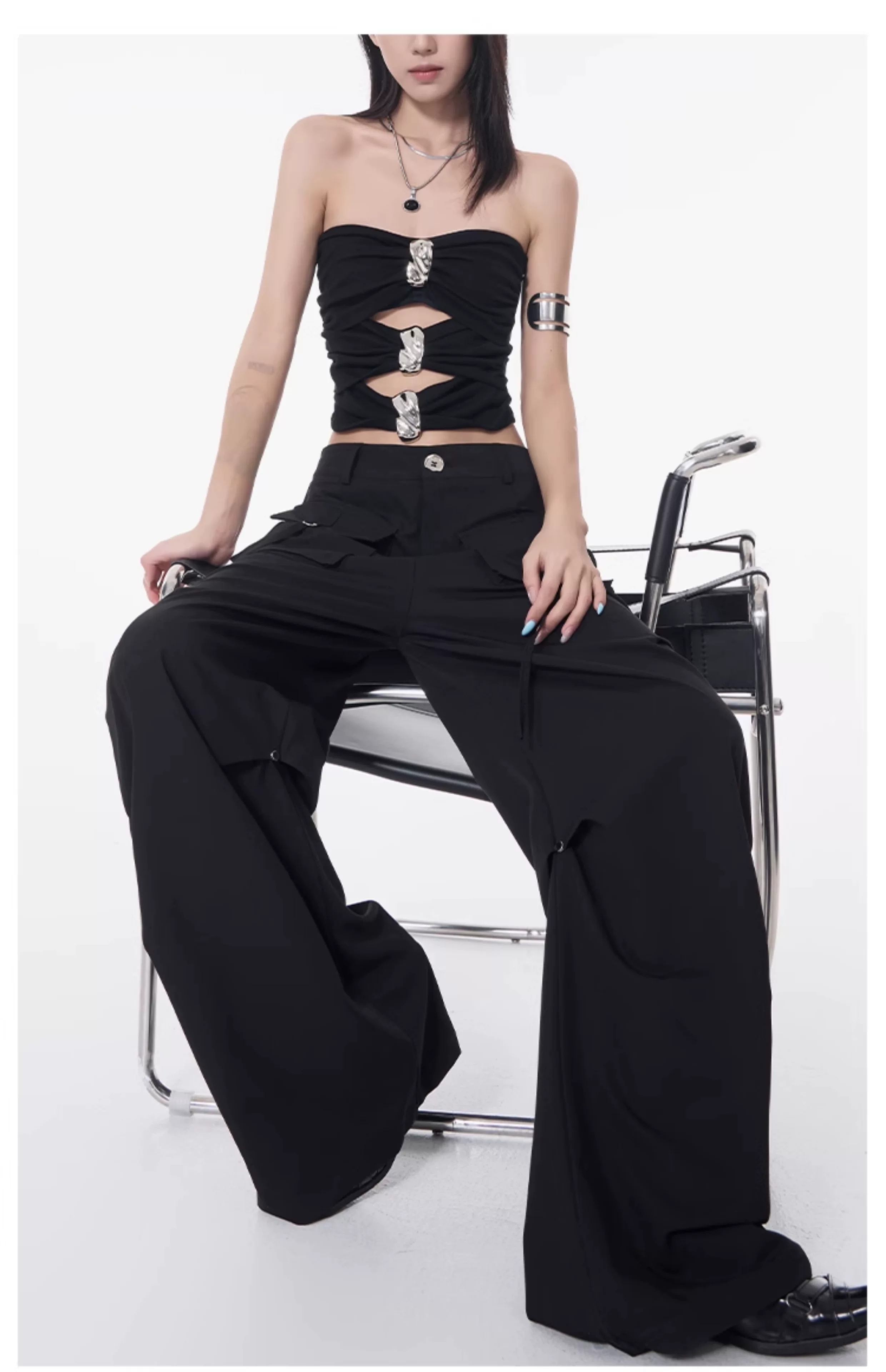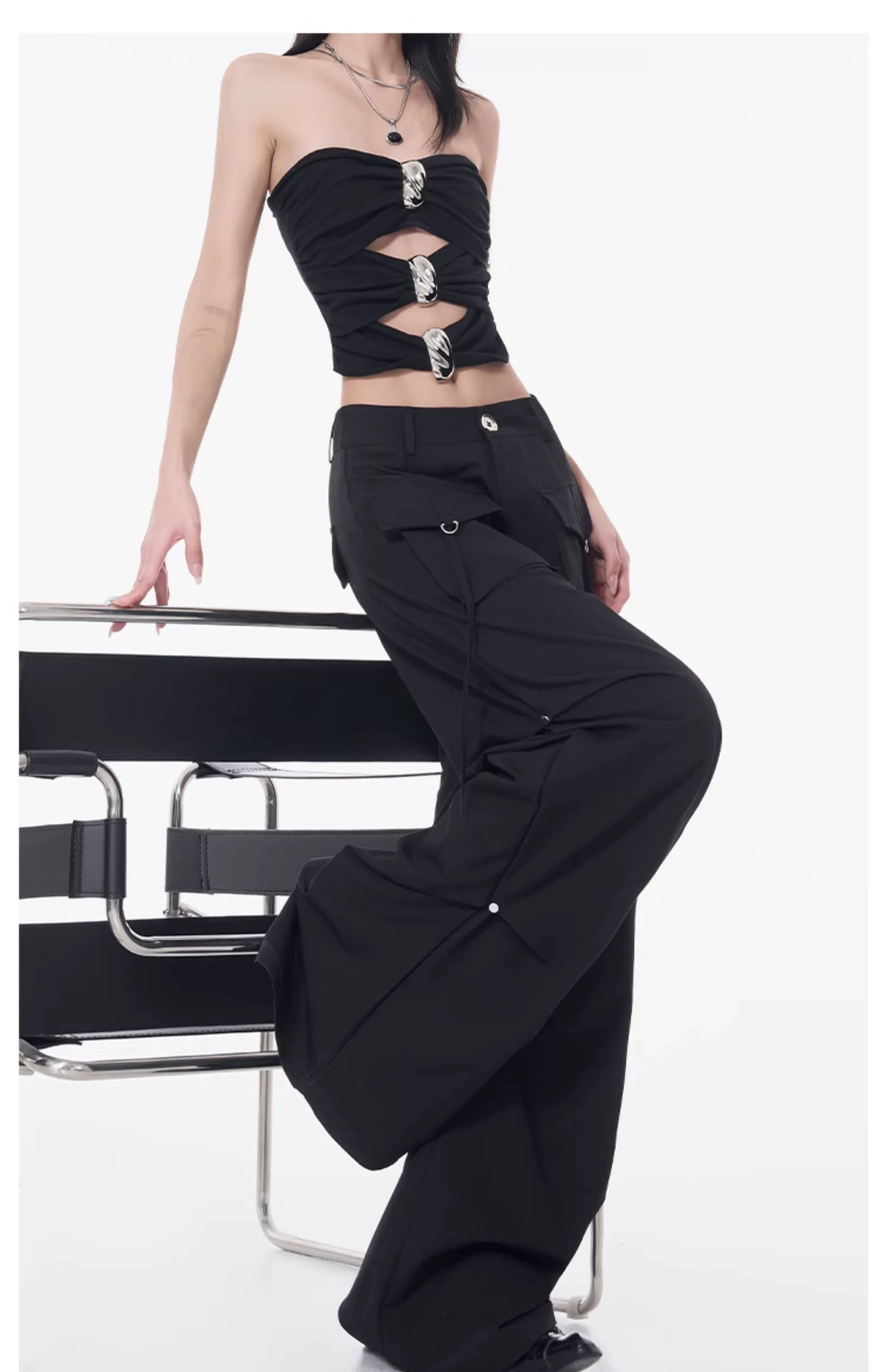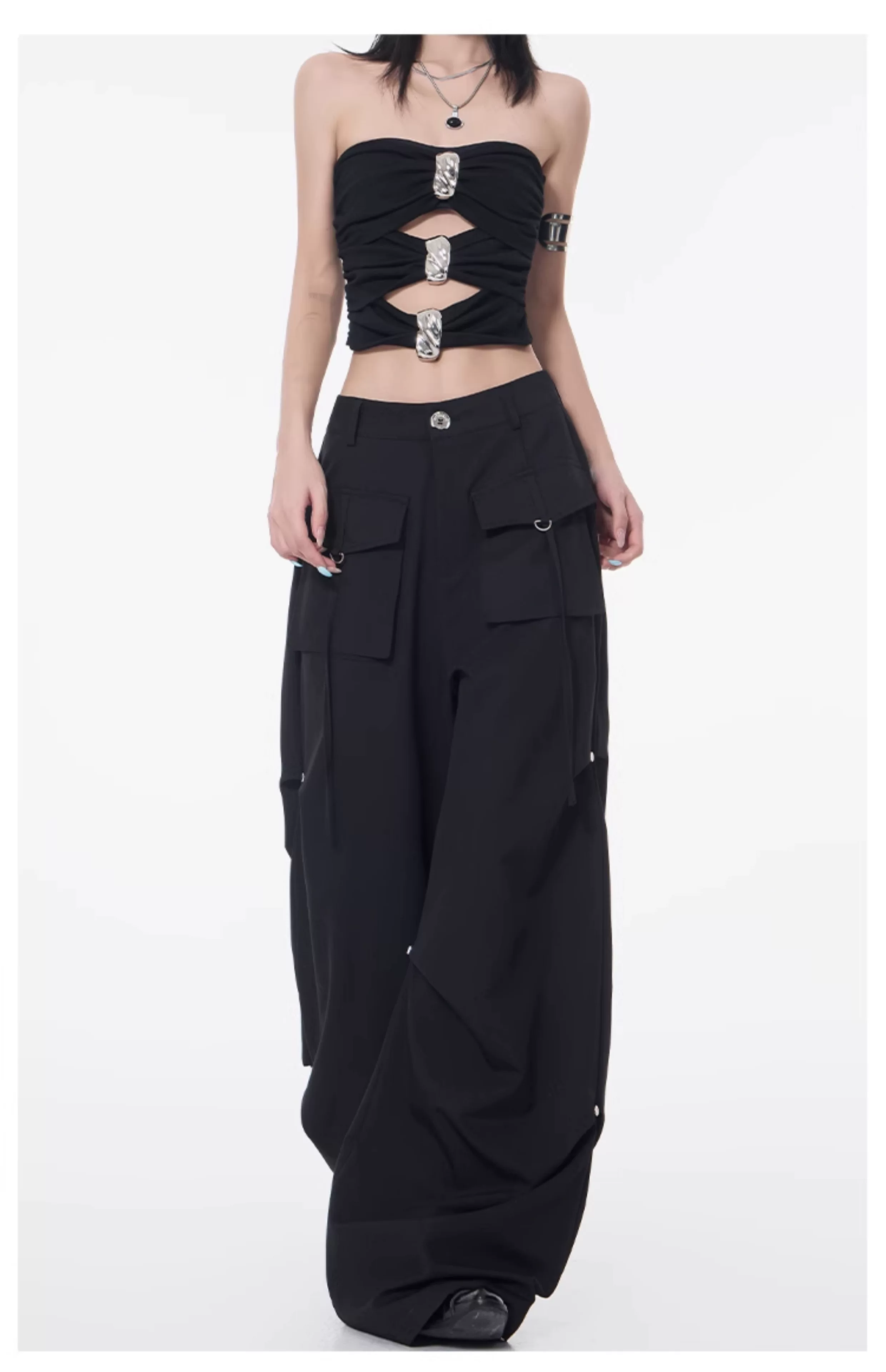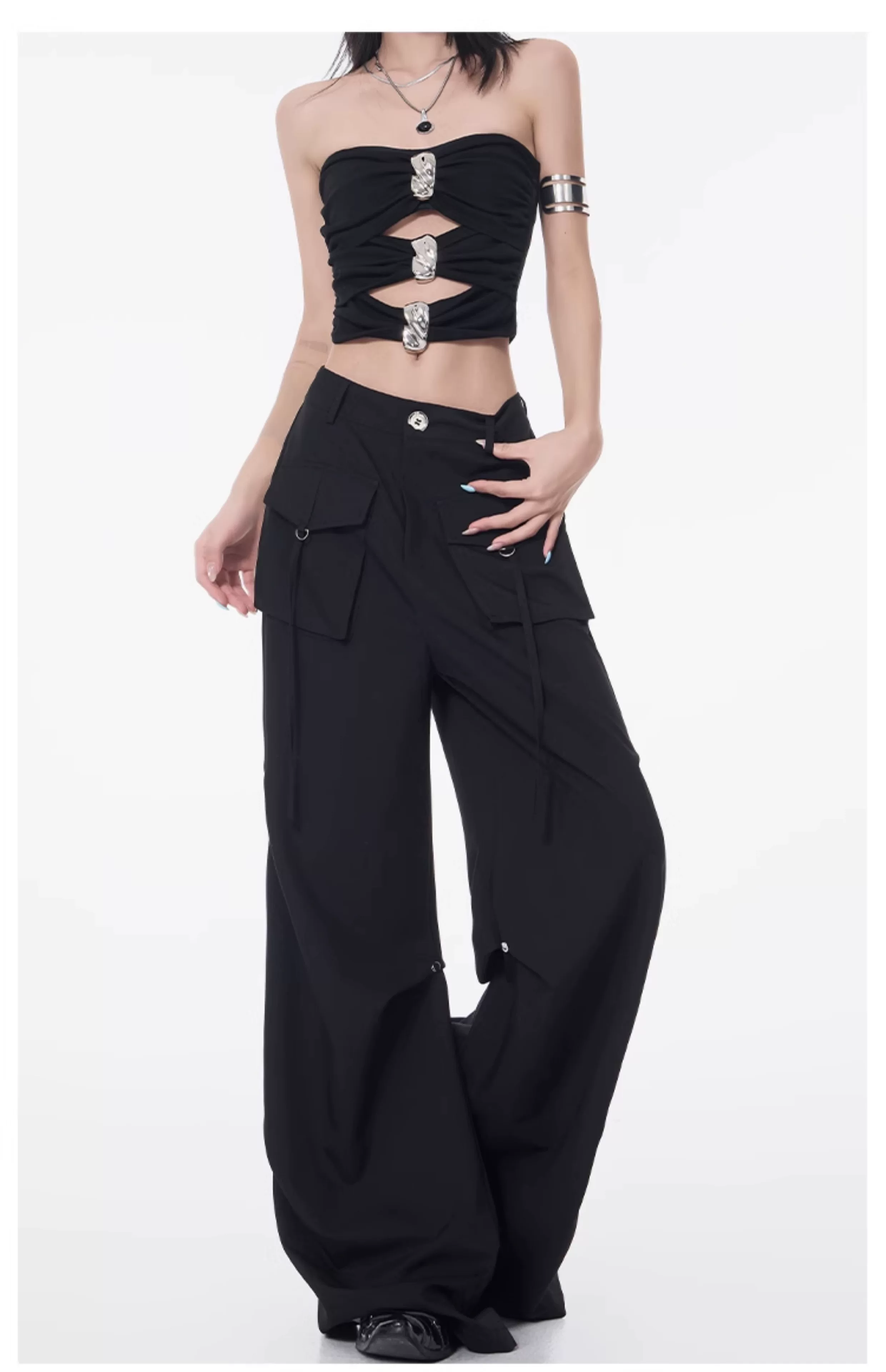 Quần cargo xếp ly màu đen phong cách đường phố KEN STUDIO dành cho nữ, quần dài dáng rộng lưng cao mới mùa hè