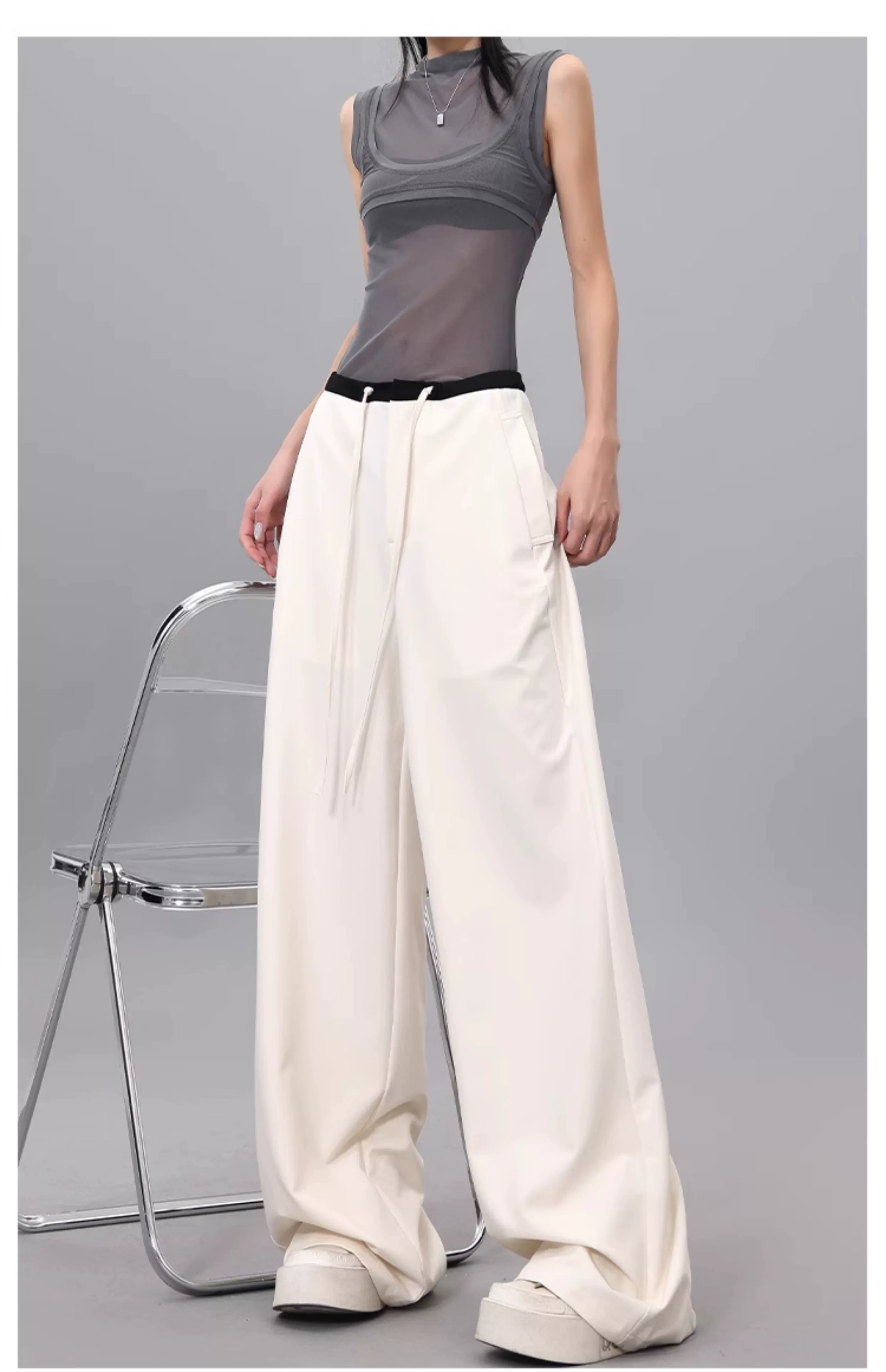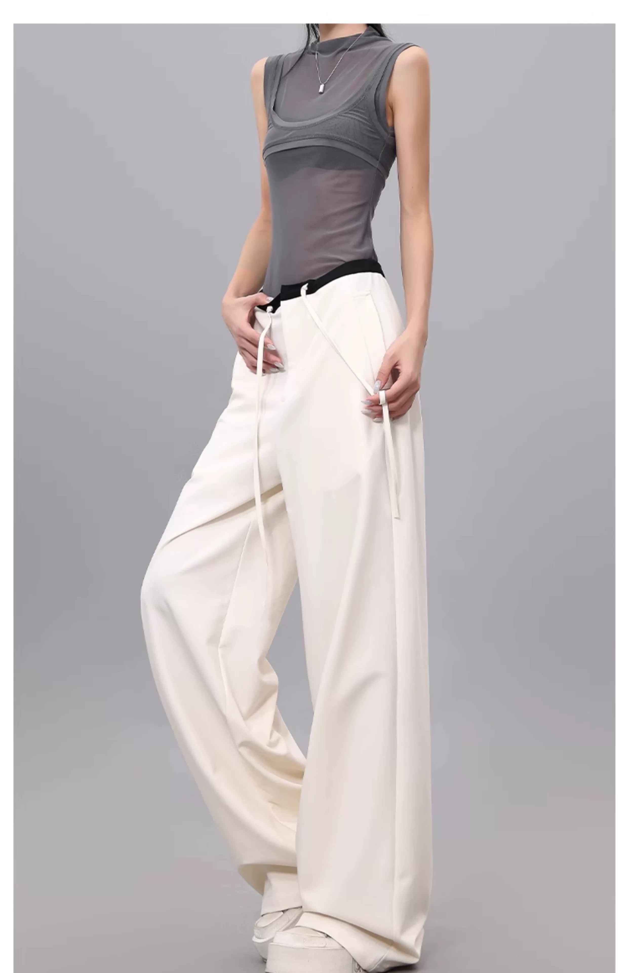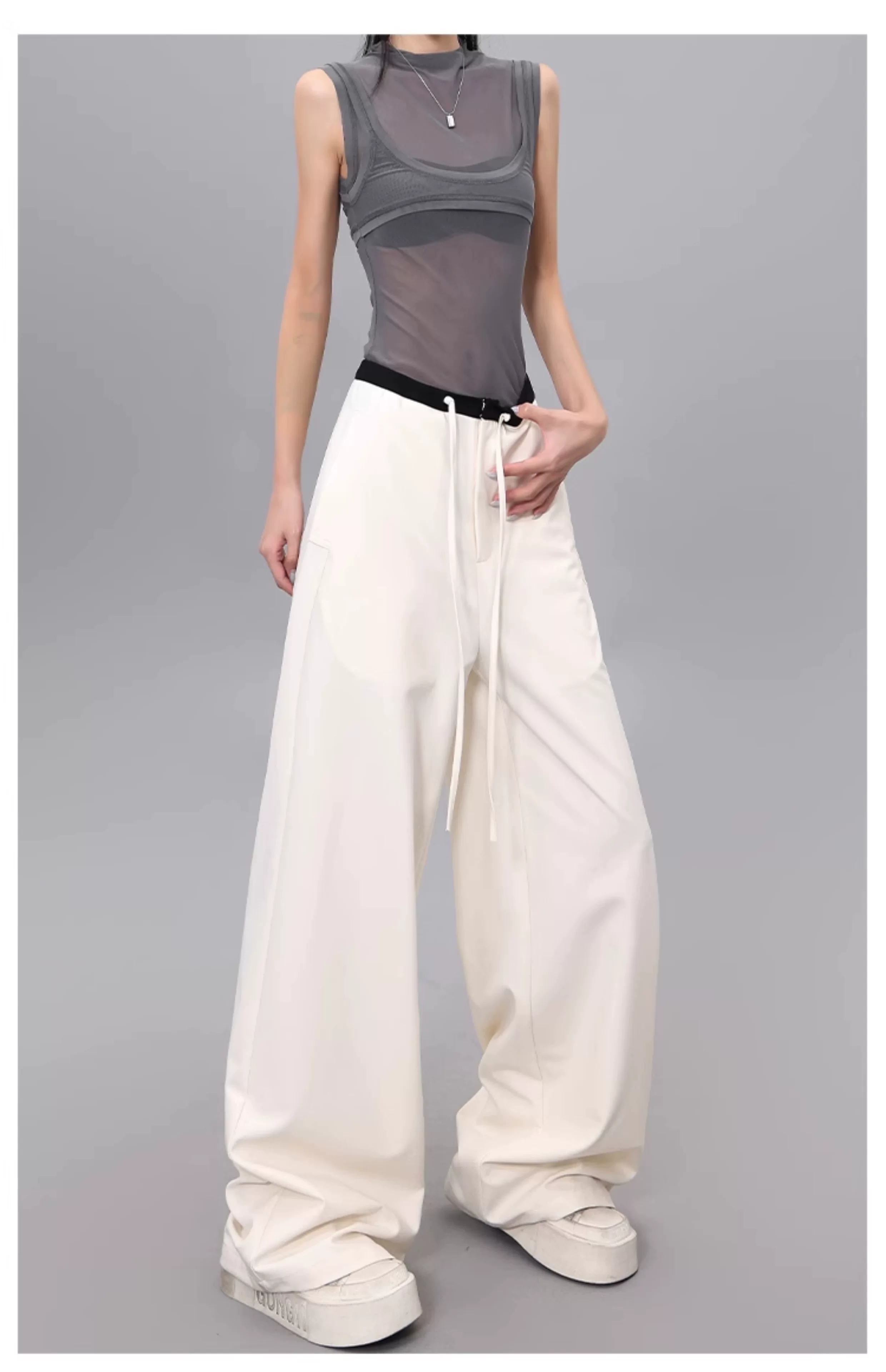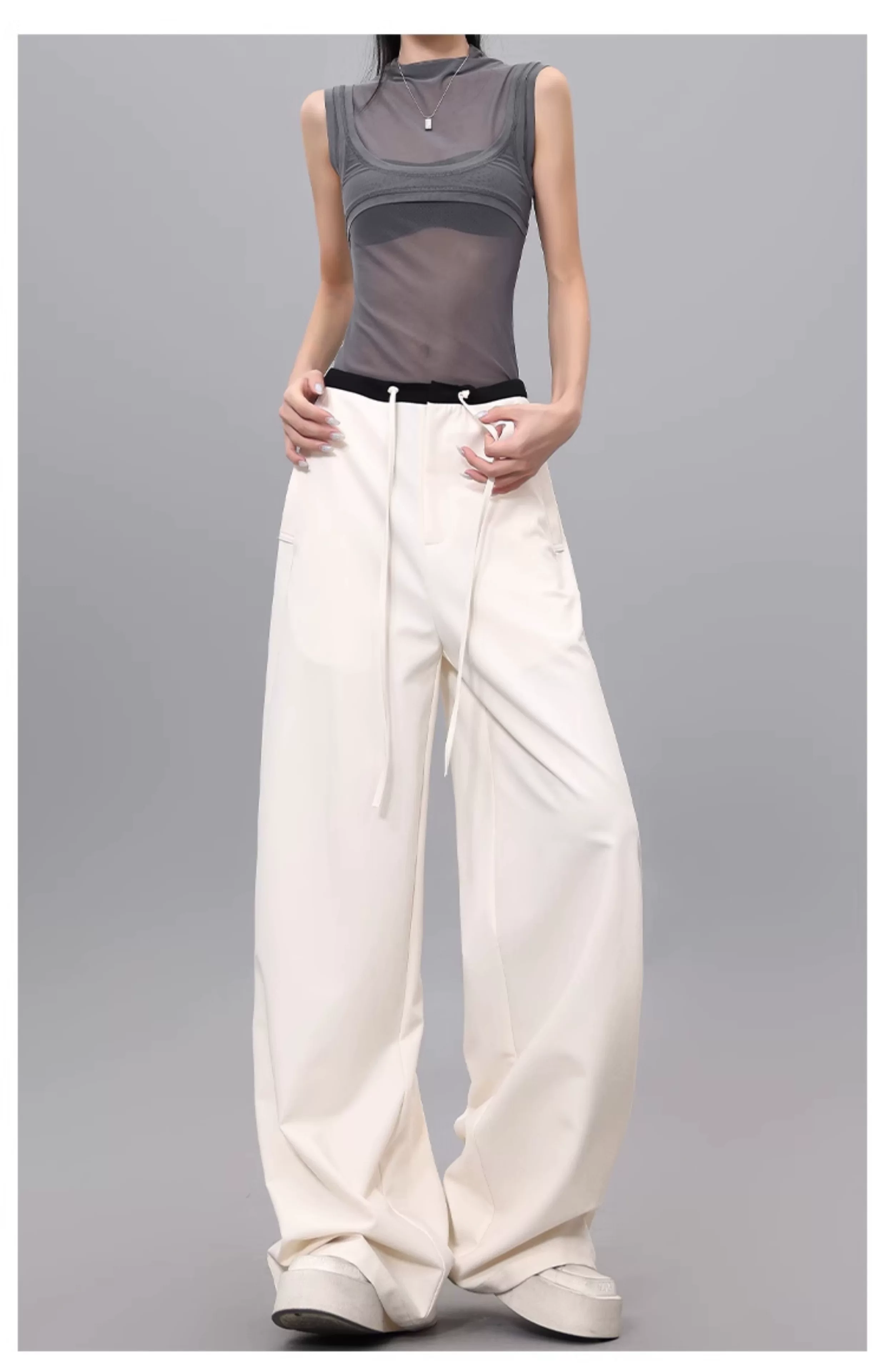 - Quần dài dây rút phối màu KEN STUDIO dành cho nữ, phong cách mùa hè mới, đa năng, dáng rộng, dáng rộng, quần ống rộng