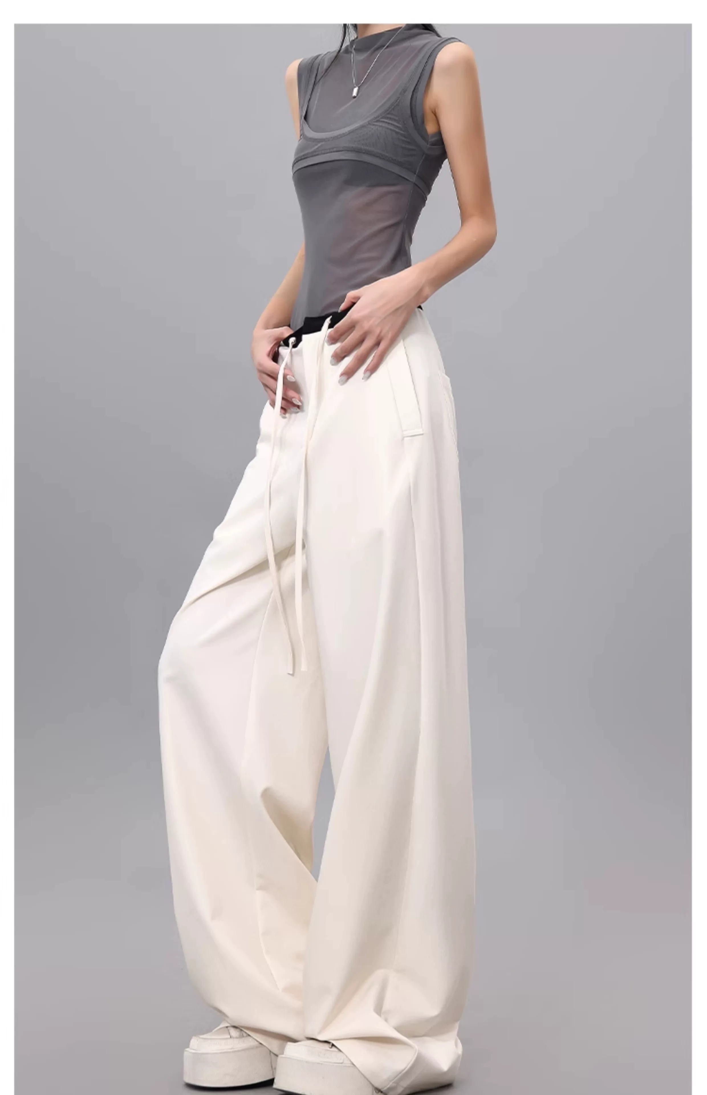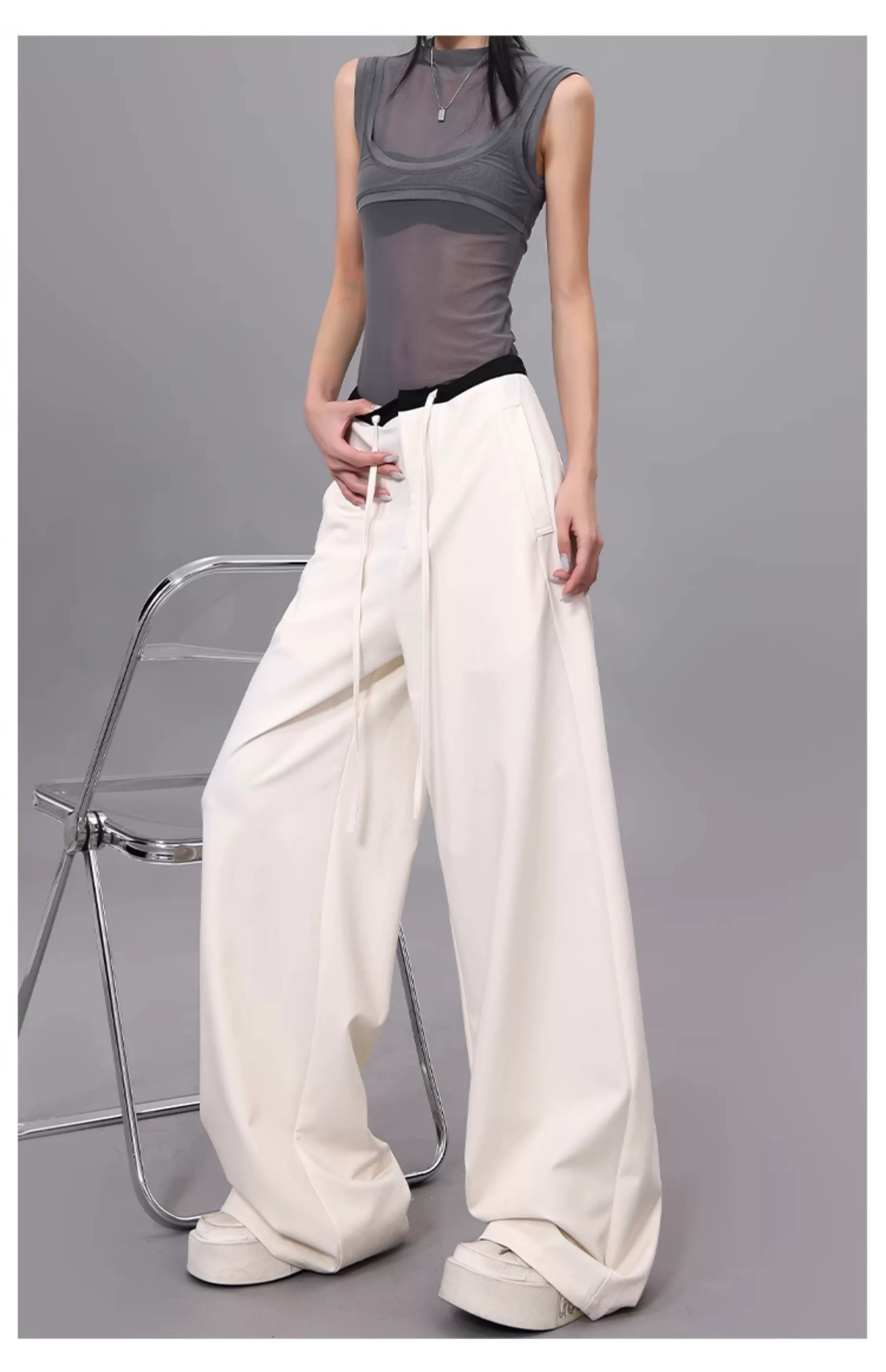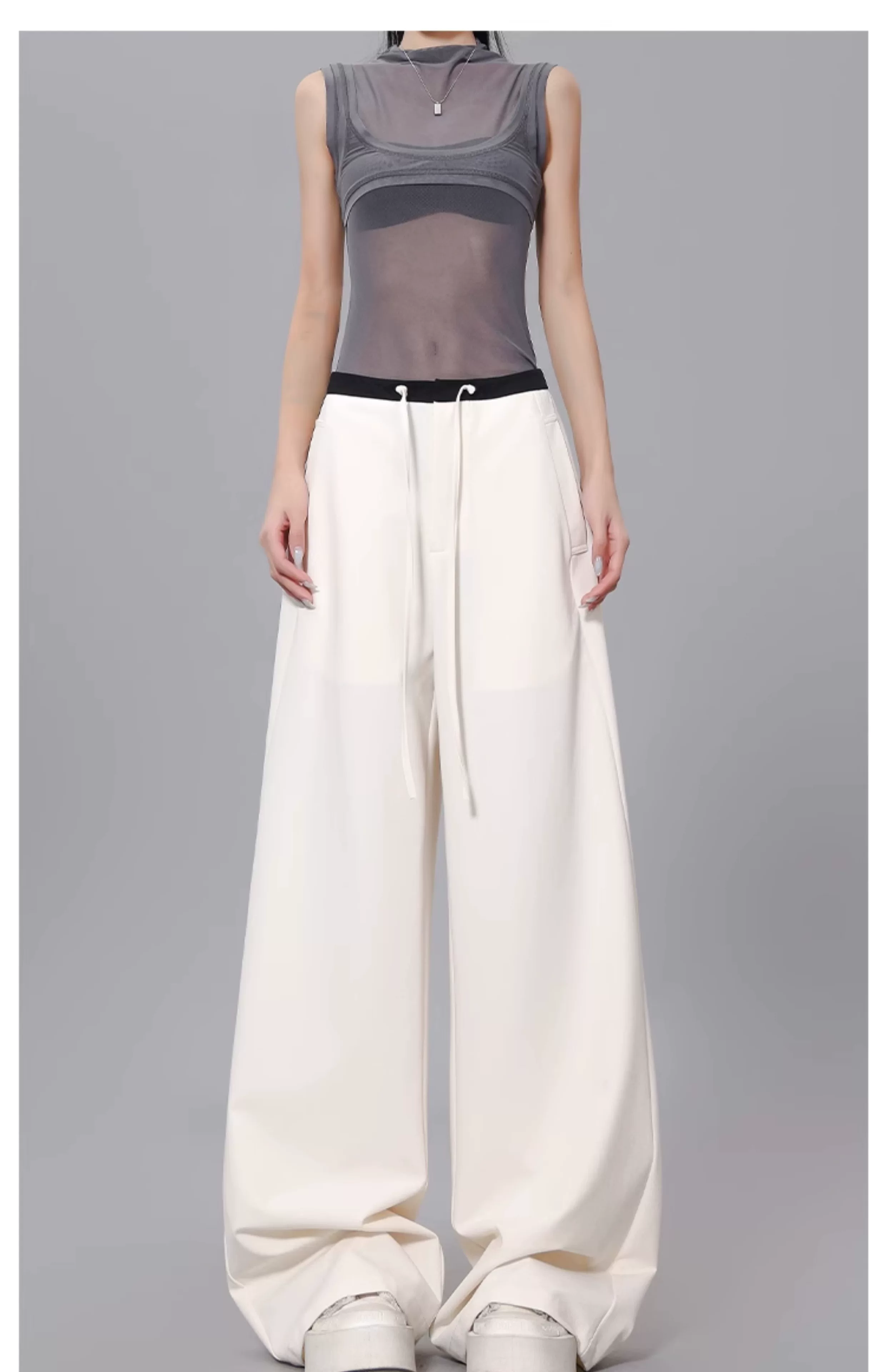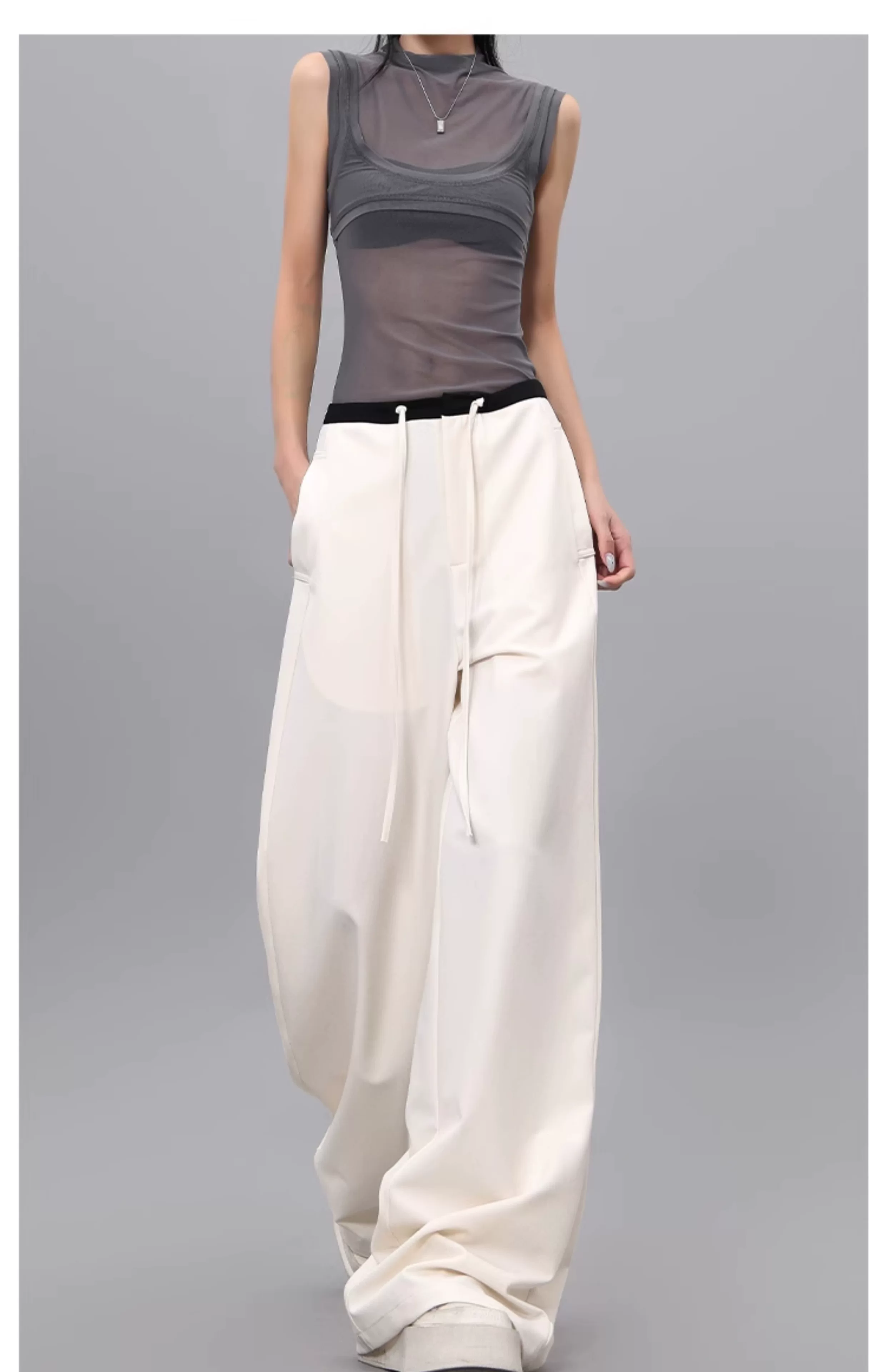 - Quần dài dây rút phối màu KEN STUDIO dành cho nữ, phong cách mùa hè mới, đa năng, dáng rộng, dáng rộng, quần ống rộng