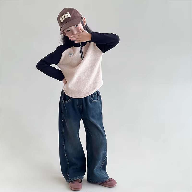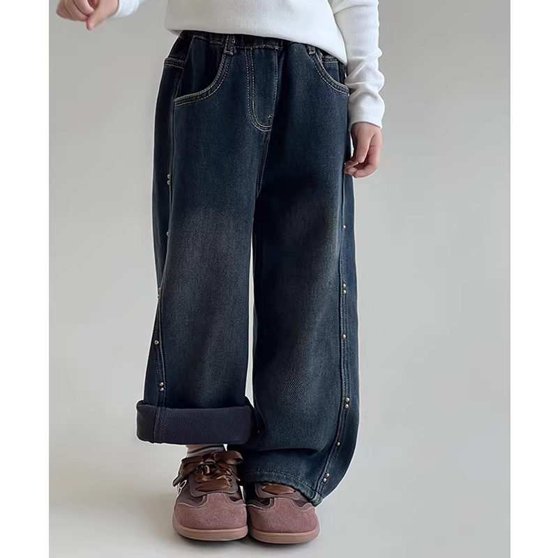 Quần denim lót lông cừu cho bé gái, phong cách mùa đông, quần lót lông cừu thường ngày cho trẻ em, quần dài ống rộng thẳng cho trẻ lớn.