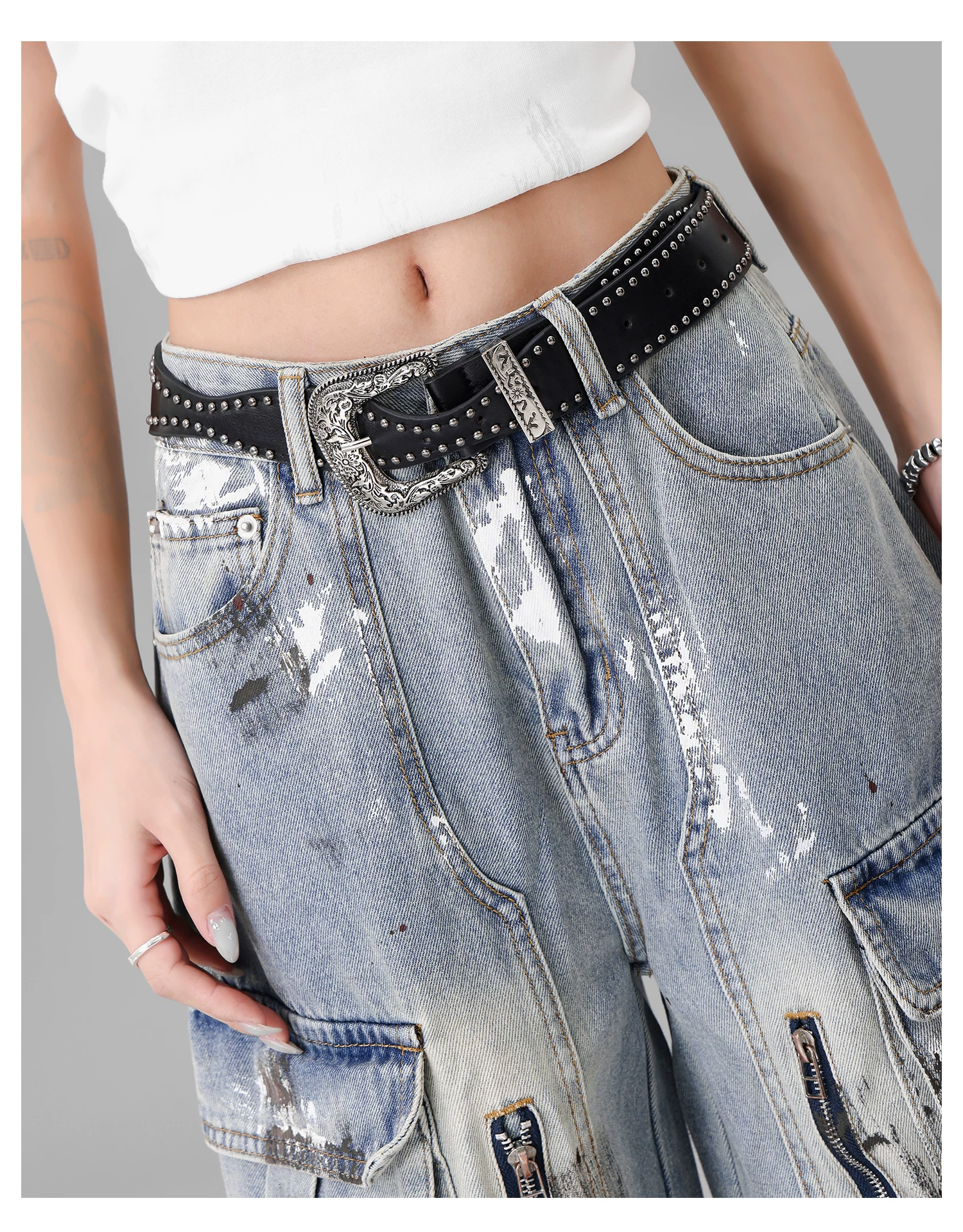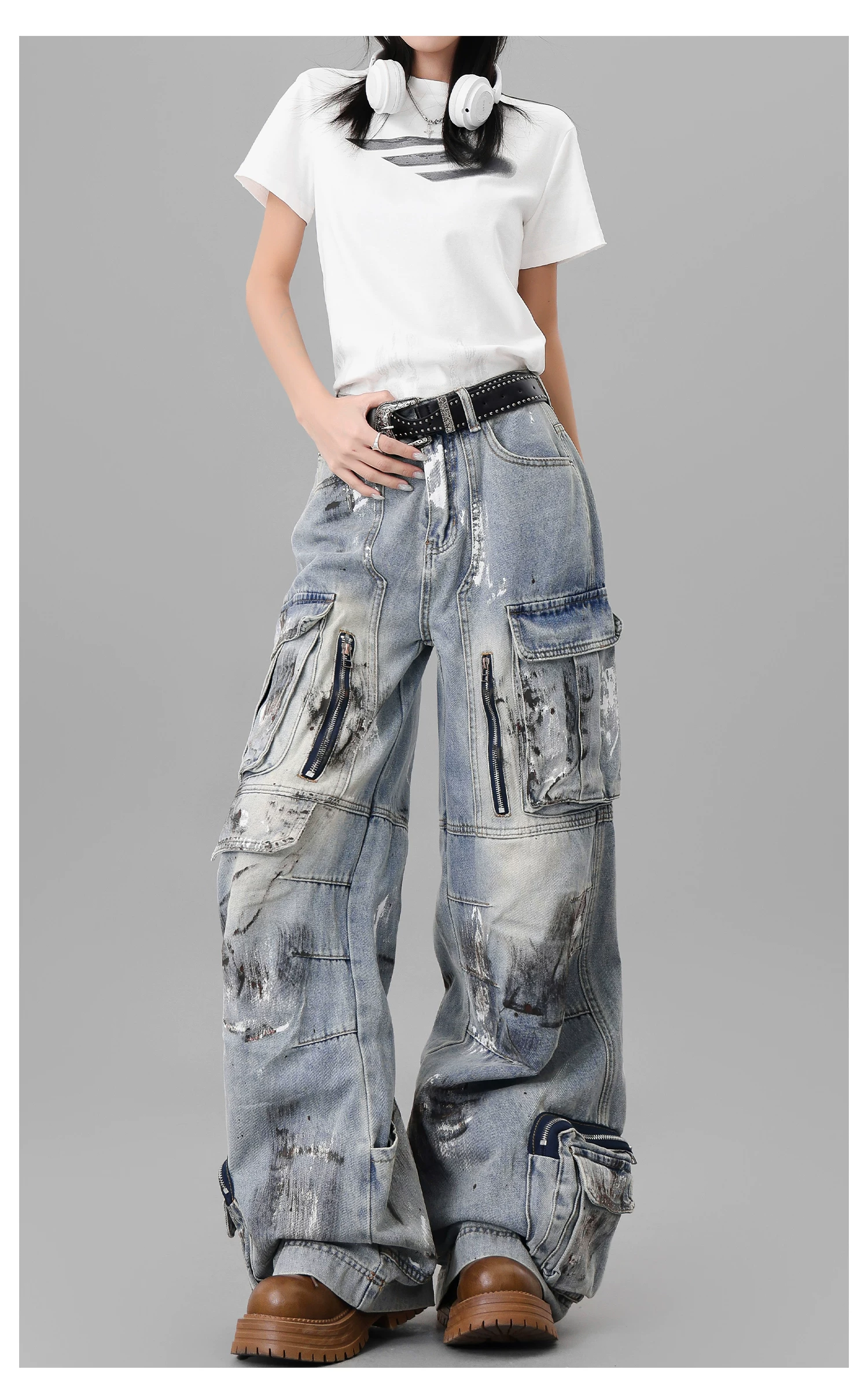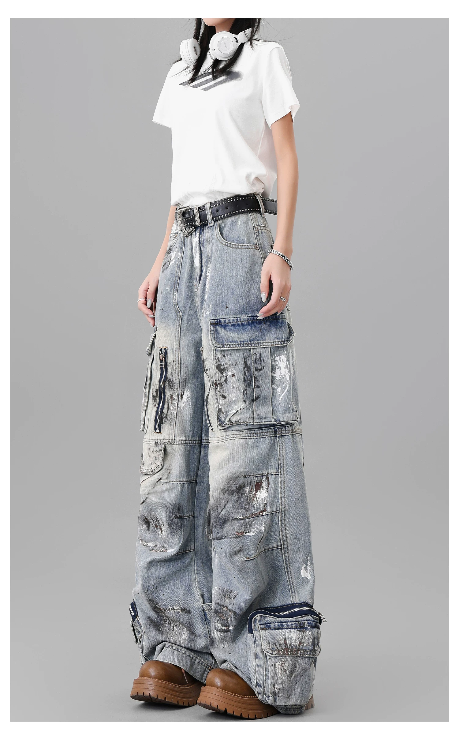 Quần jean công sở thiết kế nhiều túi sơn kiểu cổ điển của KEN STUDIO dành cho nữ, quần ống rộng lưng cao mùa hè