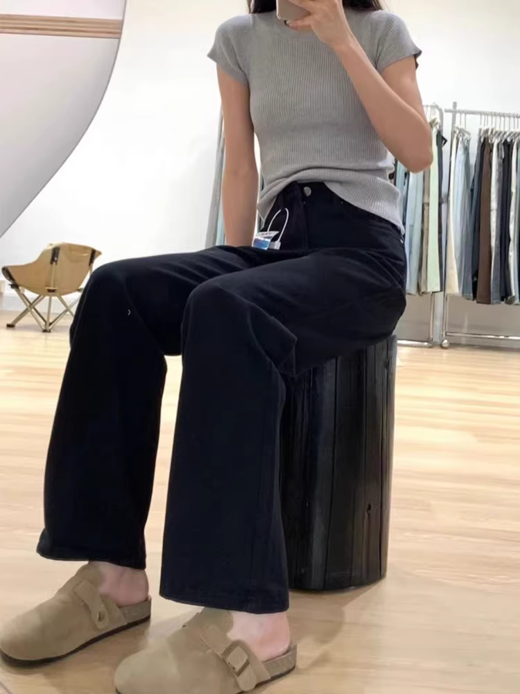 - Quần jean đen ống thẳng cho nữ, kiểu dáng mùa thu mới, cỡ lớn, lưng cao, co giãn, giảm béo, dáng quả lê, quần ống rộng