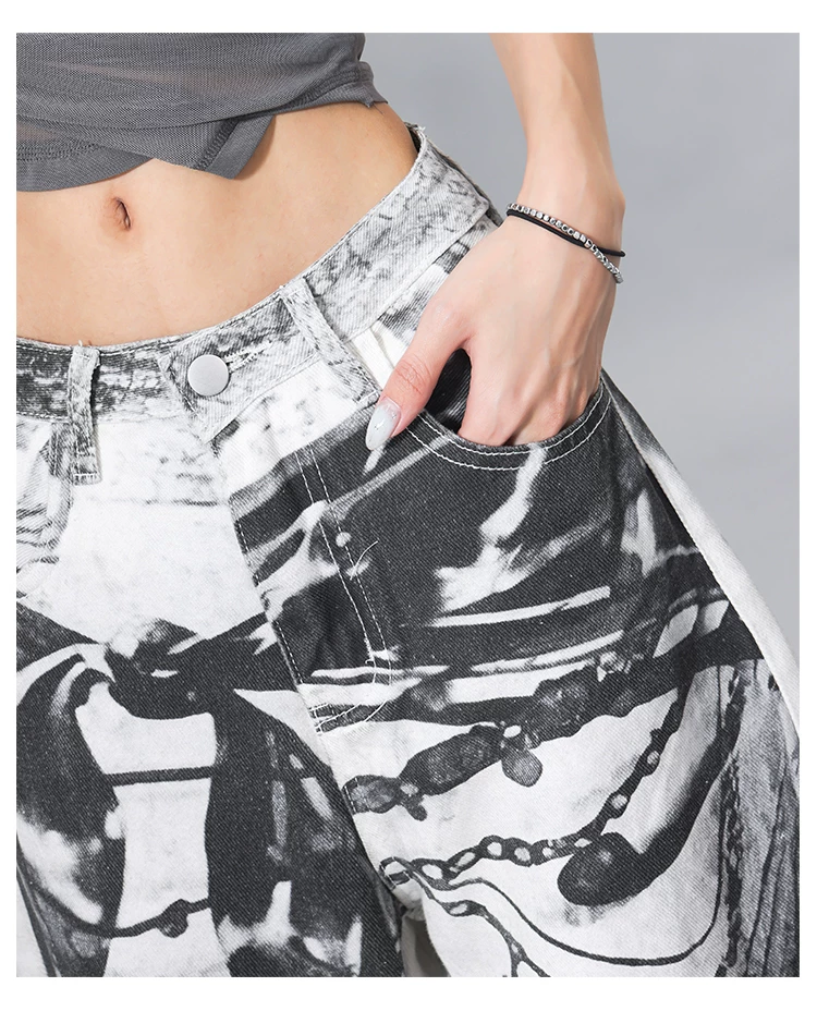 Quần jean denim in mực KEN STUDIO dành cho nữ, phong cách đường phố mùa hè, quần cạp cao, dáng rộng và quần giảm béo