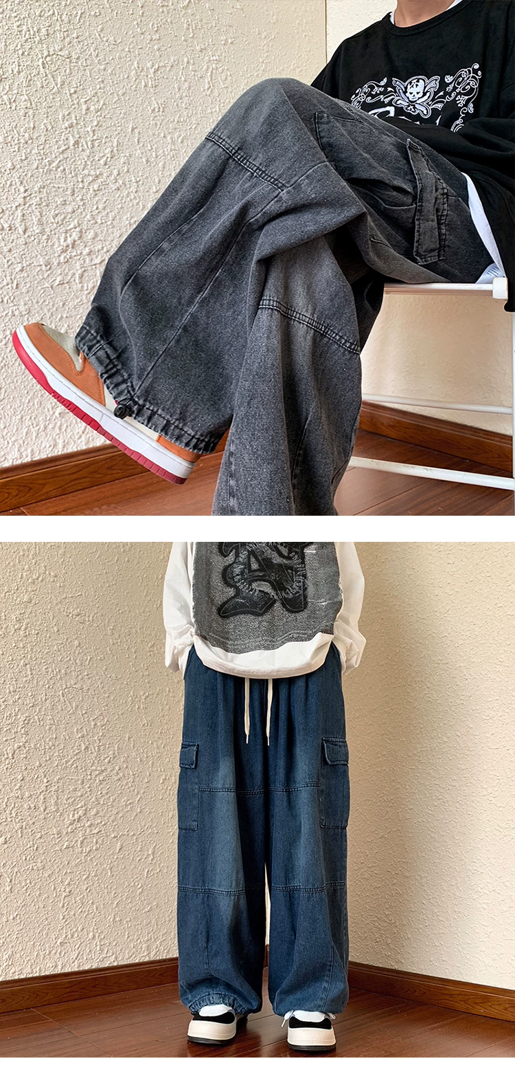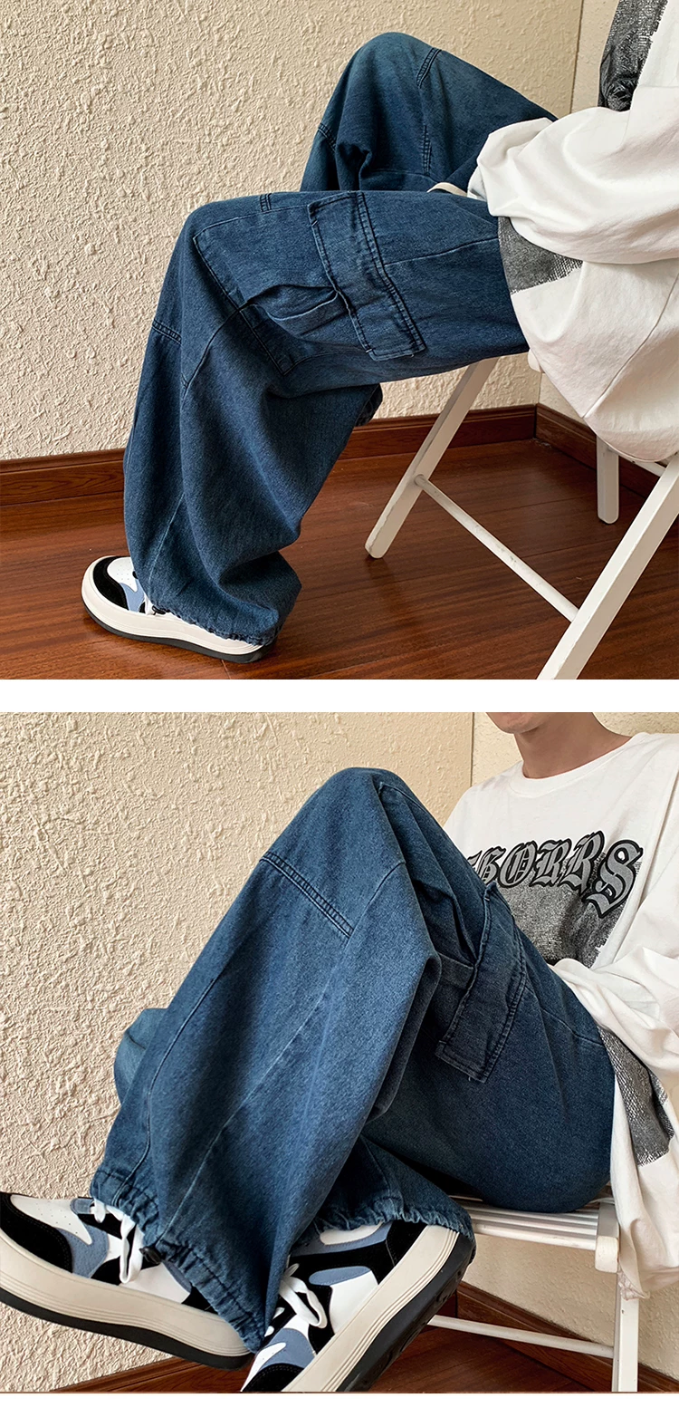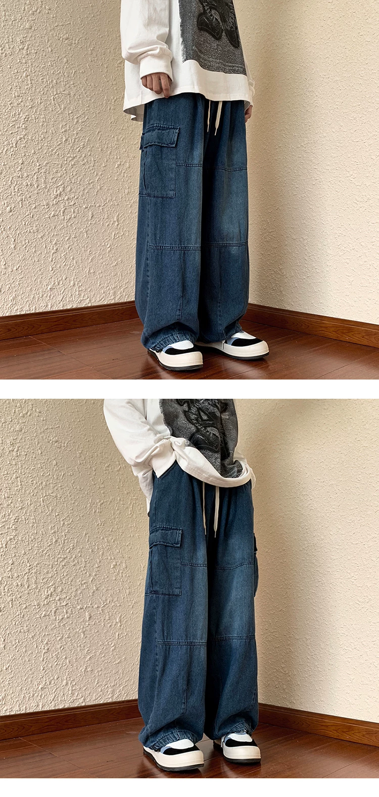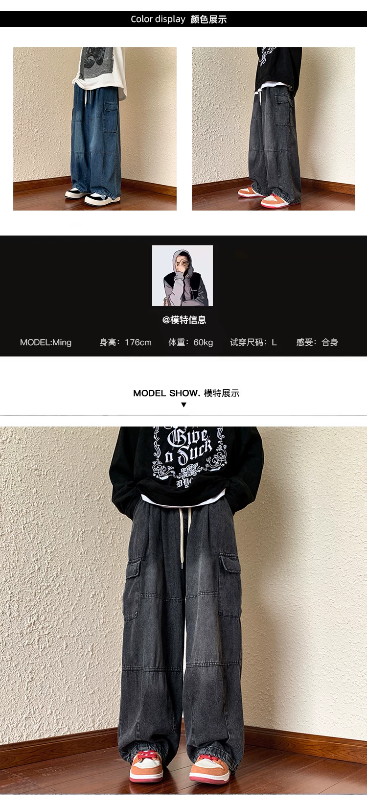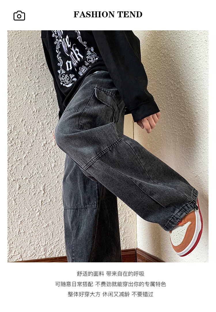 - Quần jean denim nam mùa thu có dây rút, quần dài phong cách Mỹ, kiểu vintage, quần dài ống rộng thời trang hip-hop.