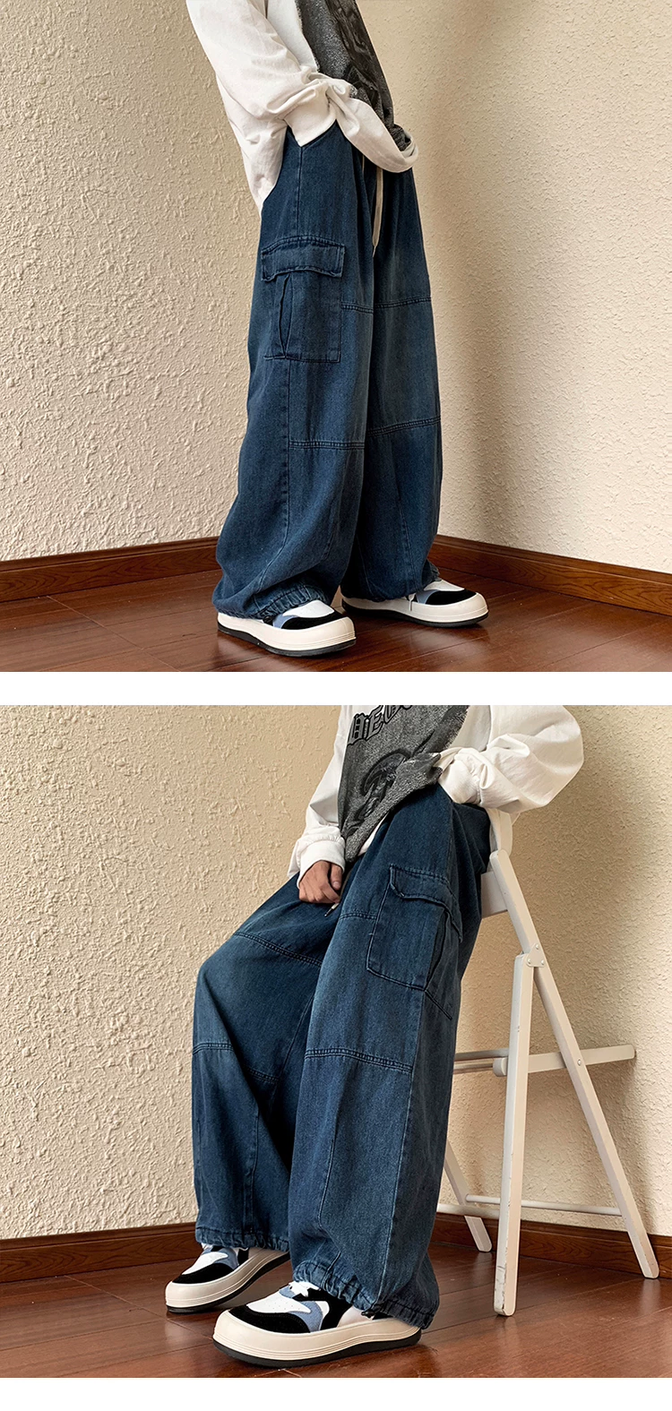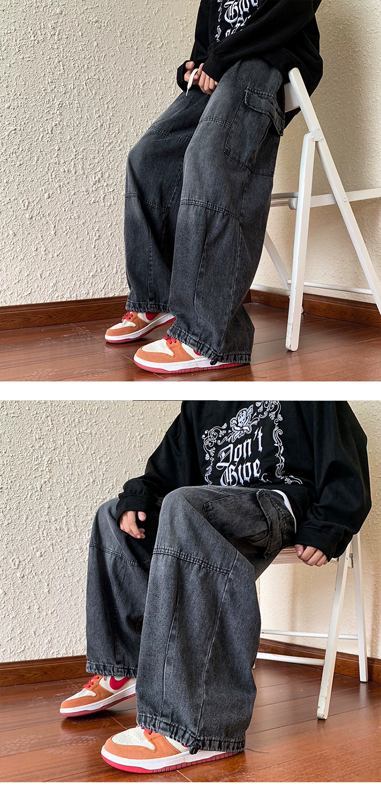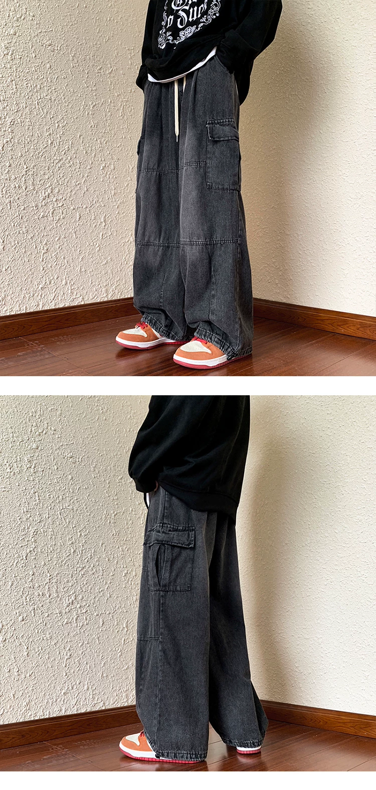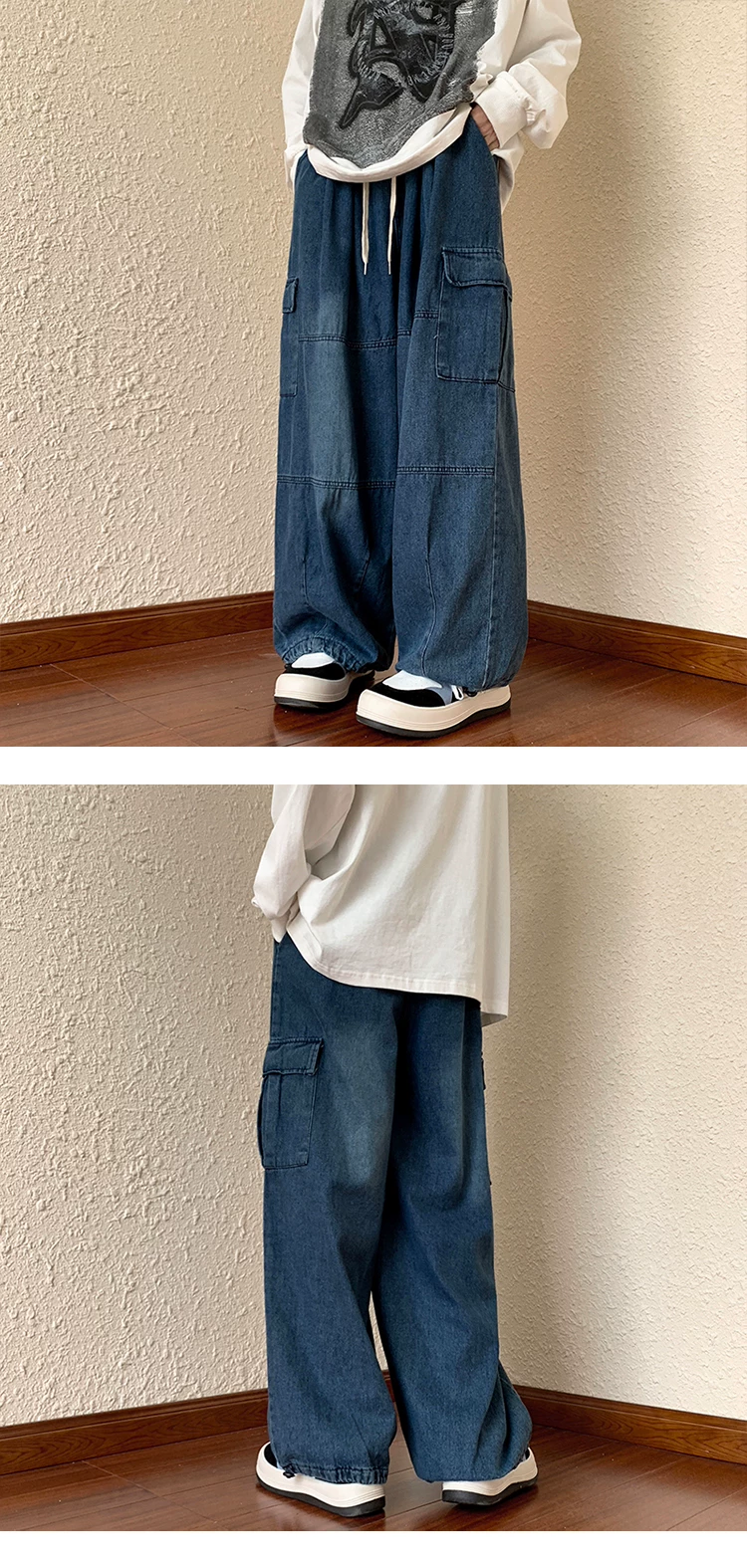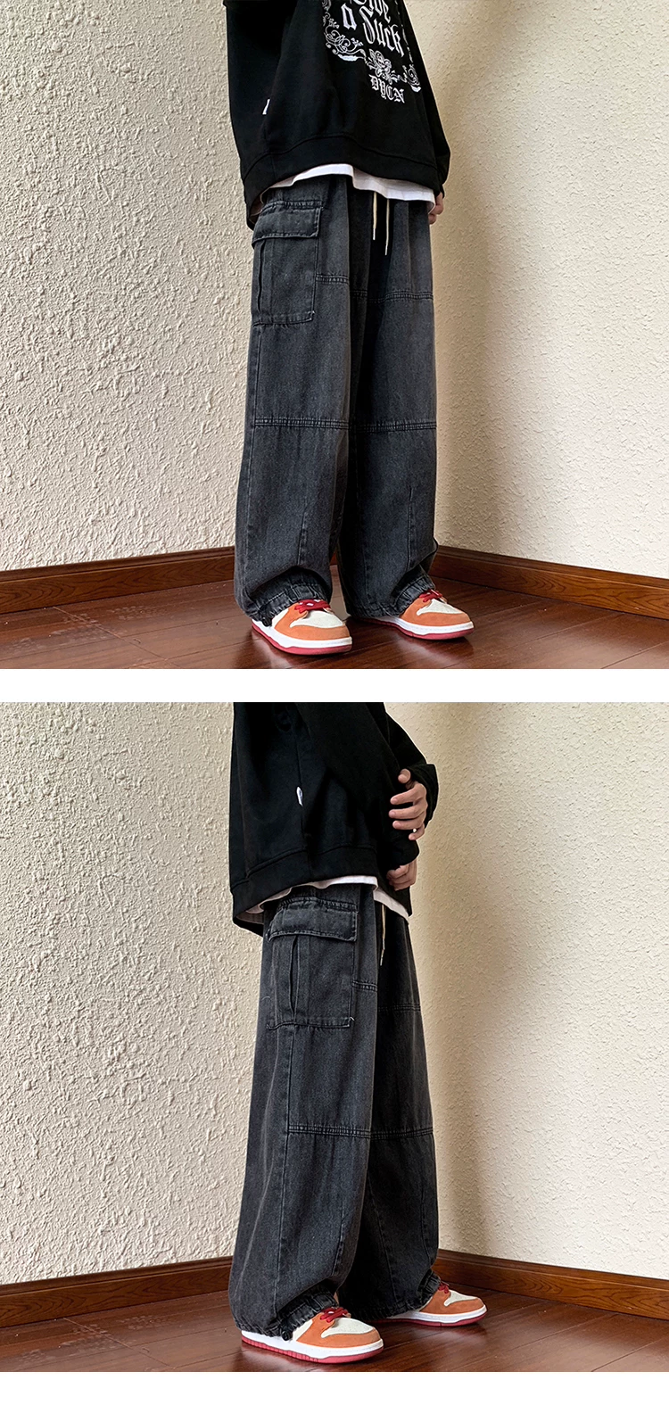 - Quần jean denim nam mùa thu có dây rút, quần dài phong cách Mỹ, kiểu vintage, quần dài ống rộng thời trang hip-hop.