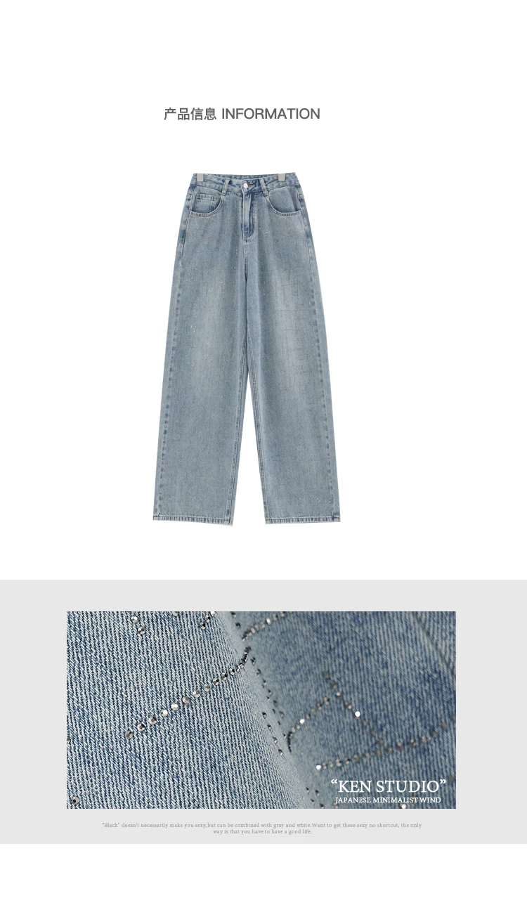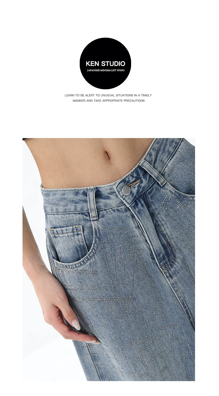 Quần jean denim xước đính đá thủ công kiểu mới xuân thu của KEN STUDIO dành cho nữ, thiết kế độc đáo, quần dài ống thẳng.