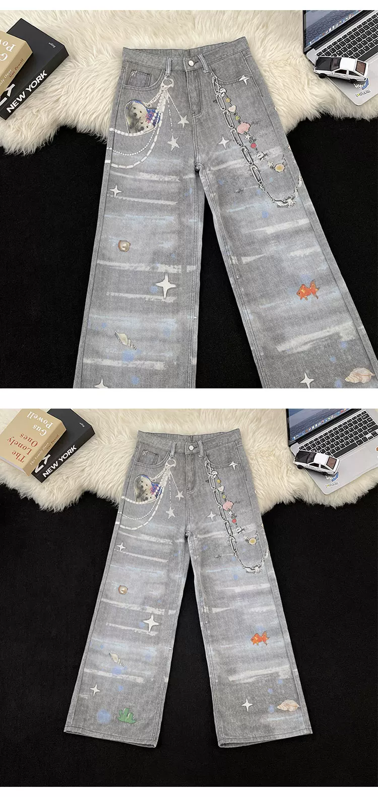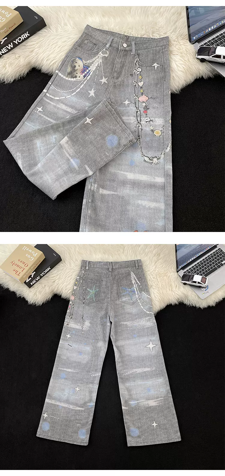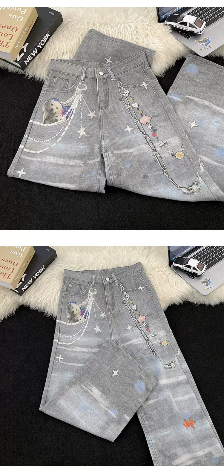 Quần jean in 3D dành cho nam và nữ, quần ống đứng phong cách thời thượng mùa xuân thu, quần ống rộng dáng rộng phong cách retro Mỹ.