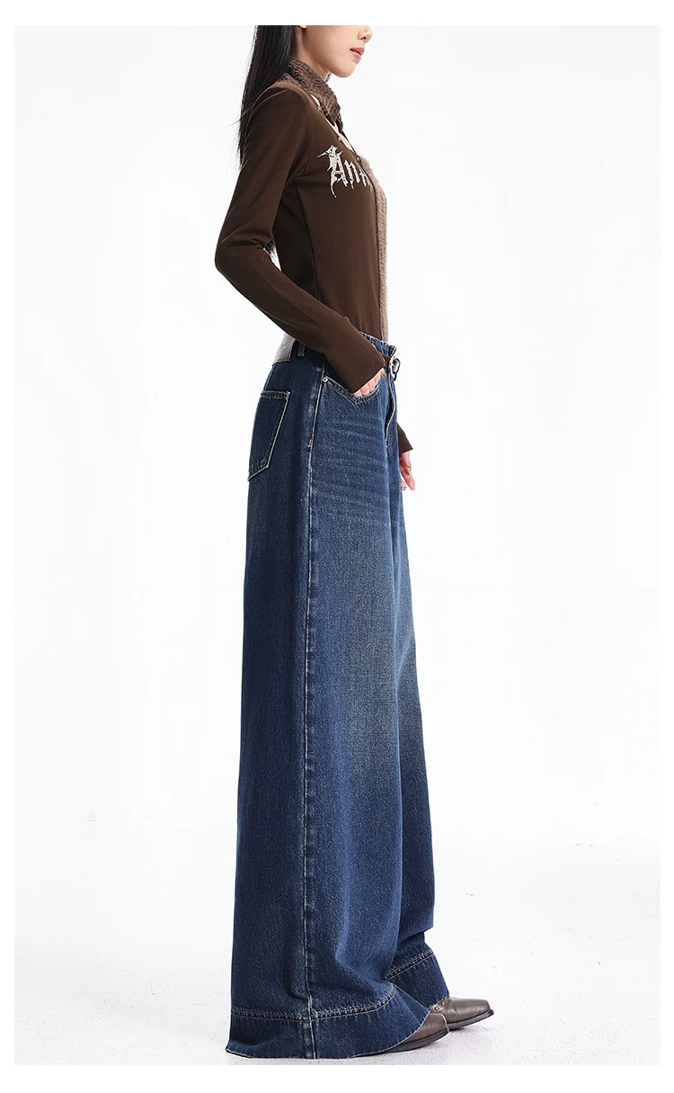 Quần jean kiểu Mỹ cổ điển có lót lông cừu mùa thu đông của KEN STUDIO dành cho nữ, quần ống rộng lưng cao, dáng rộng, giúp thon gọn.