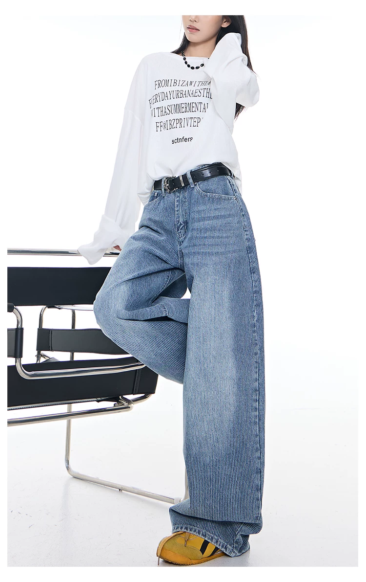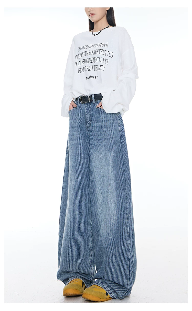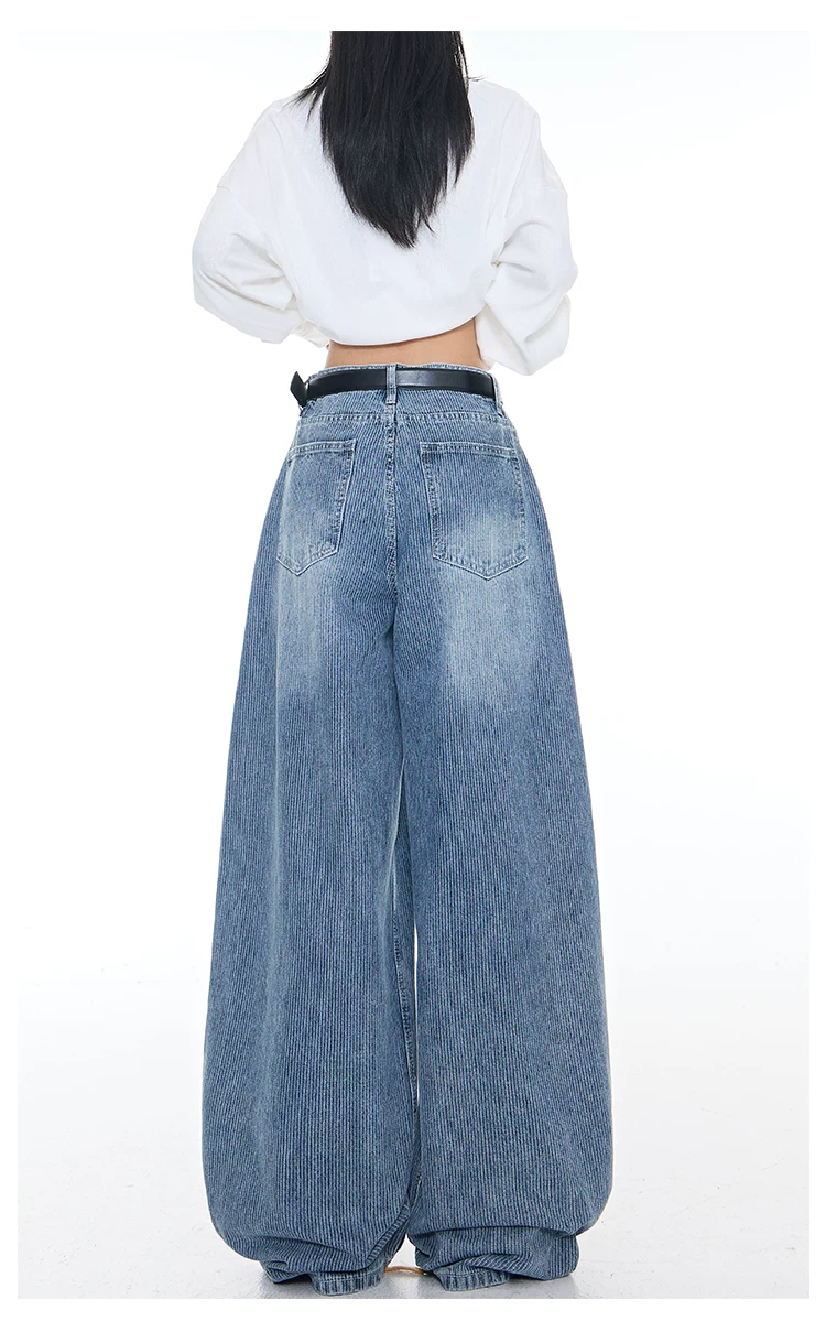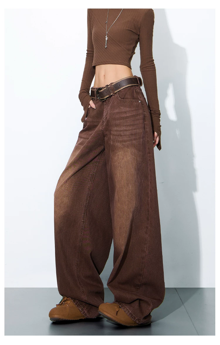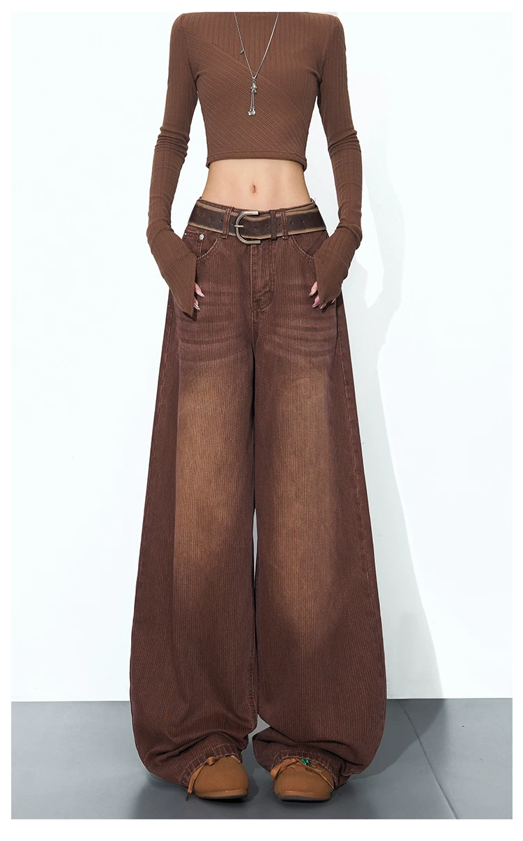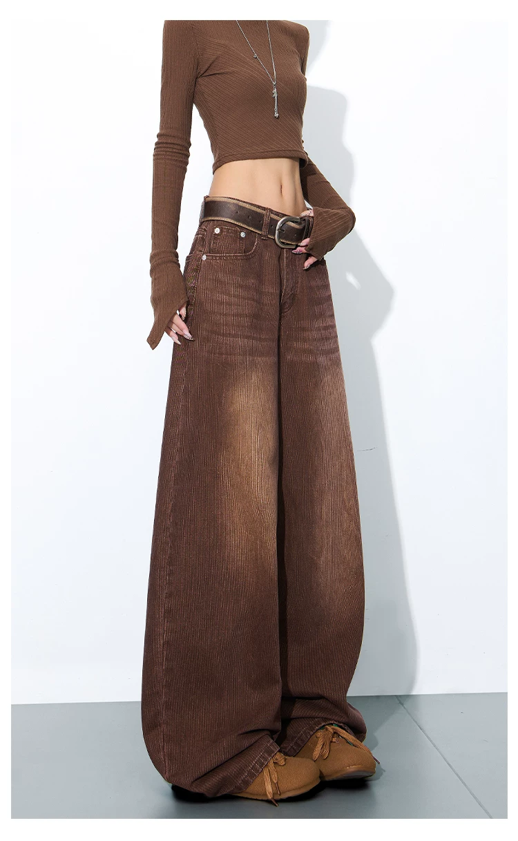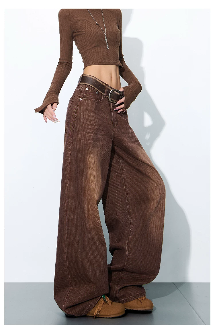 Quần jean kiểu Mỹ cổ điển có lót lông cừu mùa thu đông của KEN STUDIO dành cho nữ, quần ống rộng lưng cao dáng rộng.