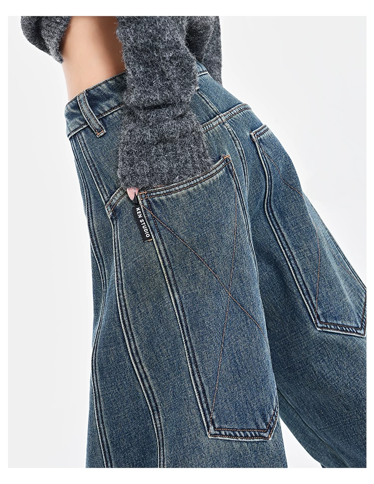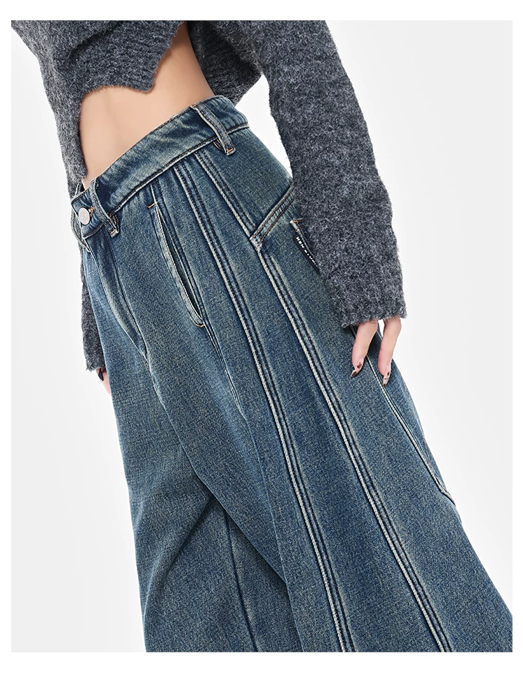 Quần jean lót lông cừu mùa thu đông của KEN STUDIO dành cho phụ nữ cao, quần ống rộng dáng rộng cực dài, quần chuối.