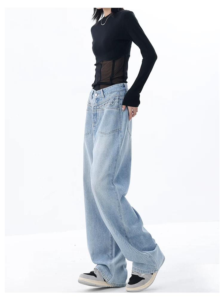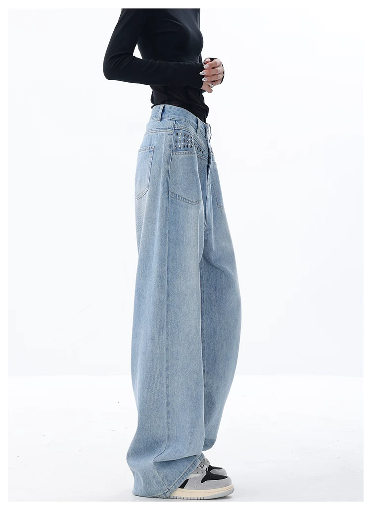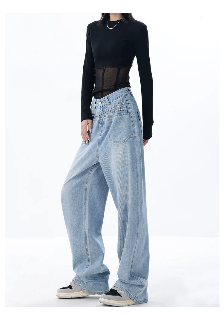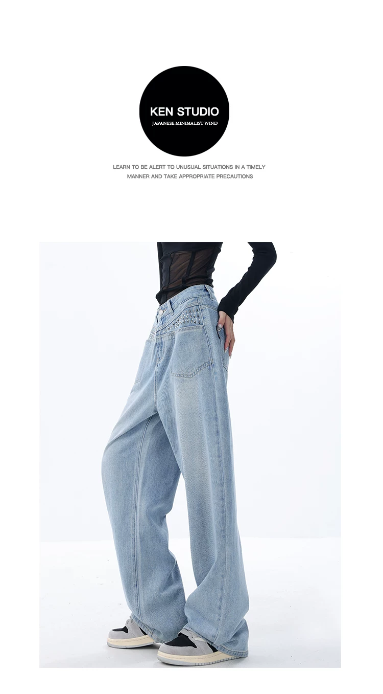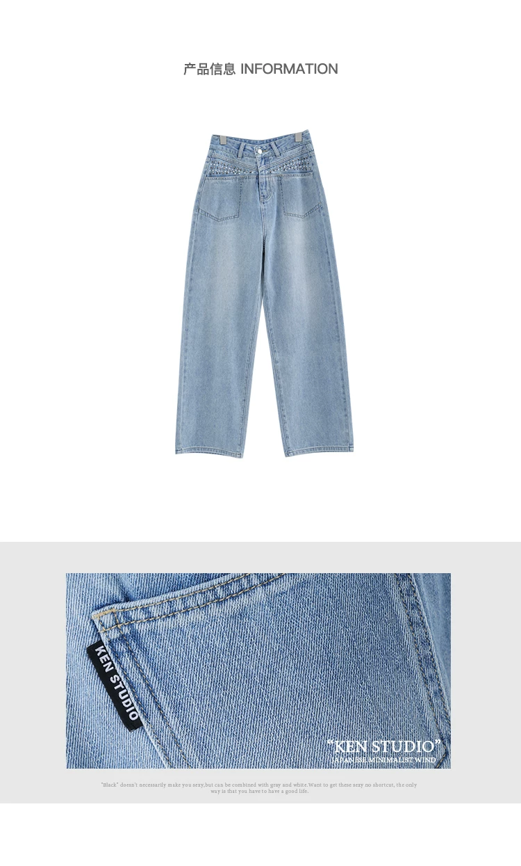 - Quần jean màu xanh lam được thiết kế theo phong cách KEN STUDIO dành cho nữ, kiểu dáng mới mùa xuân thu, dáng rộng, quần ống rộng giúp thon gọn.