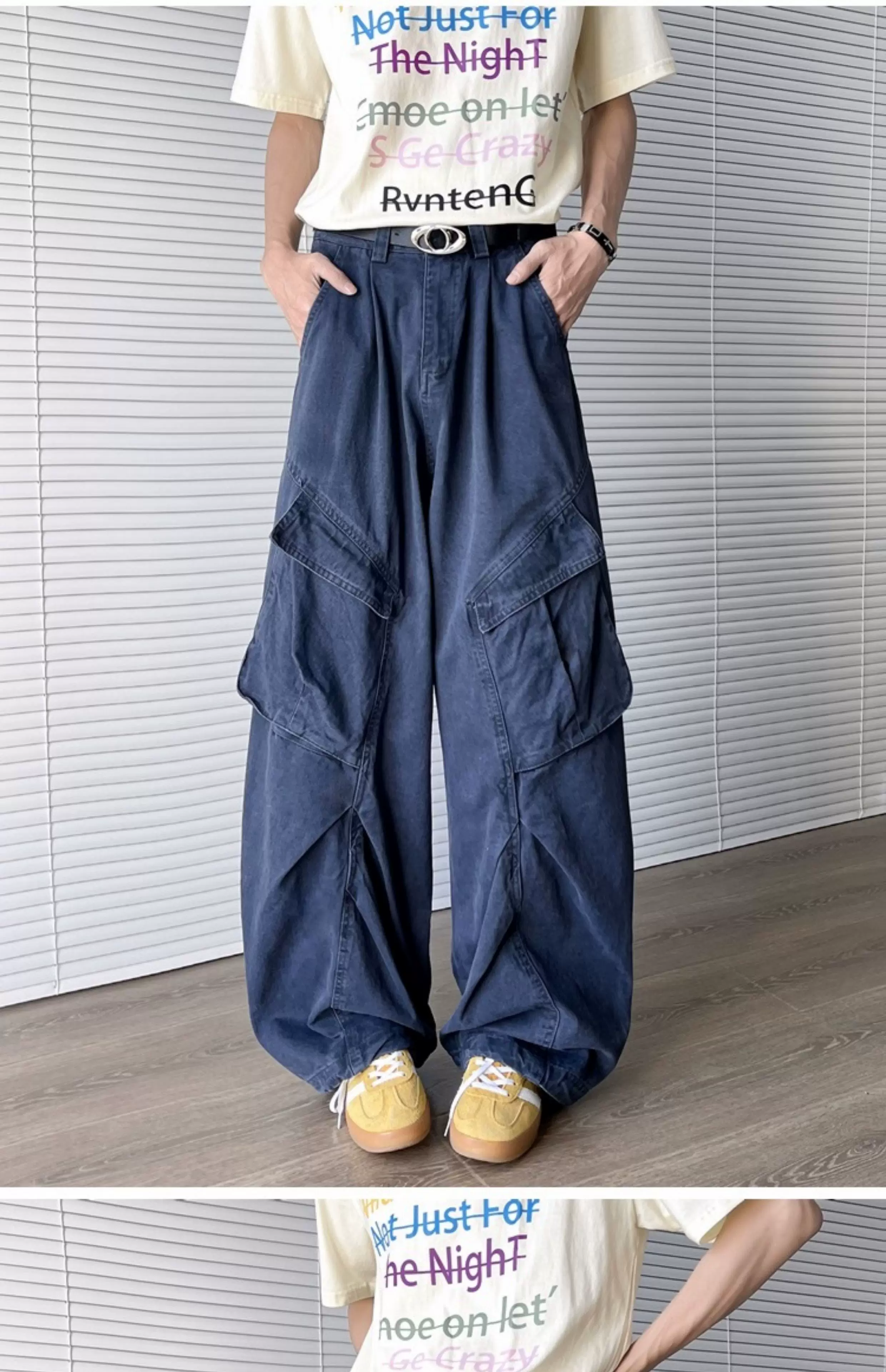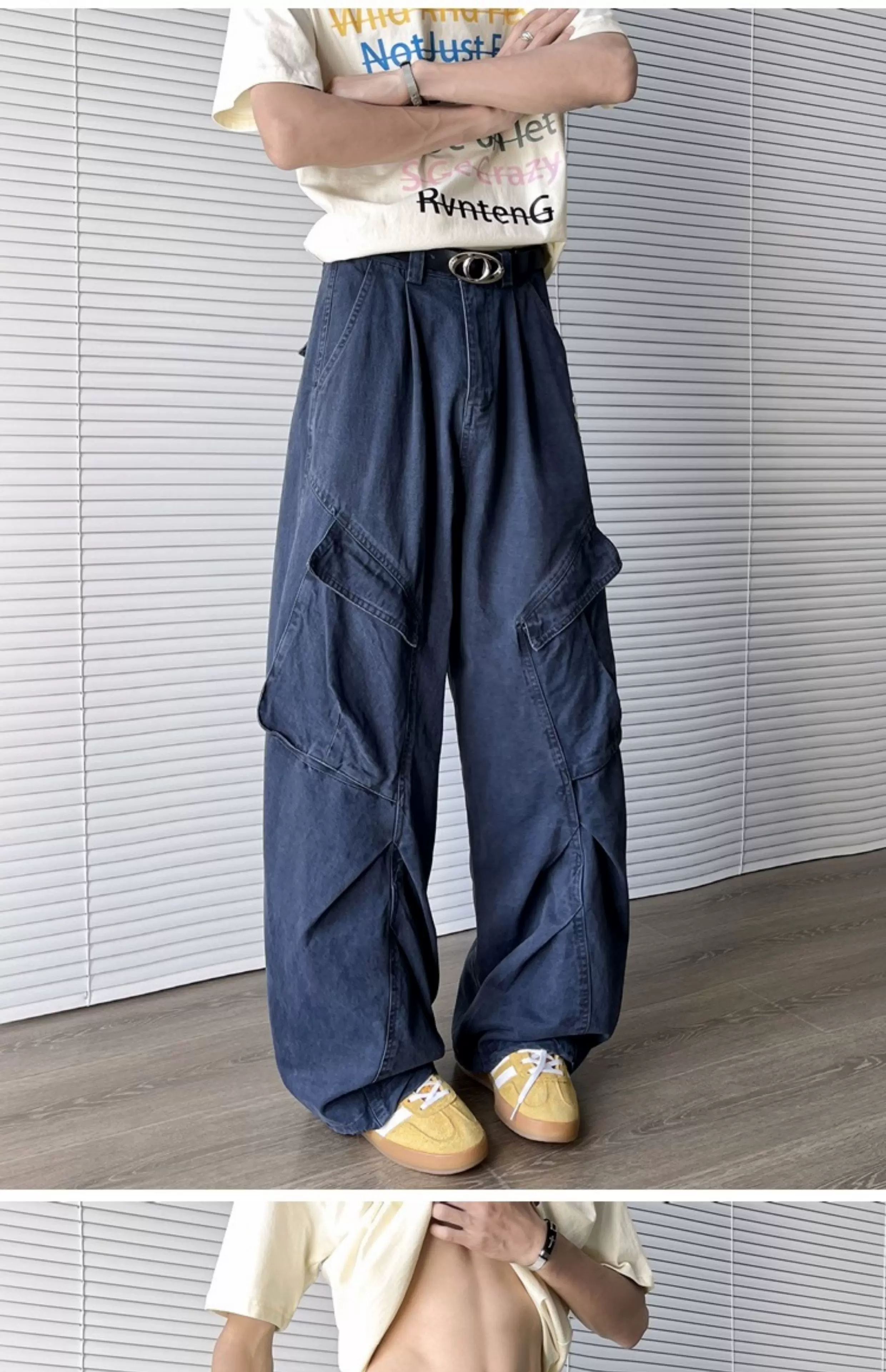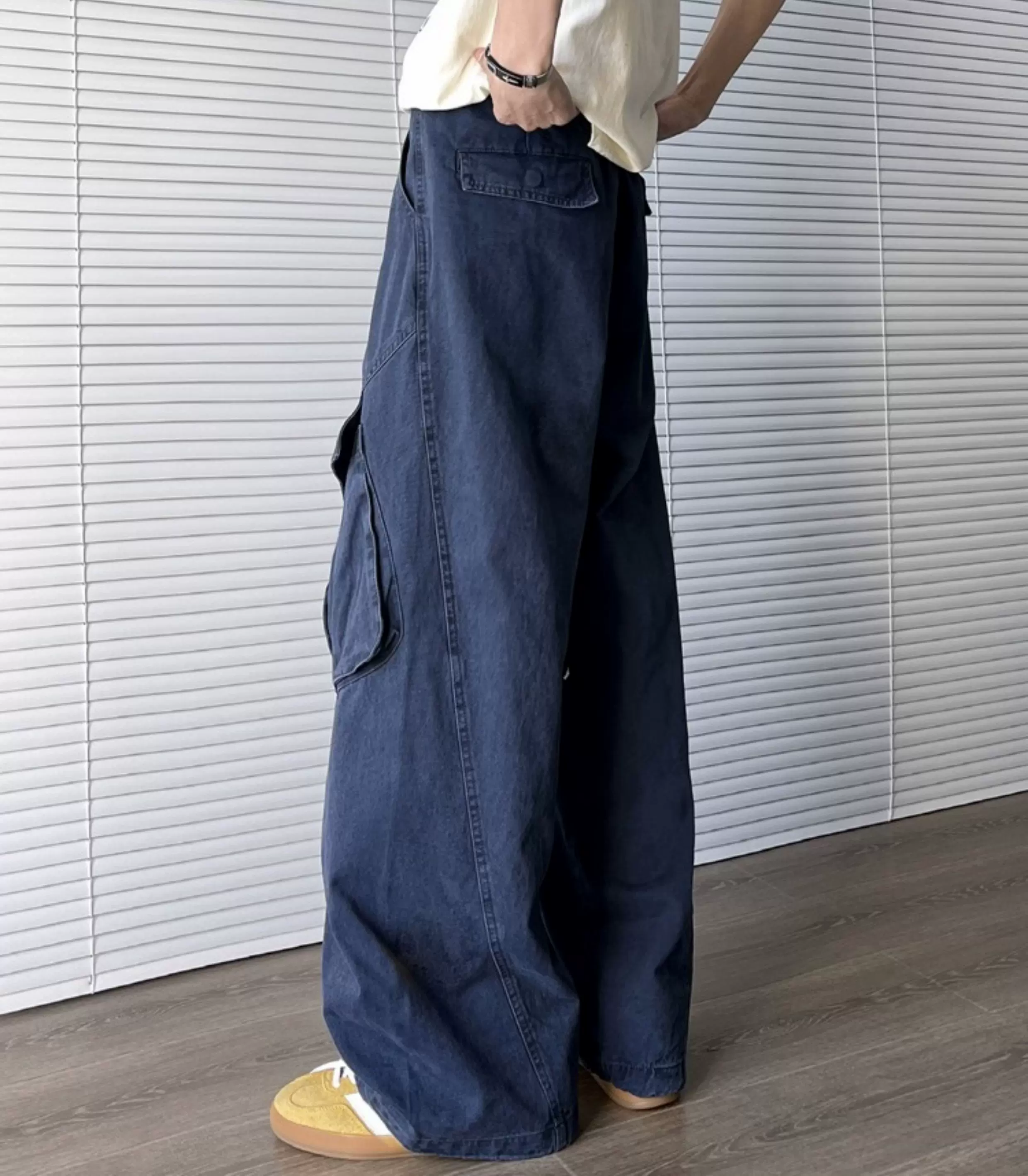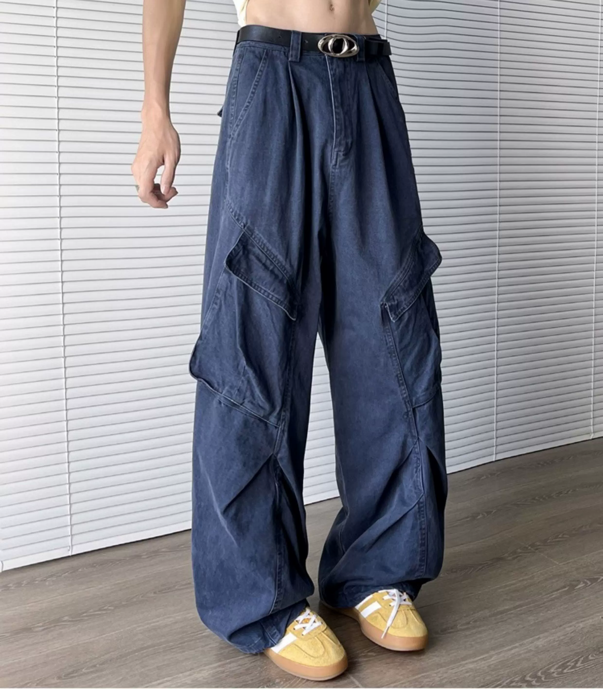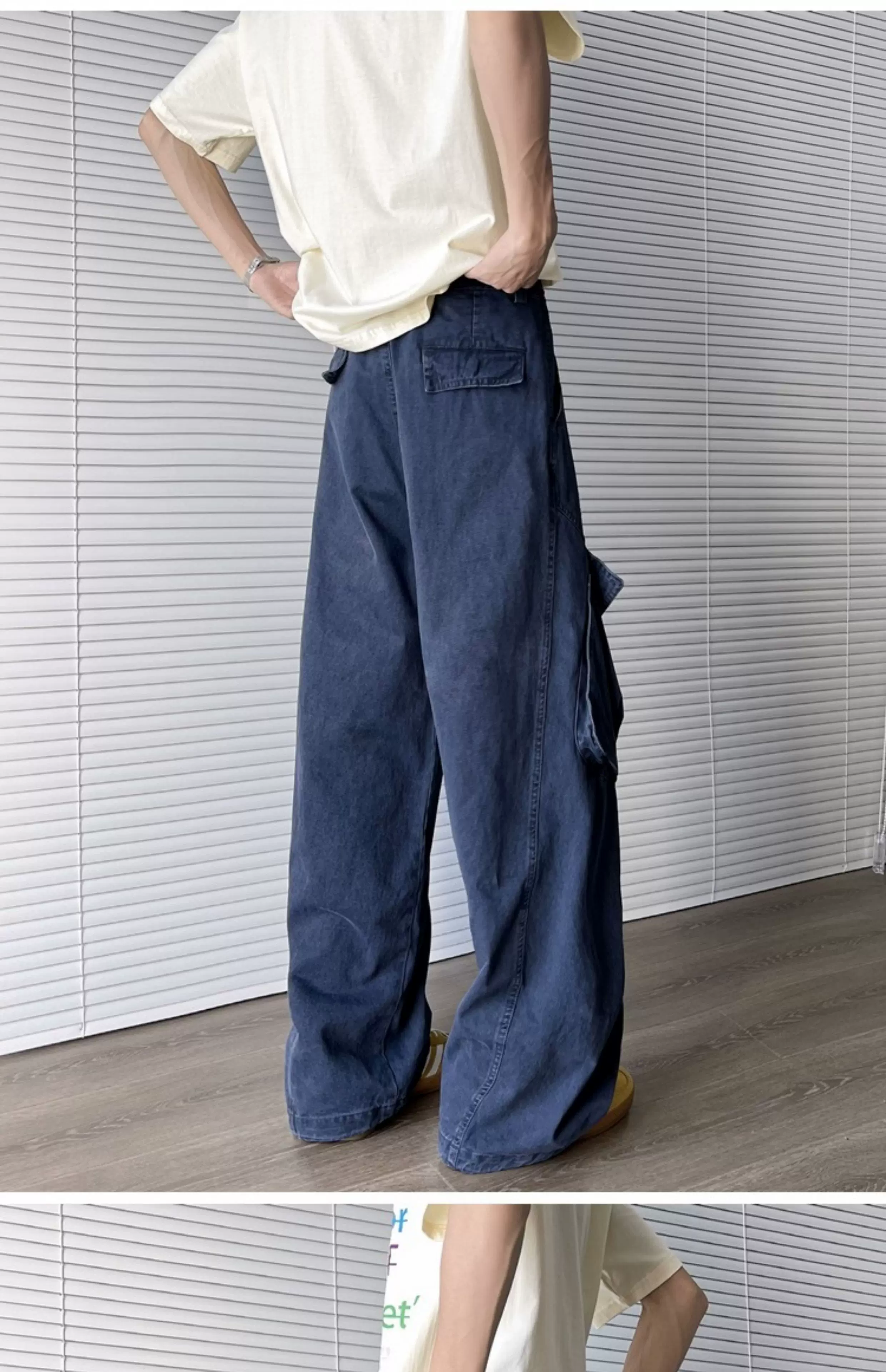 Quần jean nam dáng rộng thời trang, có túi bên hông lớn, quần công sở thiết kế phá cách theo phong cách retro Mỹ.