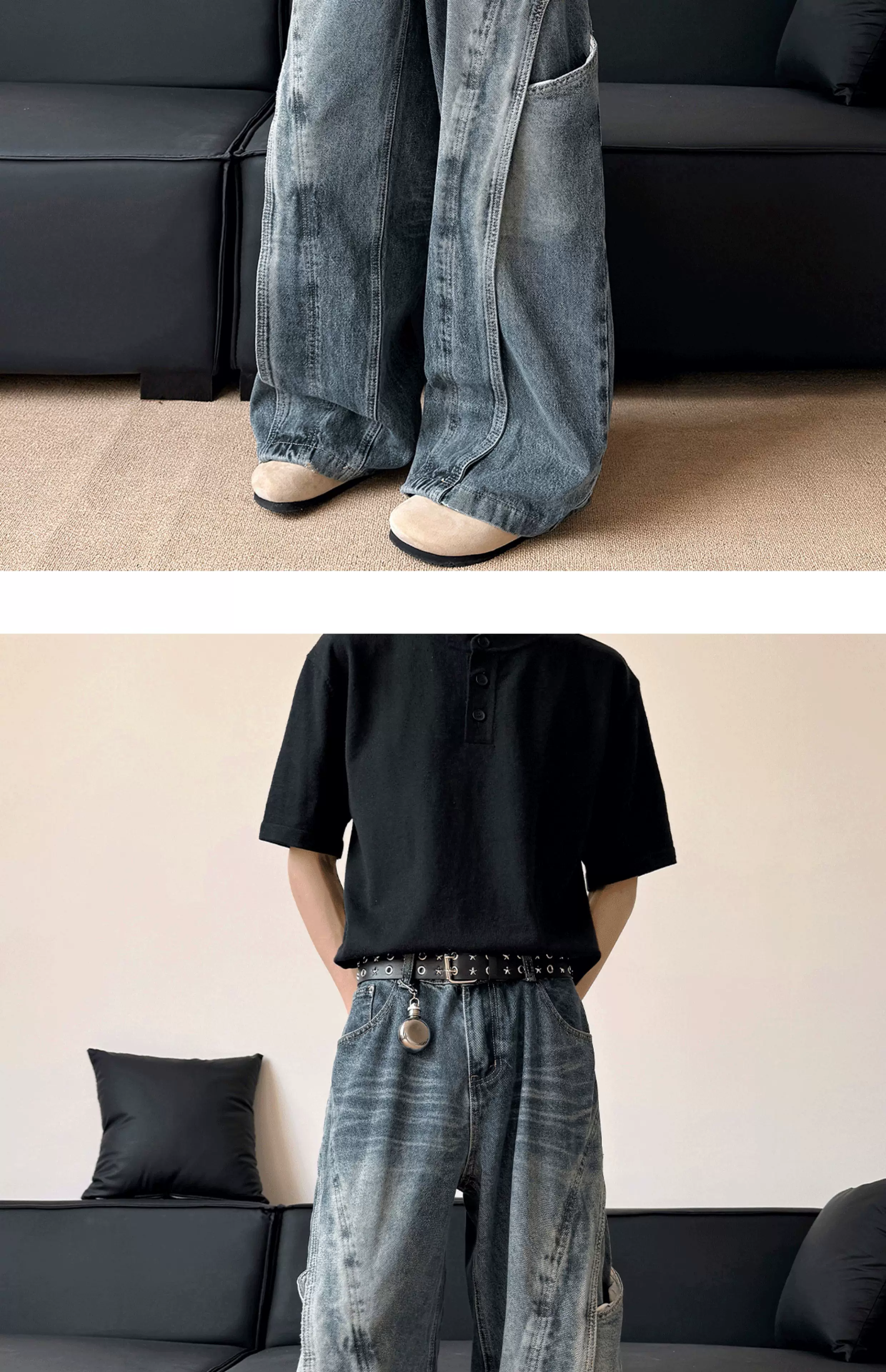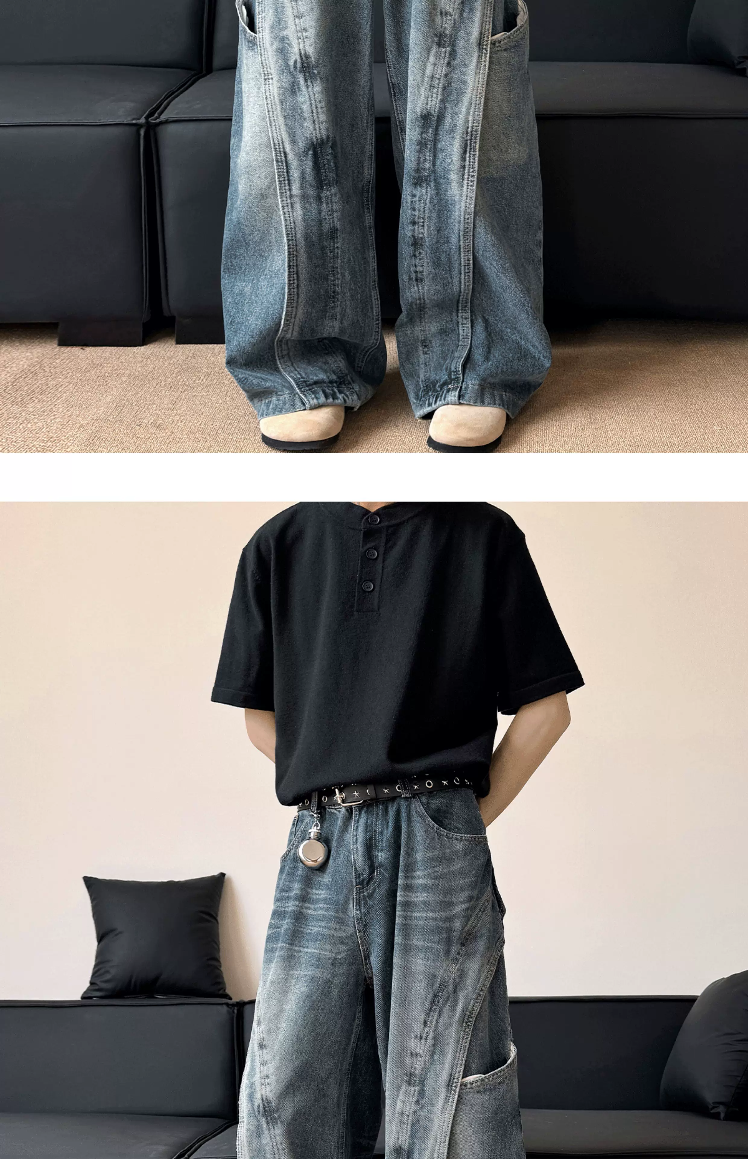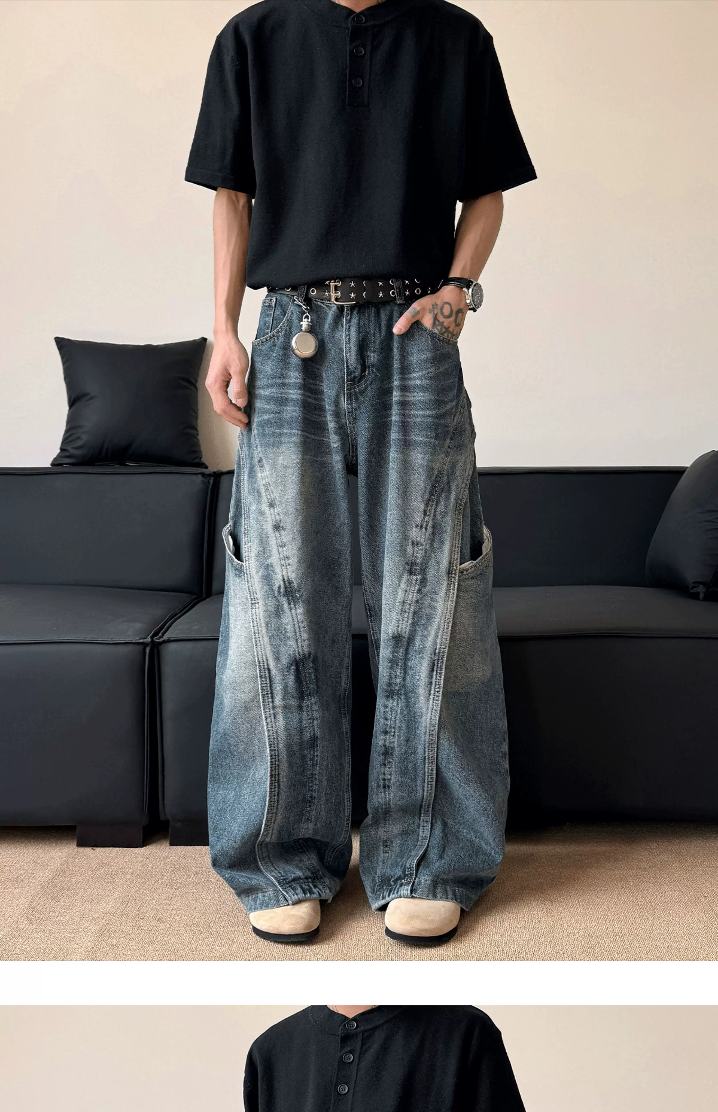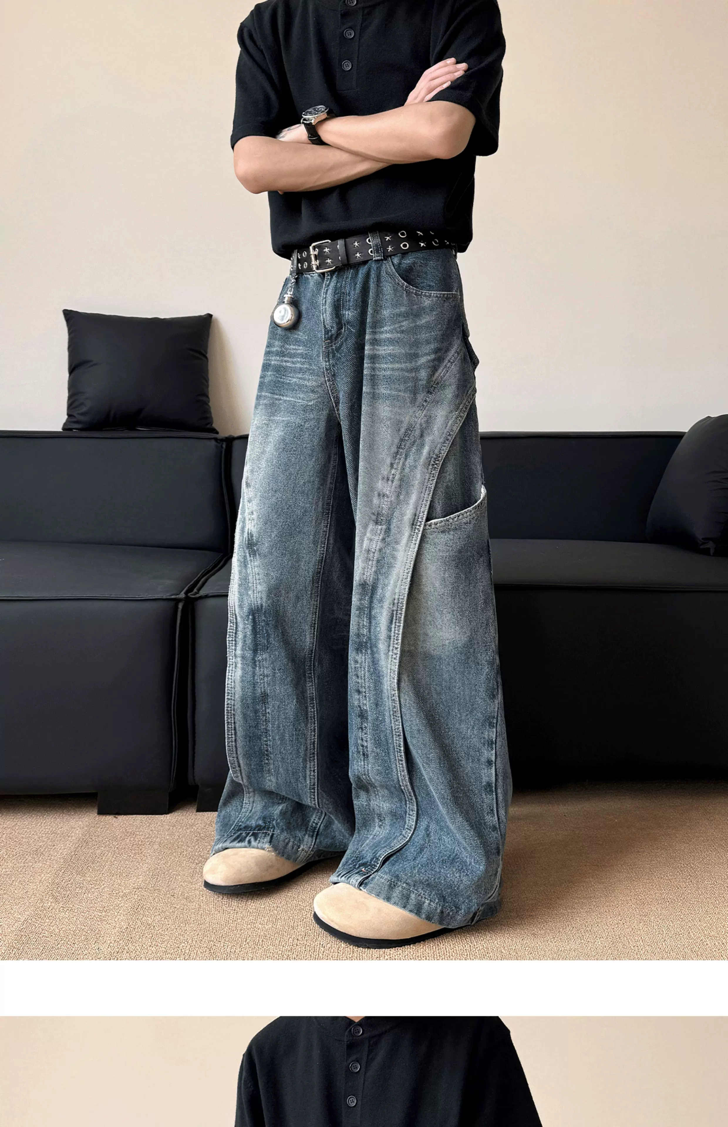 - Quần jean nam kiểu dáng thiết kế thời trang, quần ống đứng phối vải phong cách Mỹ, quần ống rộng retro phong cách đường phố.