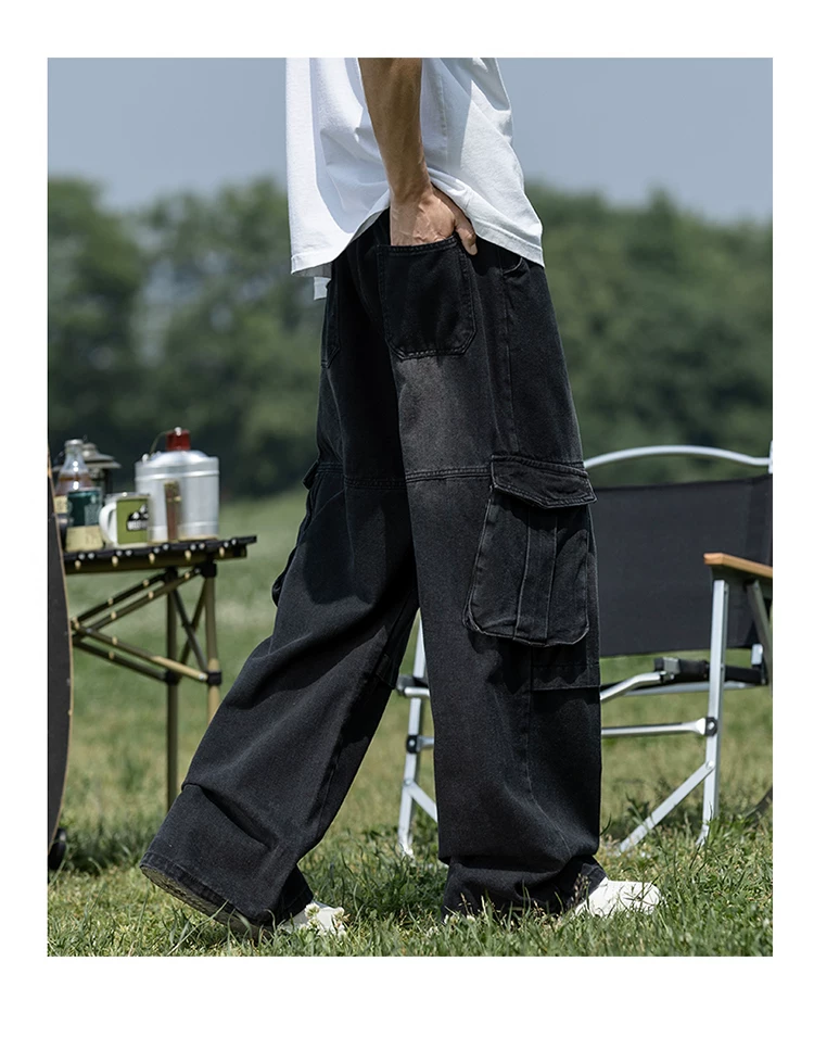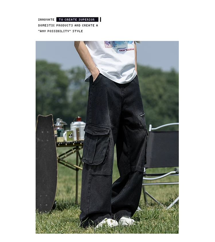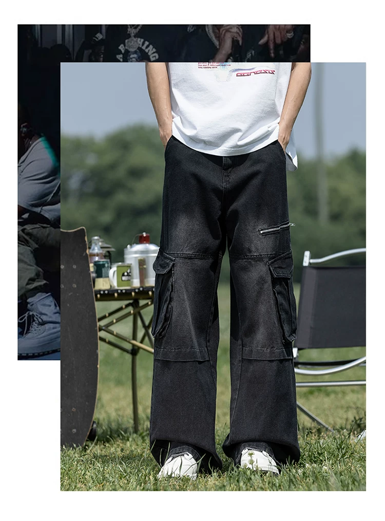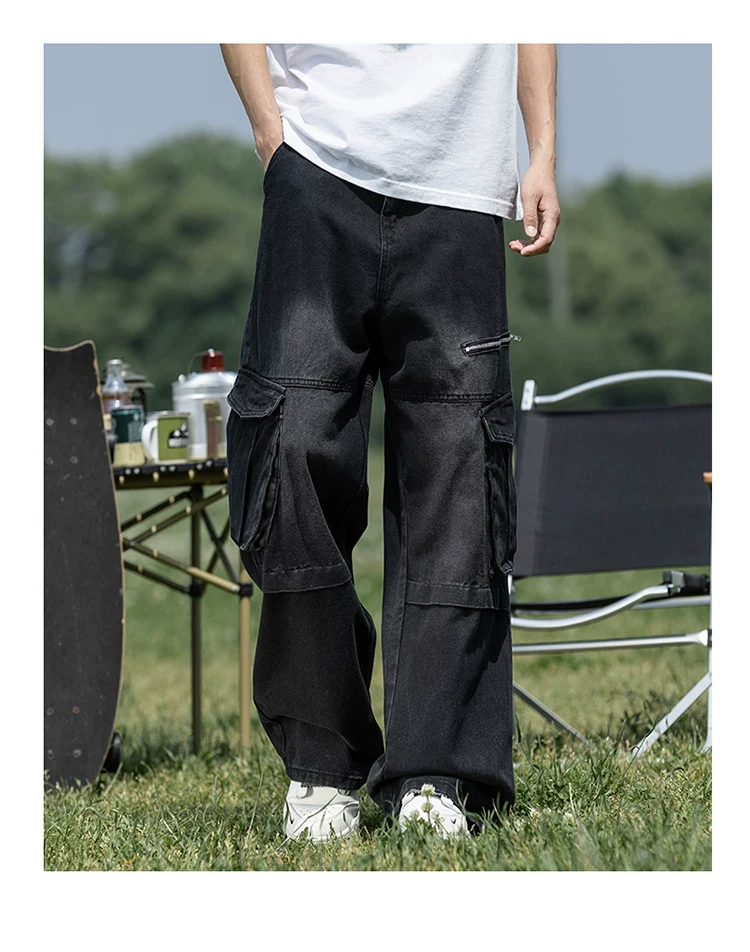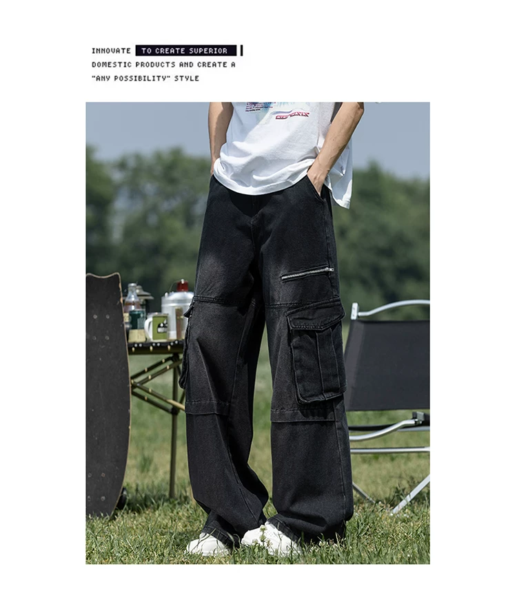 Quần jean nam nhiều túi có khóa kéo, chất liệu bền chắc, quần dài dáng rộng phong cách thời trang, quần dài ống rộng kiểu Mỹ.