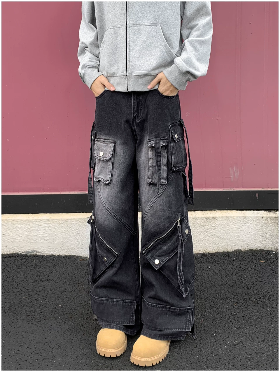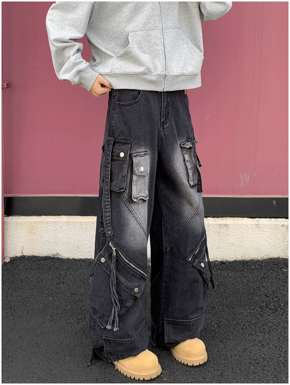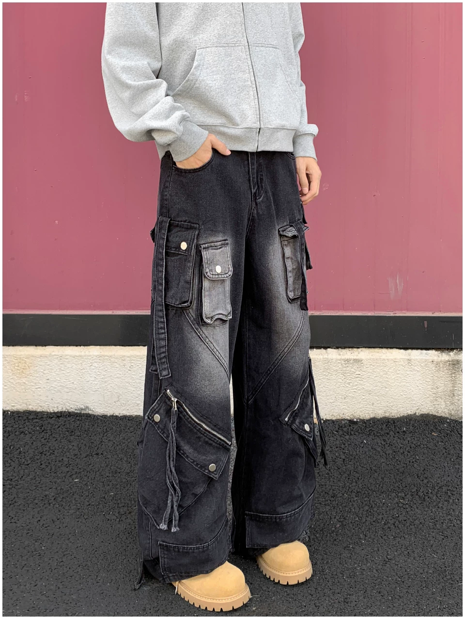 Quần jean nam vintage đã qua giặt, kiểu dáng rộng thùng thình, phong cách Mỹ, nhiều túi, ống thẳng, dài, hợp thời trang mùa thu.