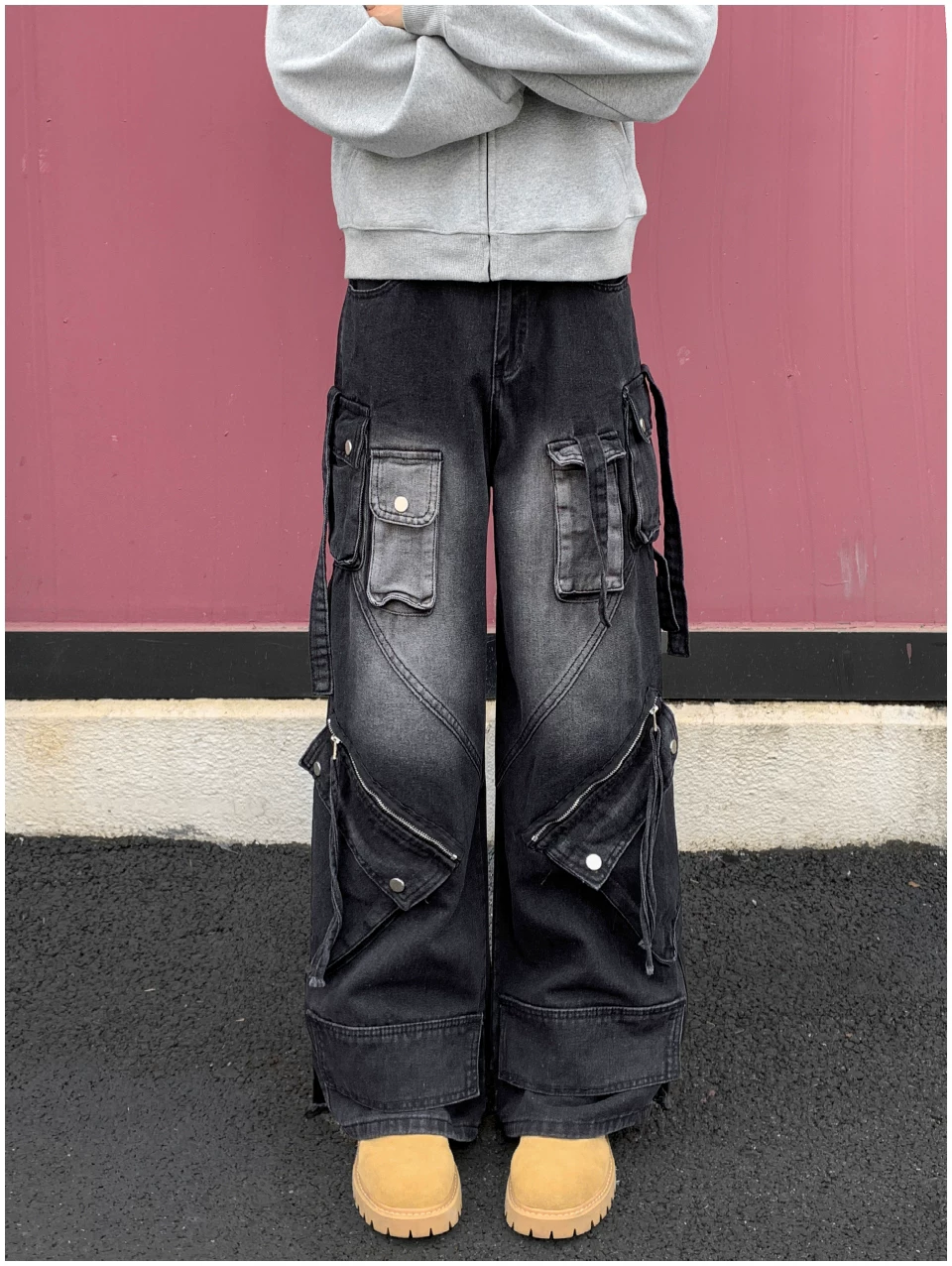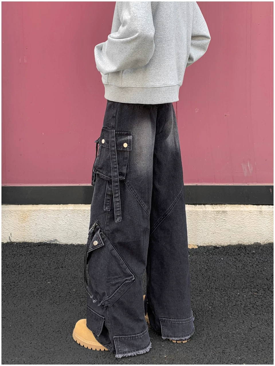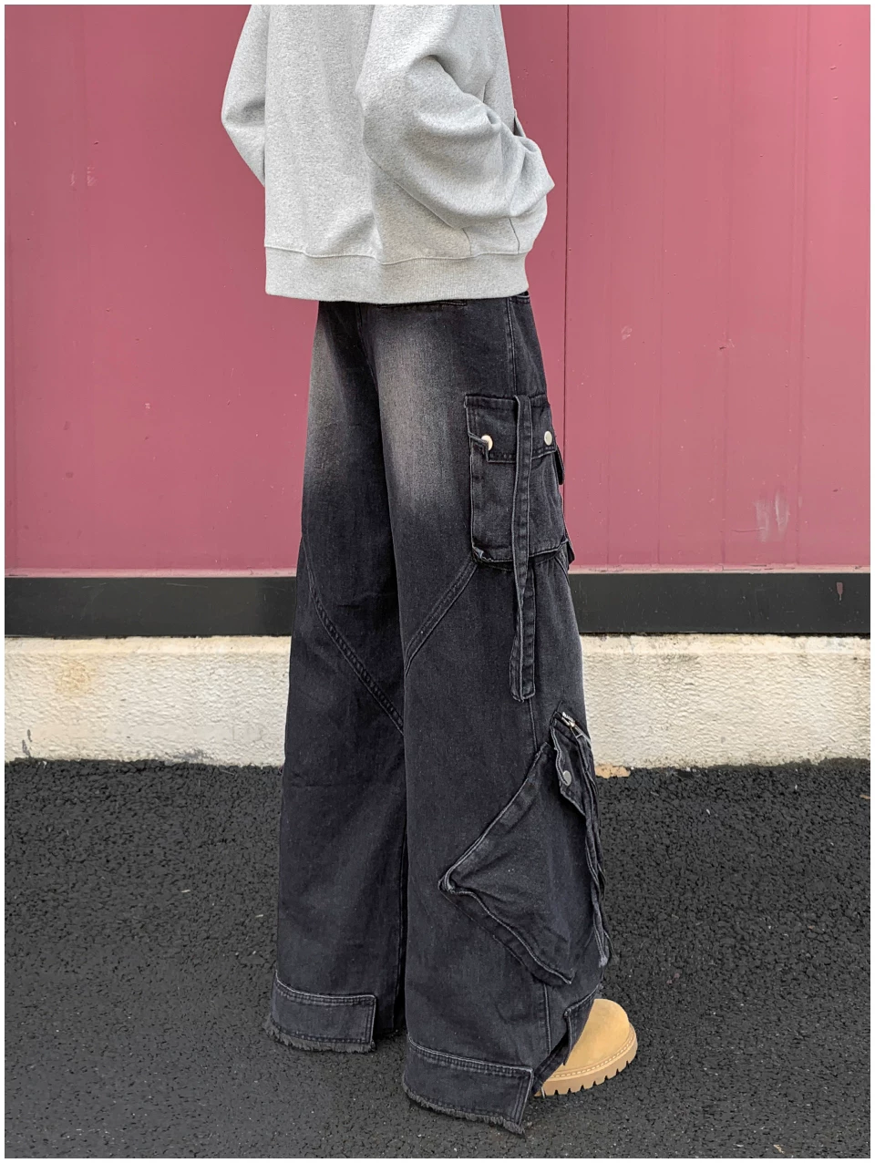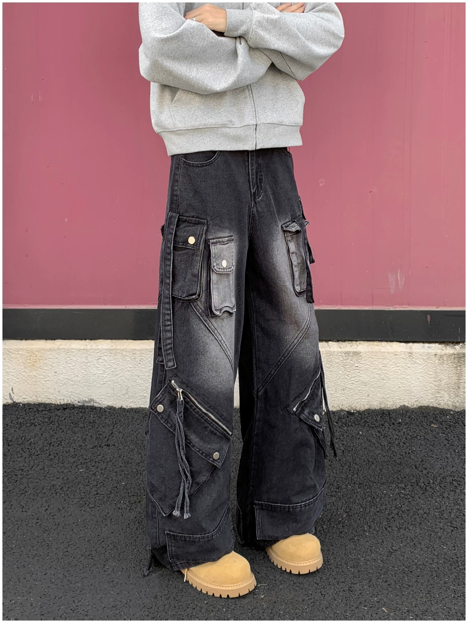 Quần jean nam vintage đã qua giặt, kiểu dáng rộng thùng thình, phong cách Mỹ, nhiều túi, ống thẳng, dài, hợp thời trang mùa thu.