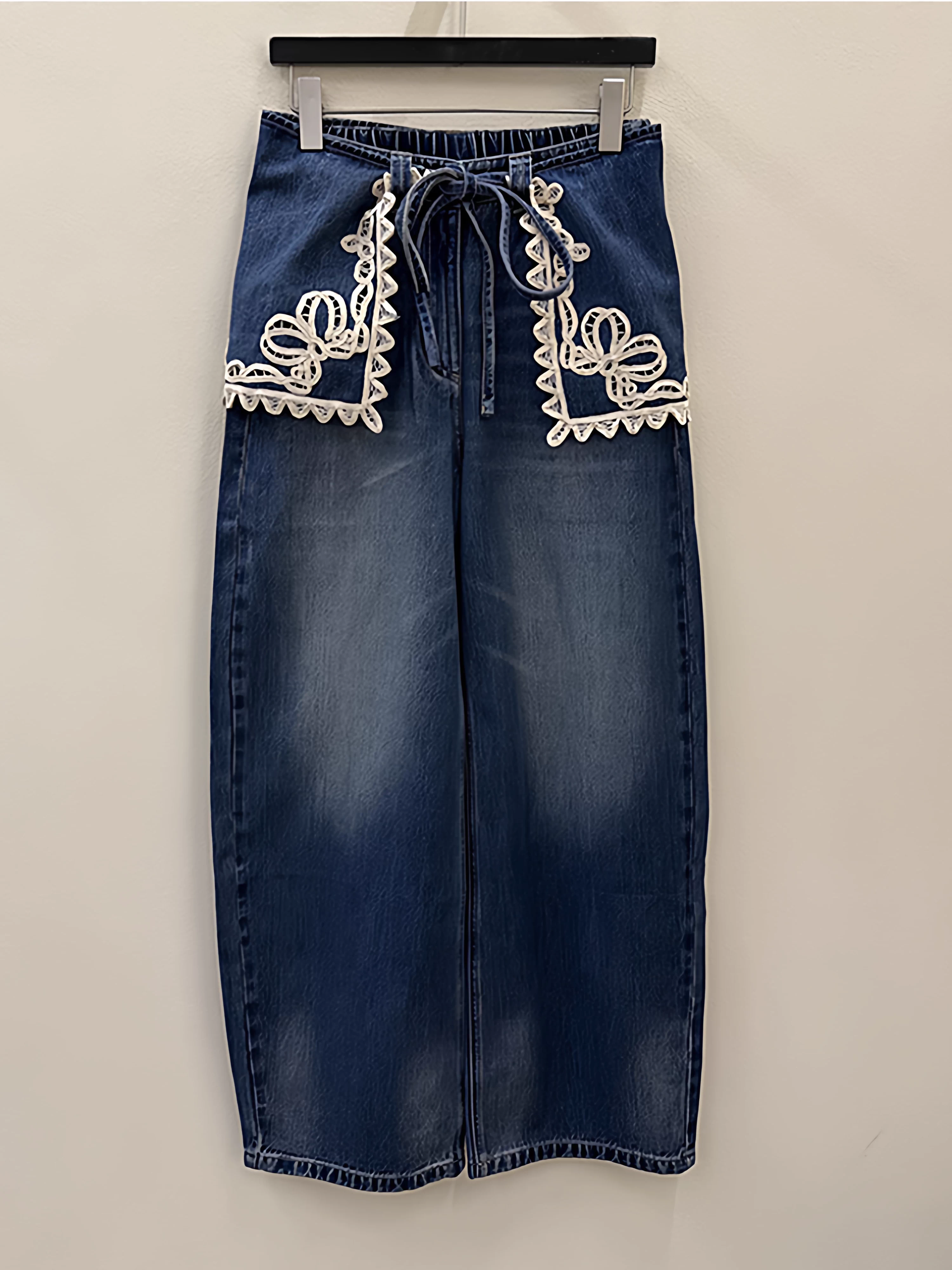 Quần jean ống chuông thêu ren kiểu mới Thu 2025 dành cho bé gái lớn tuổi, quần ống rộng thời trang dành cho bé gái nhỏ nhắn.