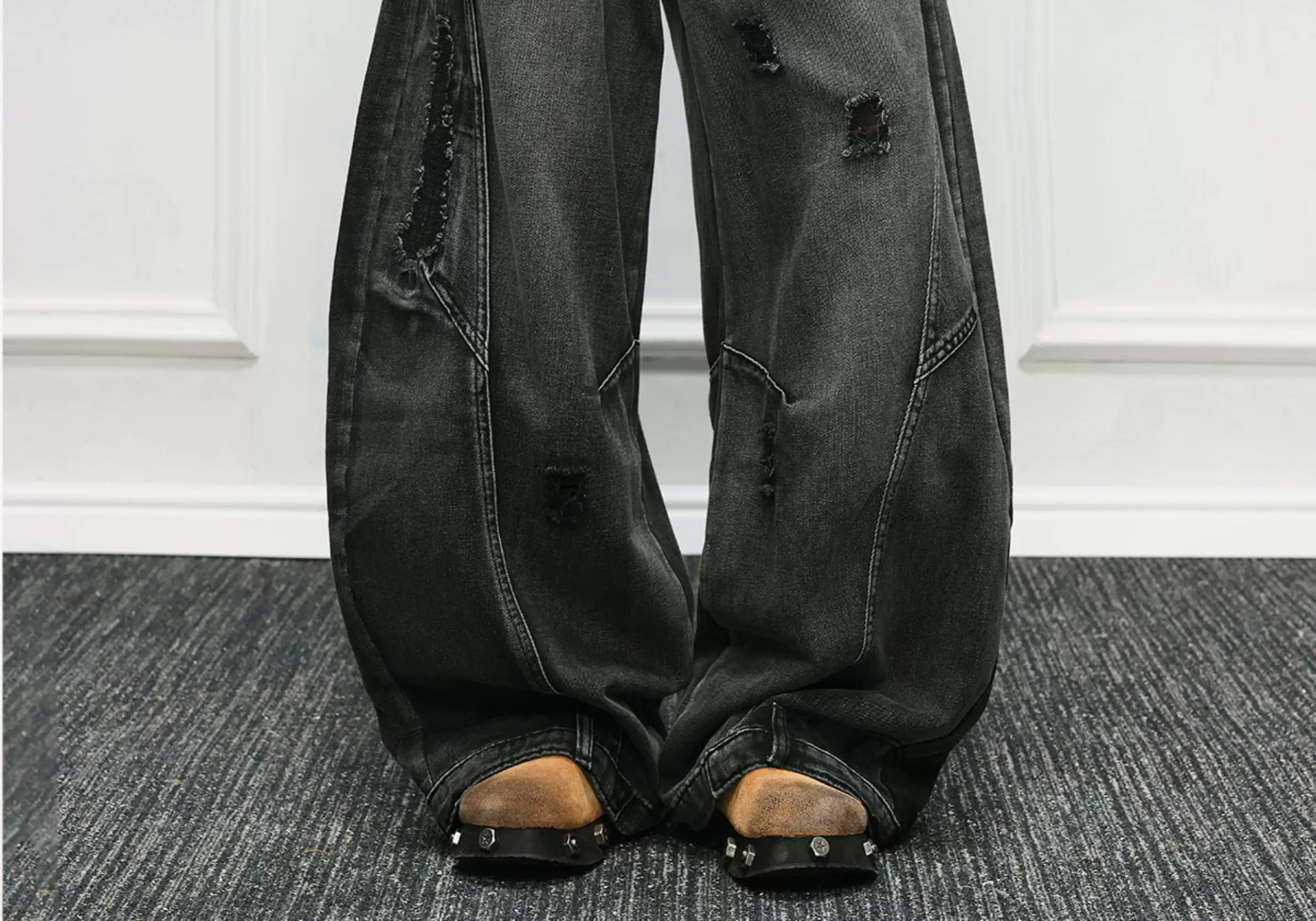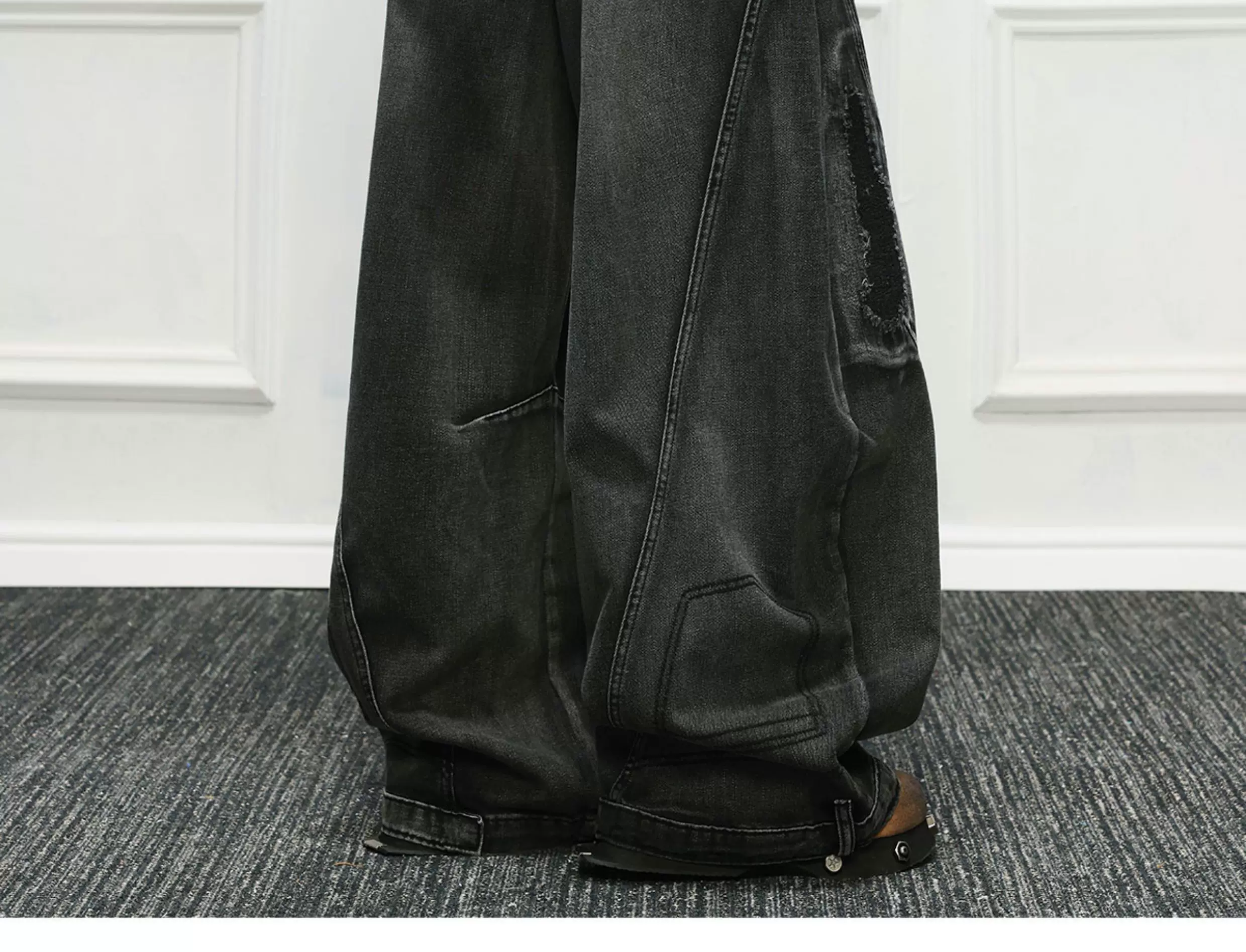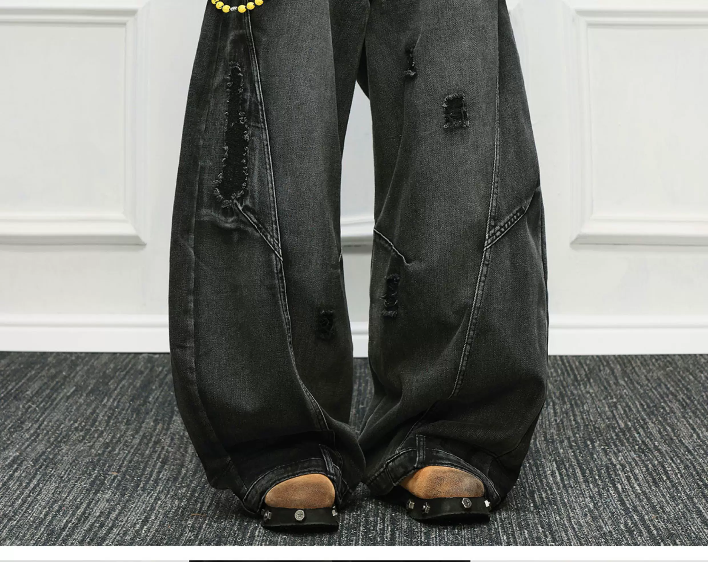 - Quần jean ống đứng rách phối vải chắp vá dành cho nam, thương hiệu thời trang xuân thu, phong cách Mỹ, quần ống rộng dài chạm đất cá tính.