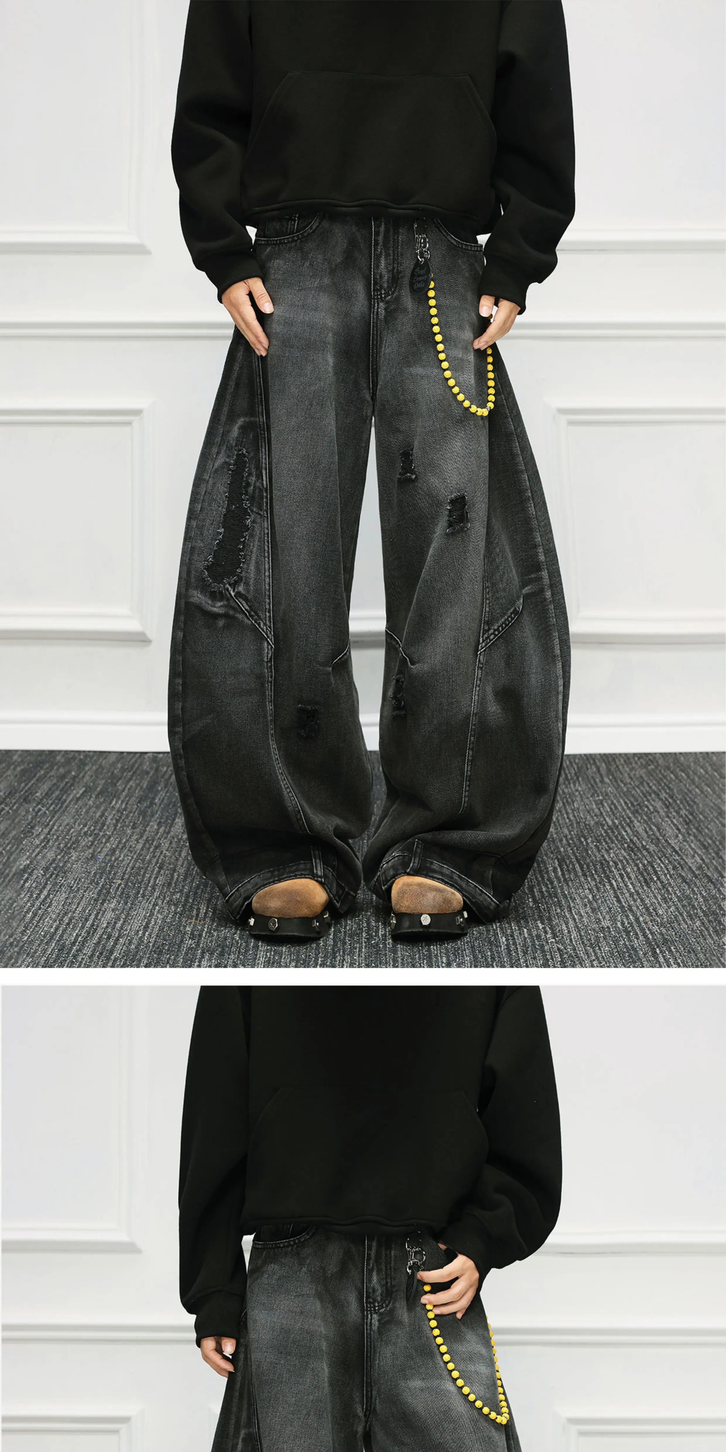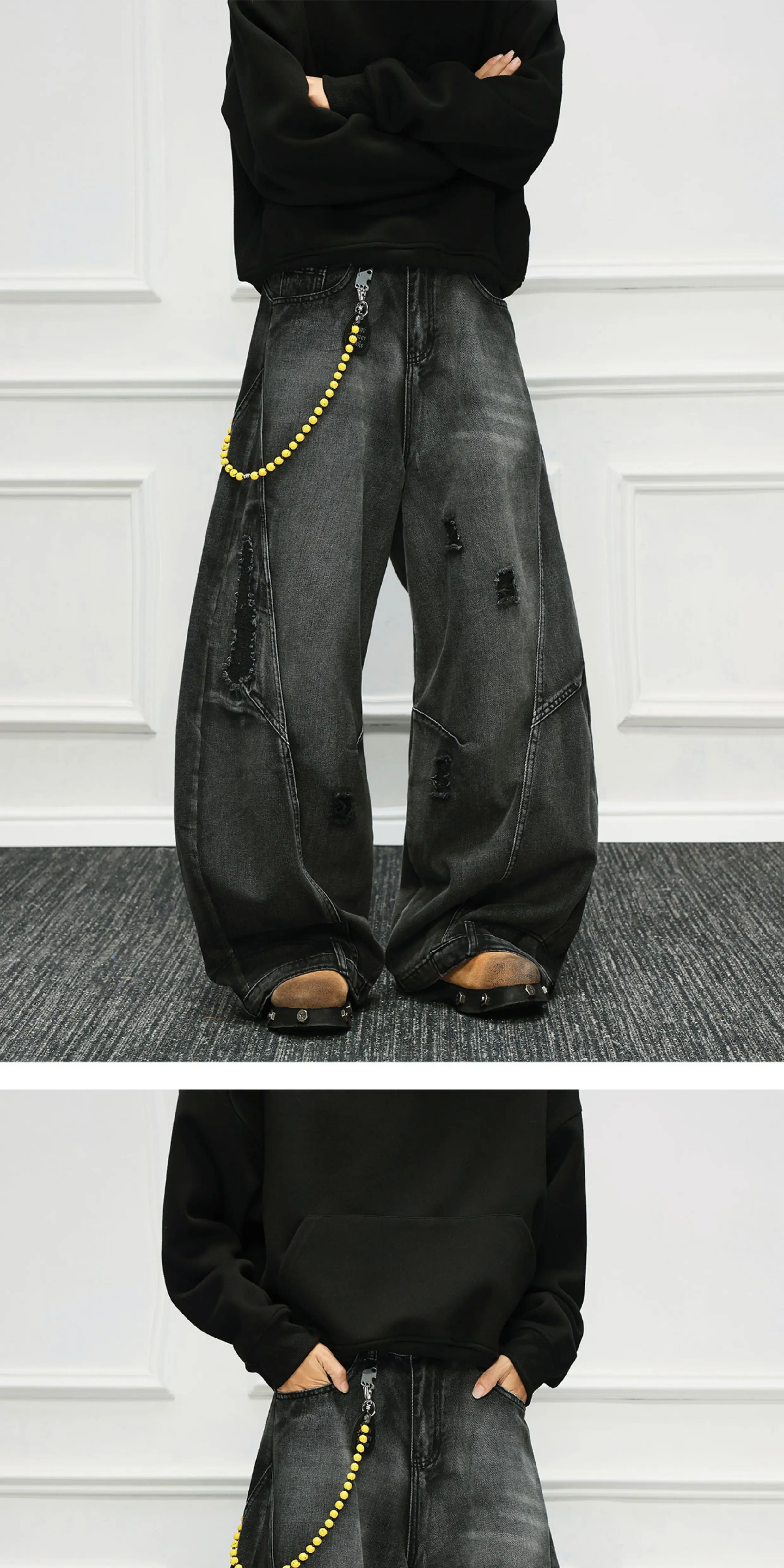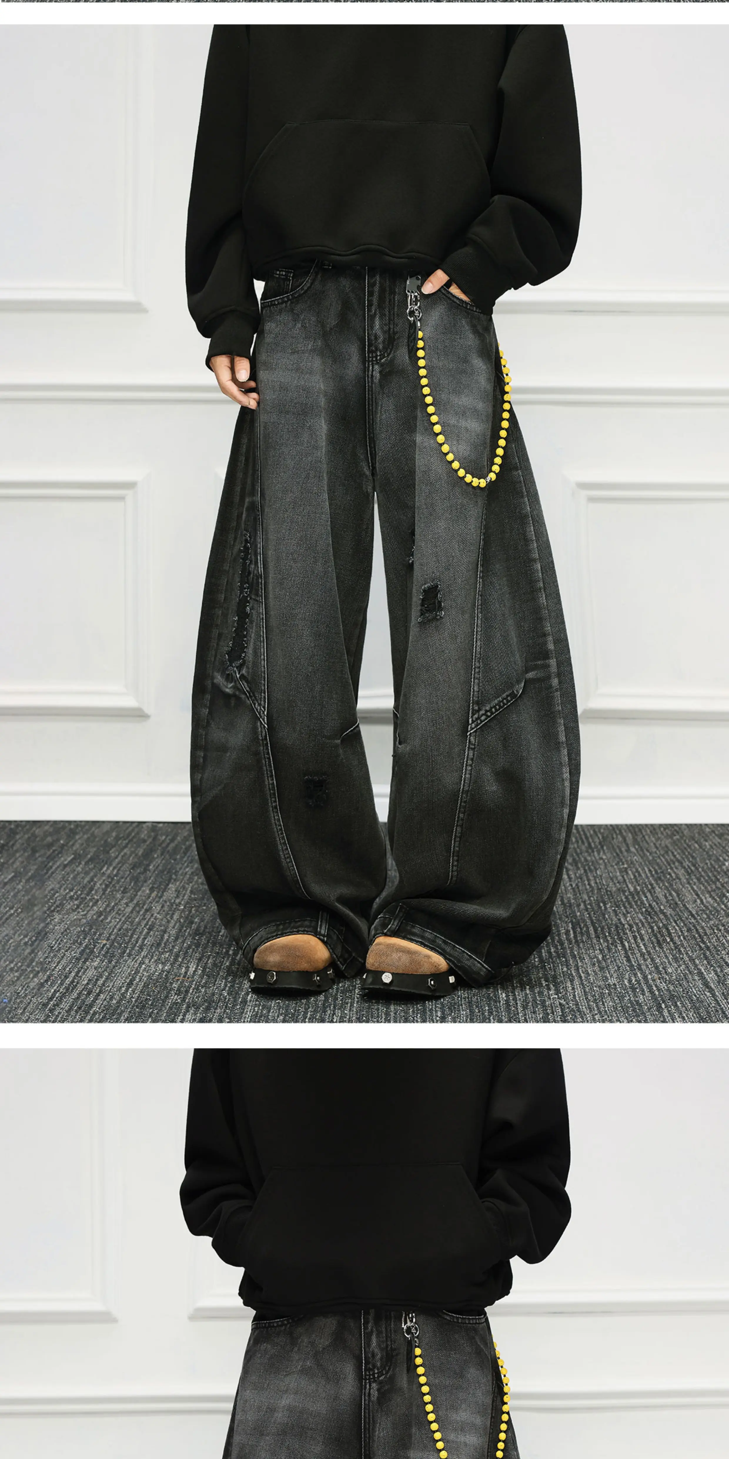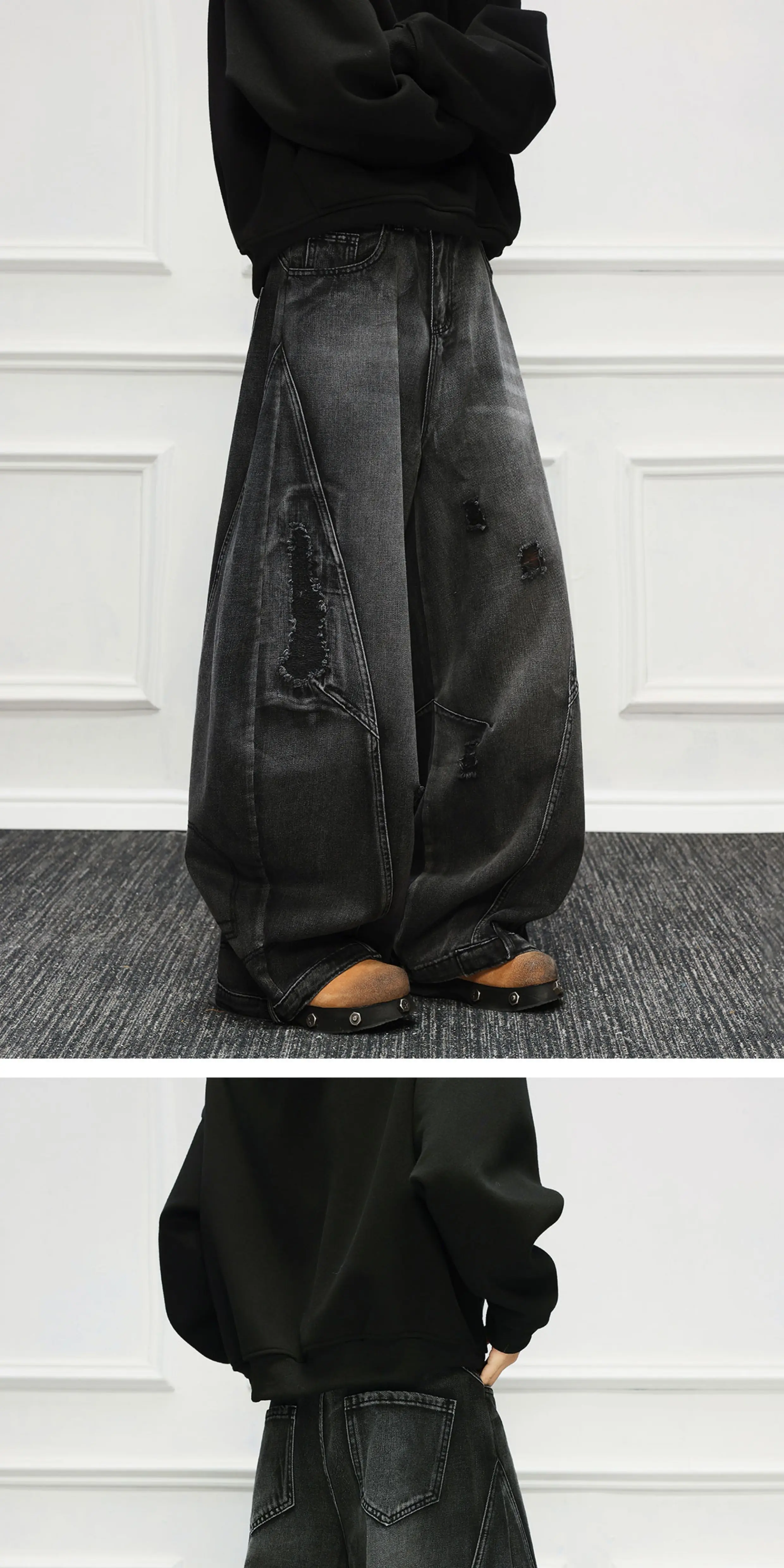 Quần jean ống đứng rách phối vải chắp vá dành cho nam, thương hiệu thời trang xuân thu, phong cách Mỹ, quần ống rộng dài chạm đất cá tính.