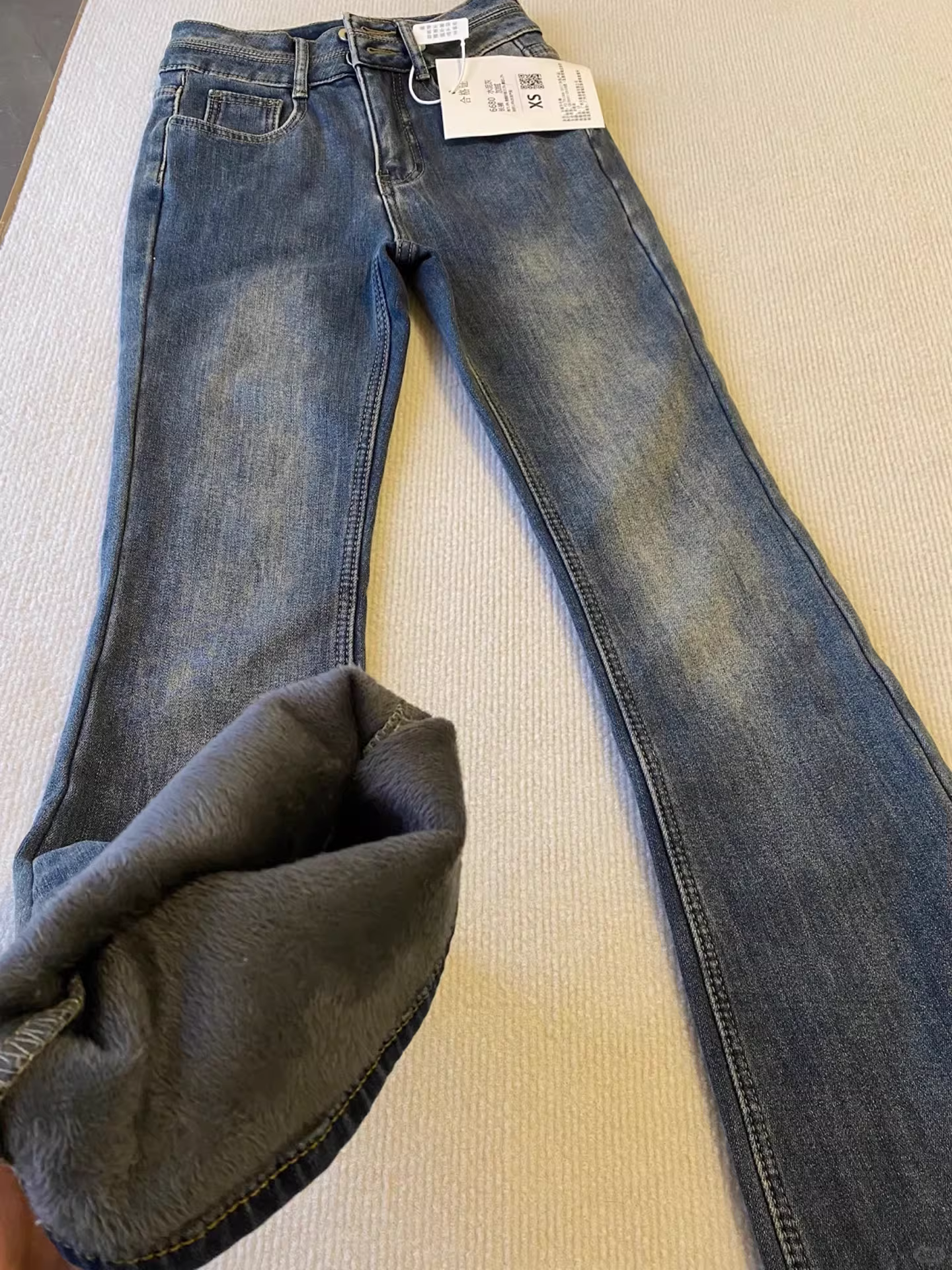 - Quần jean ống loe cổ điển dành cho nữ, mùa thu đông, cỡ lớn, lưng cao, co giãn, che hông, giảm béo, lót lông cừu, dày dặn, quần ống chuông