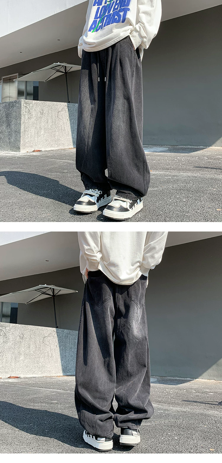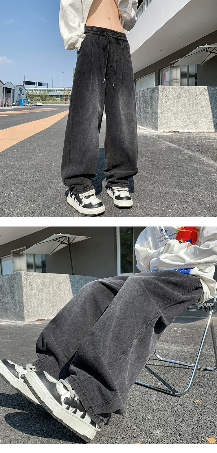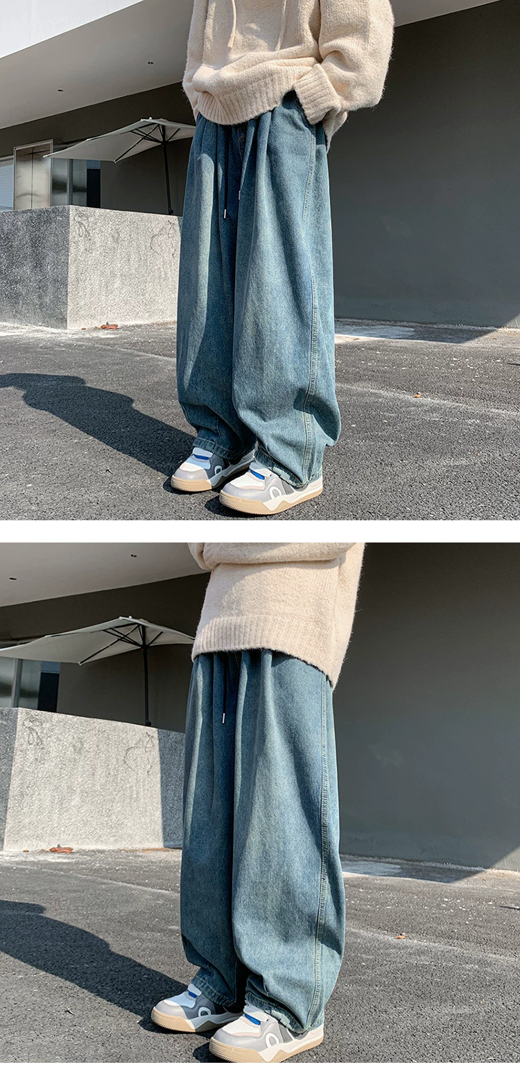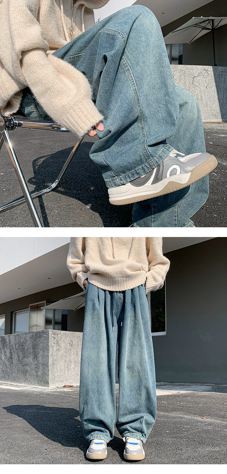 - Quần jean ống rộng kiểu Nhật dành cho nam, mùa xuân thu, thương hiệu thời thượng, giặt mài và tạo hiệu ứng cũ, dáng rộng, quần dài chạm đất phong cách thường ngày.