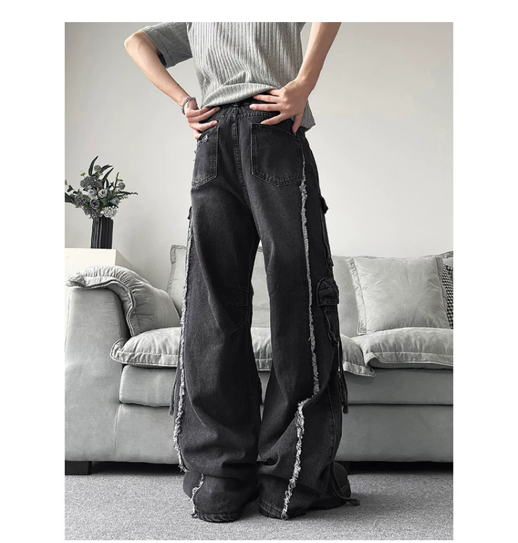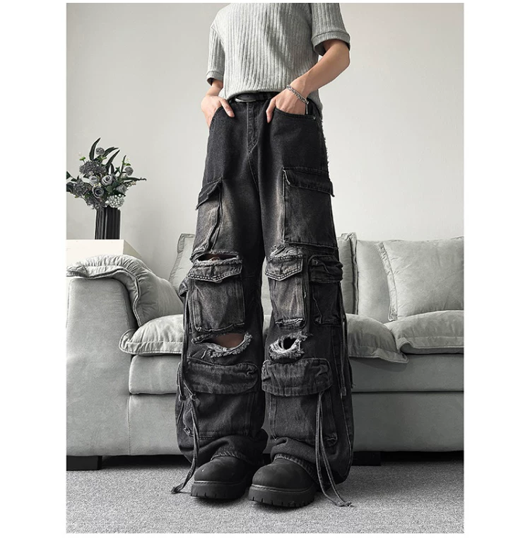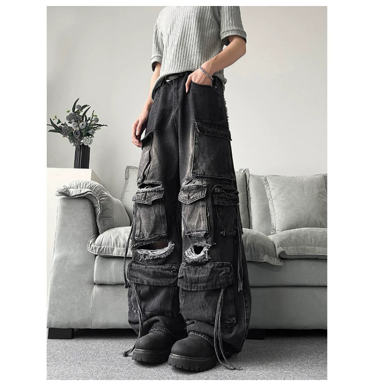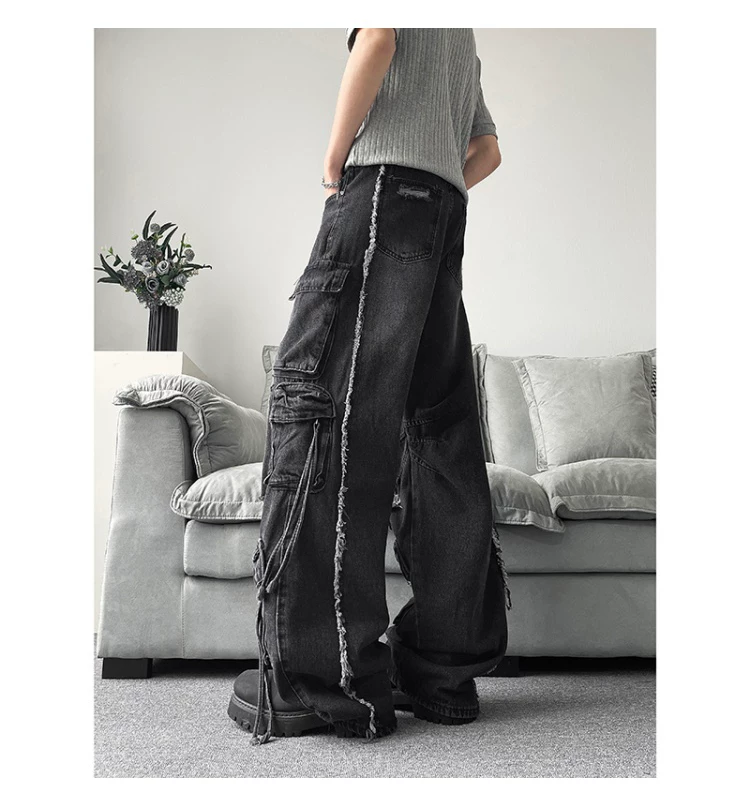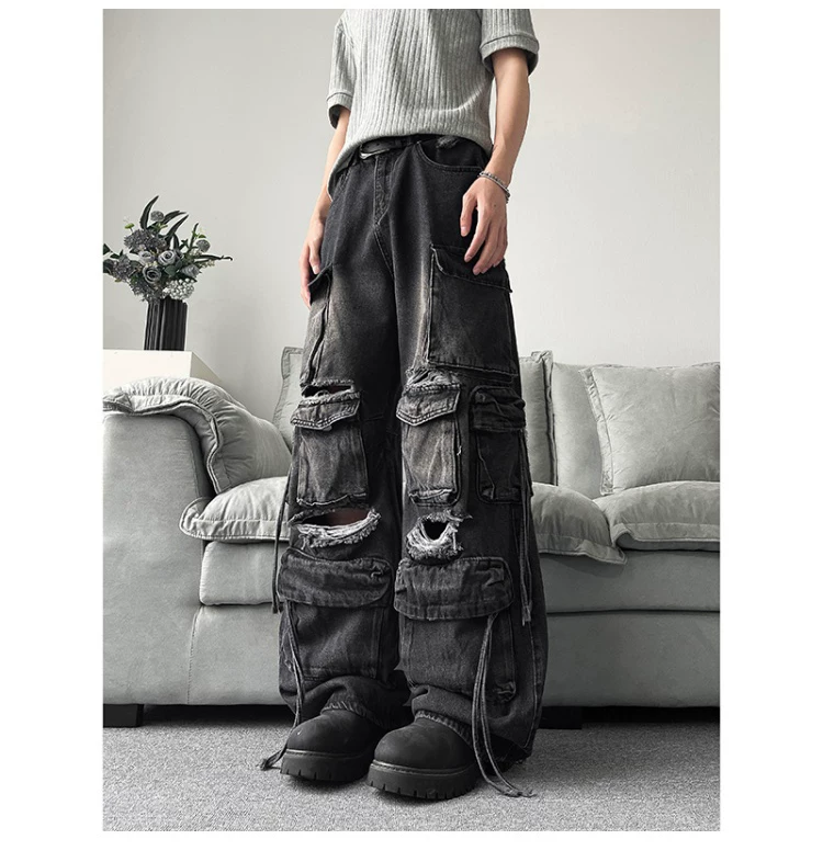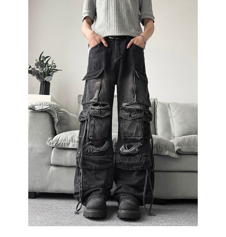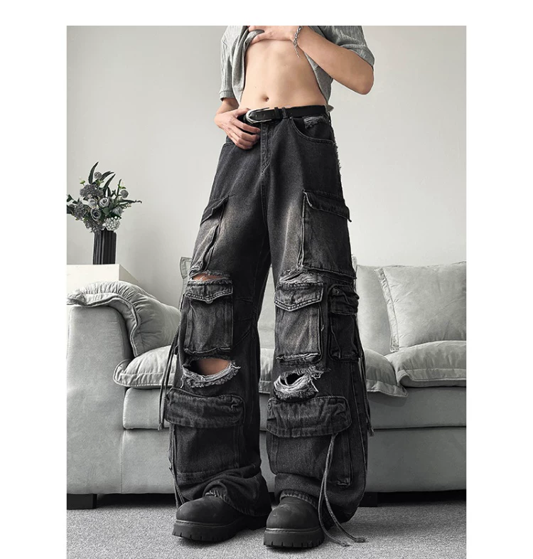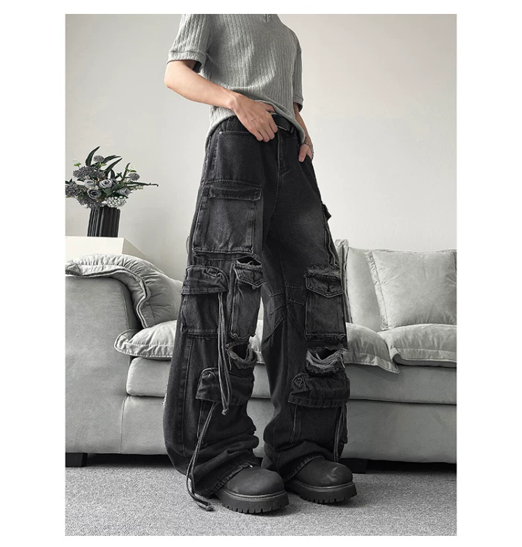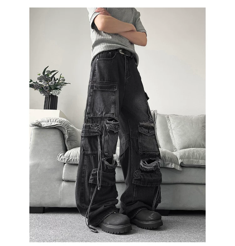 - Quần jean rách nhiều túi kiểu Mỹ dành cho nam, quần cargo rộng rãi thoải mái mùa hè, quần ống đứng phong cách đường phố thời thượng dành cho cặp đôi.