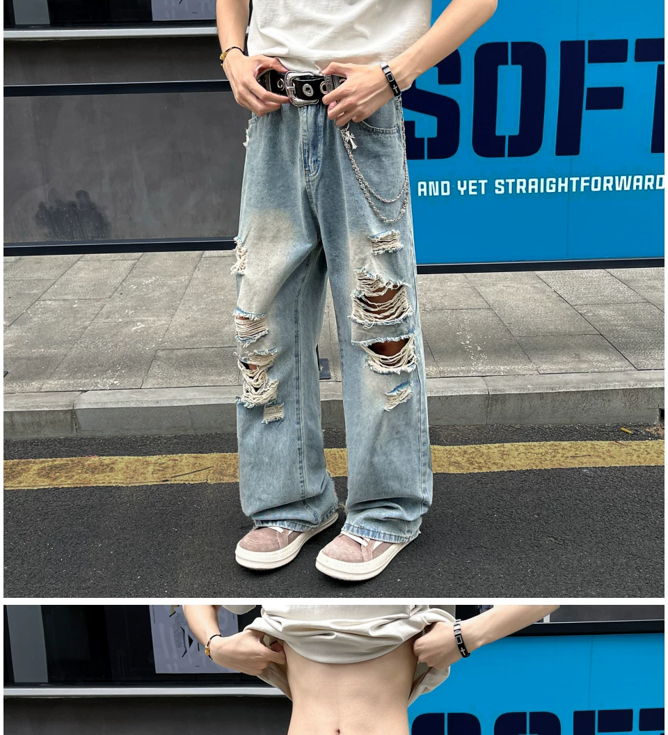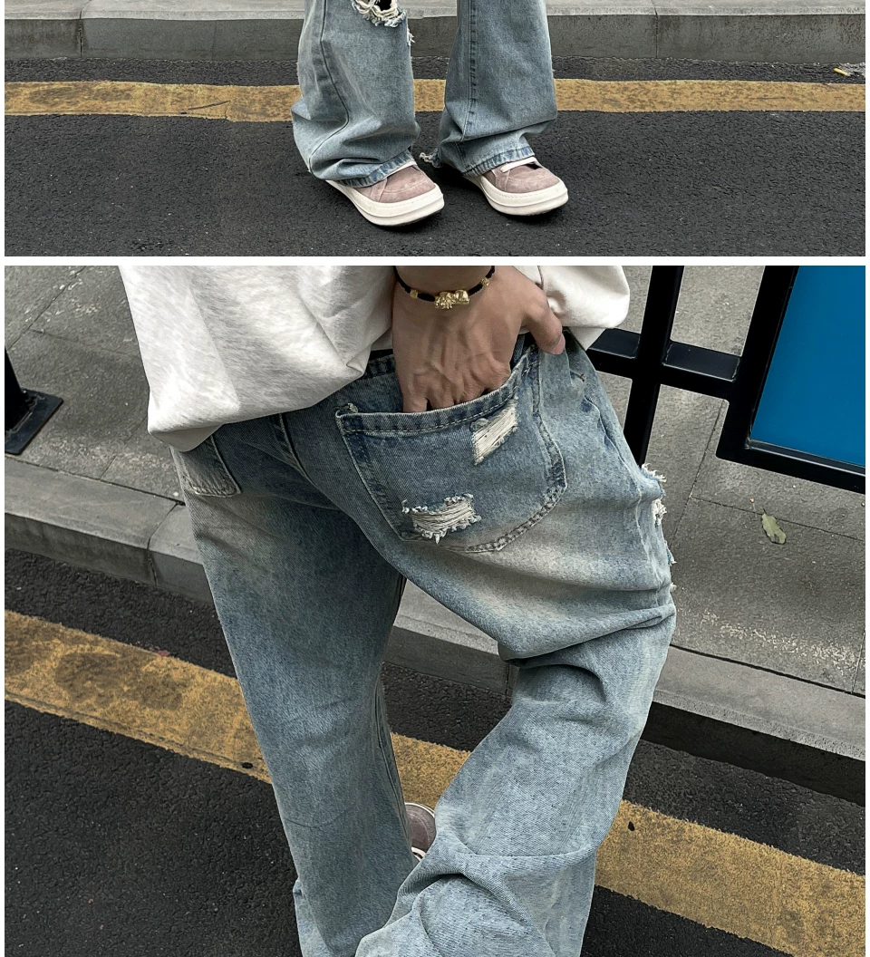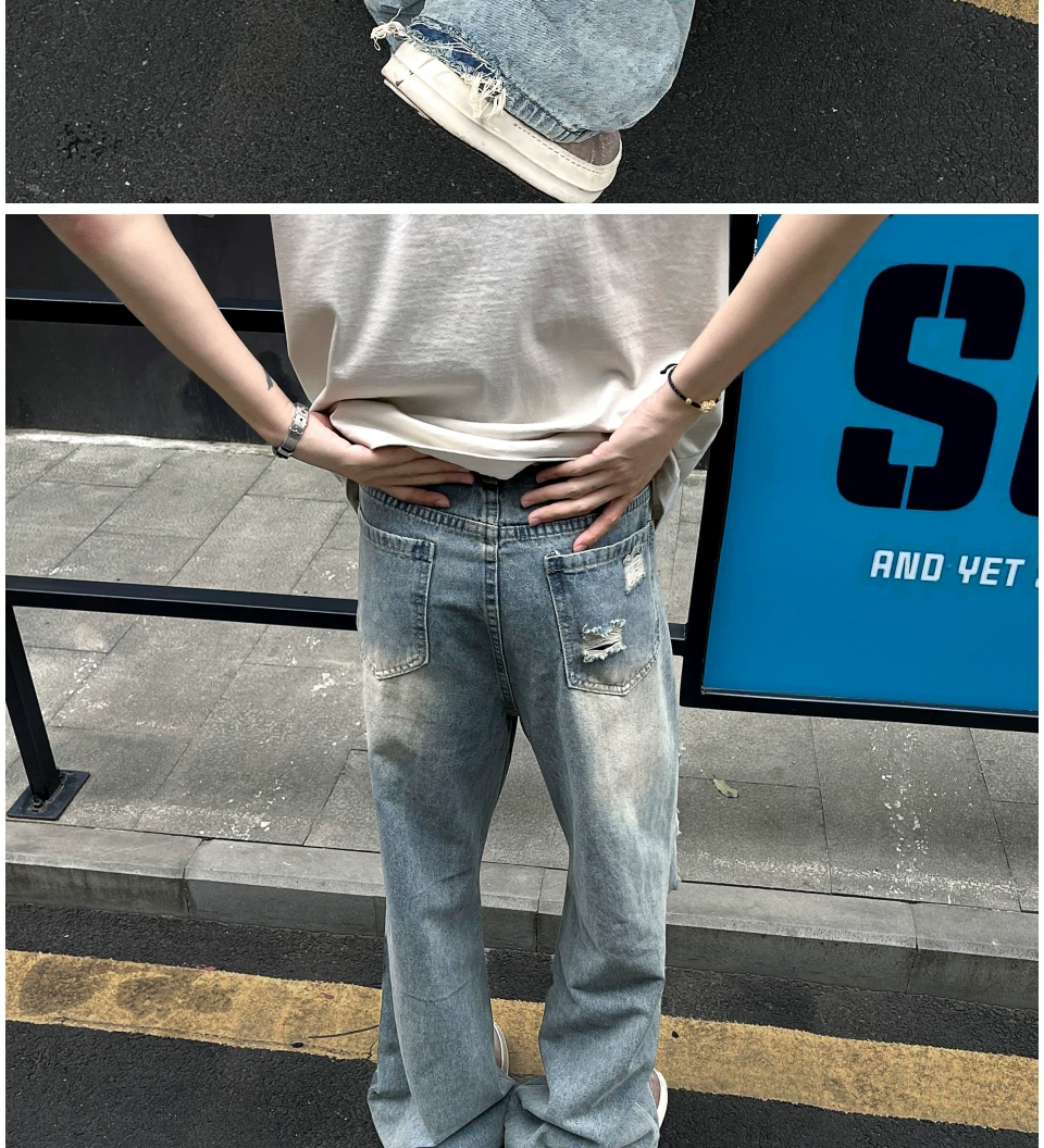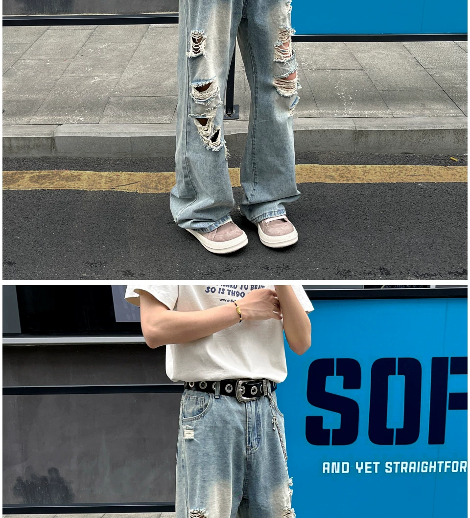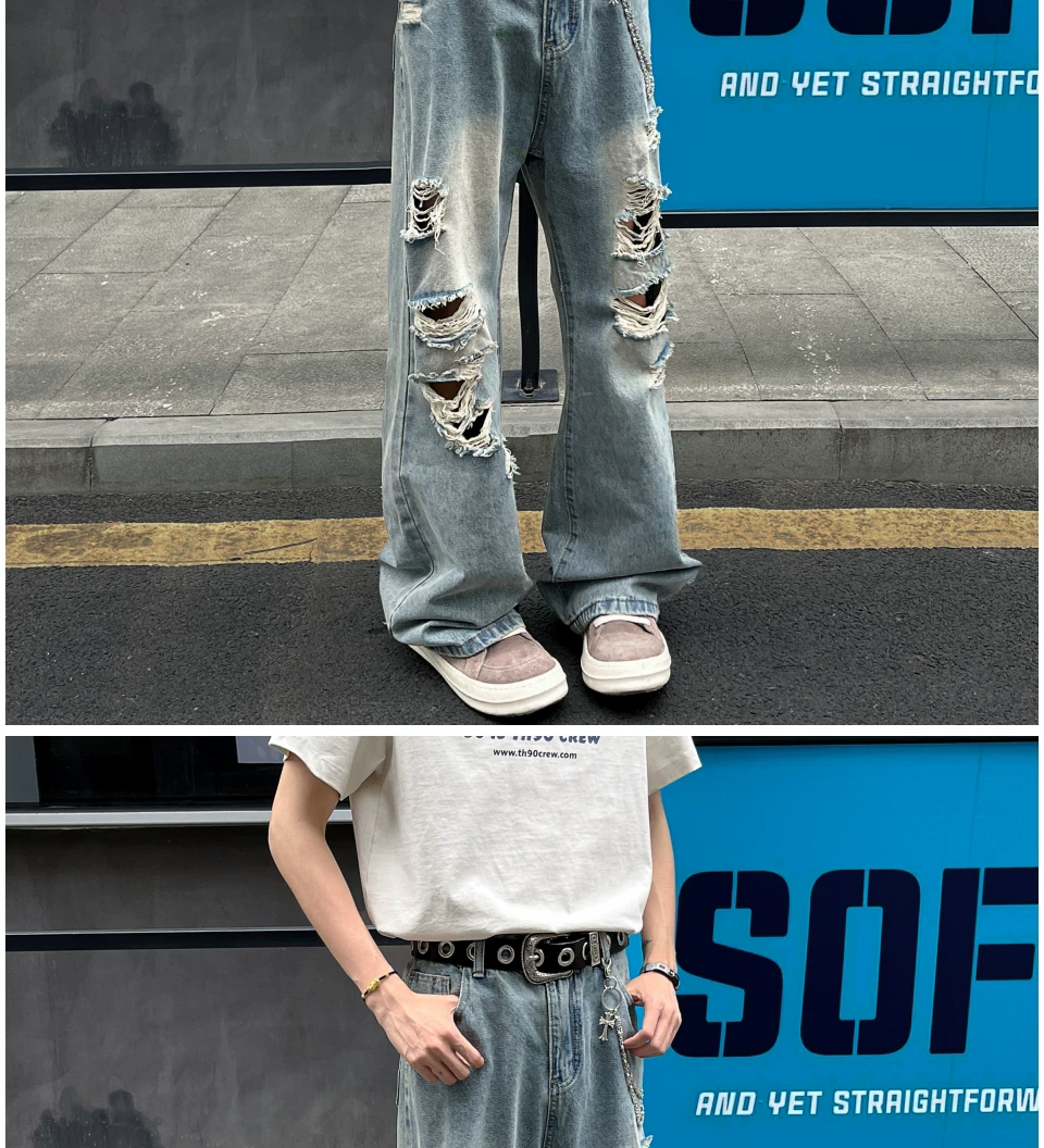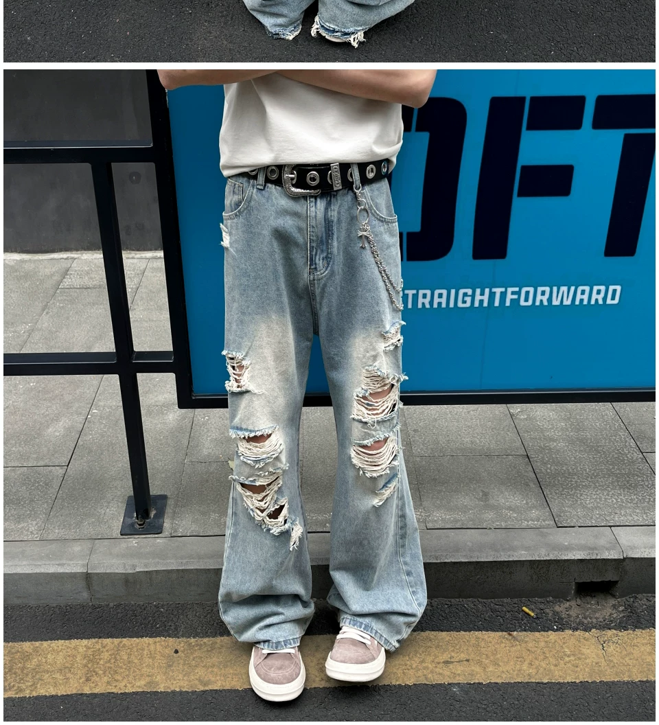 - Quần jean rách thời thượng dành cho nam, kiểu dáng mỏng mùa hè, quần ống loe kiểu Mỹ, rộng rãi và thoáng mát, quần dài chạm đất.