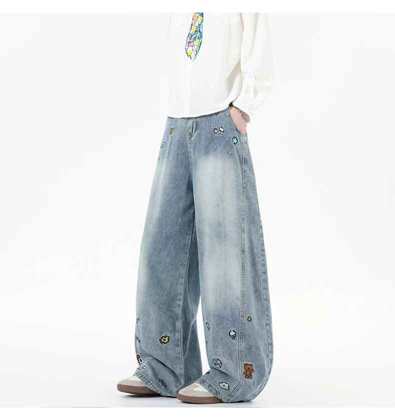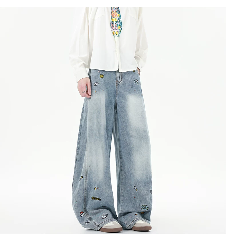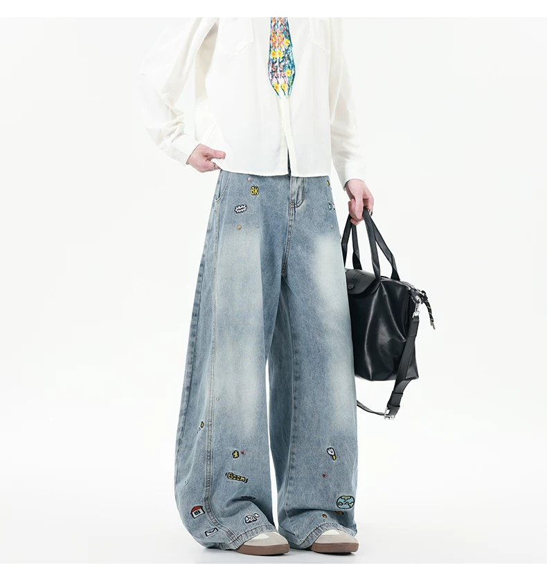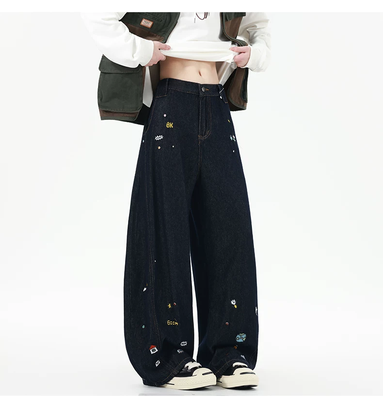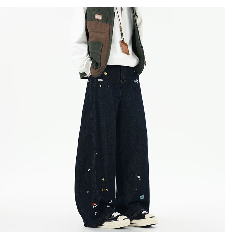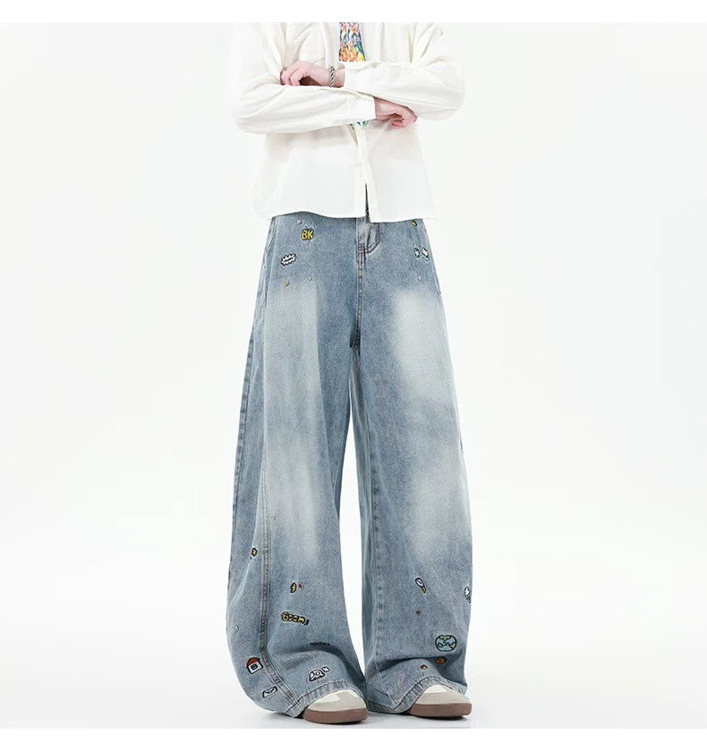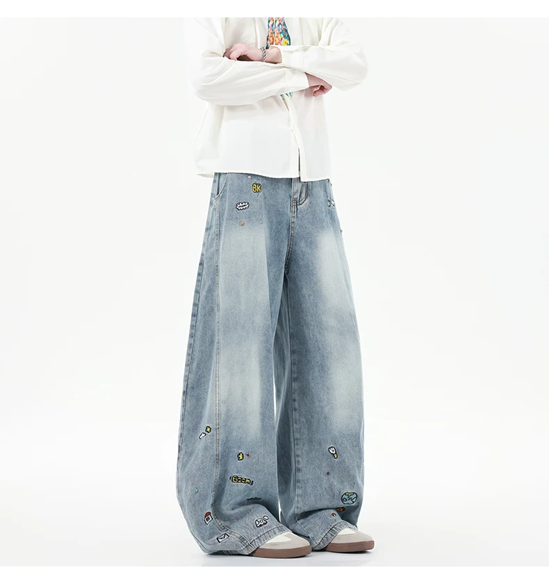 - Quần jean thêu hình kiếm phong cách Mỹ dành cho nam và nữ, quần dài ống đứng giặt mài thời thượng, quần ống rộng đa năng dành cho các cặp đôi.
