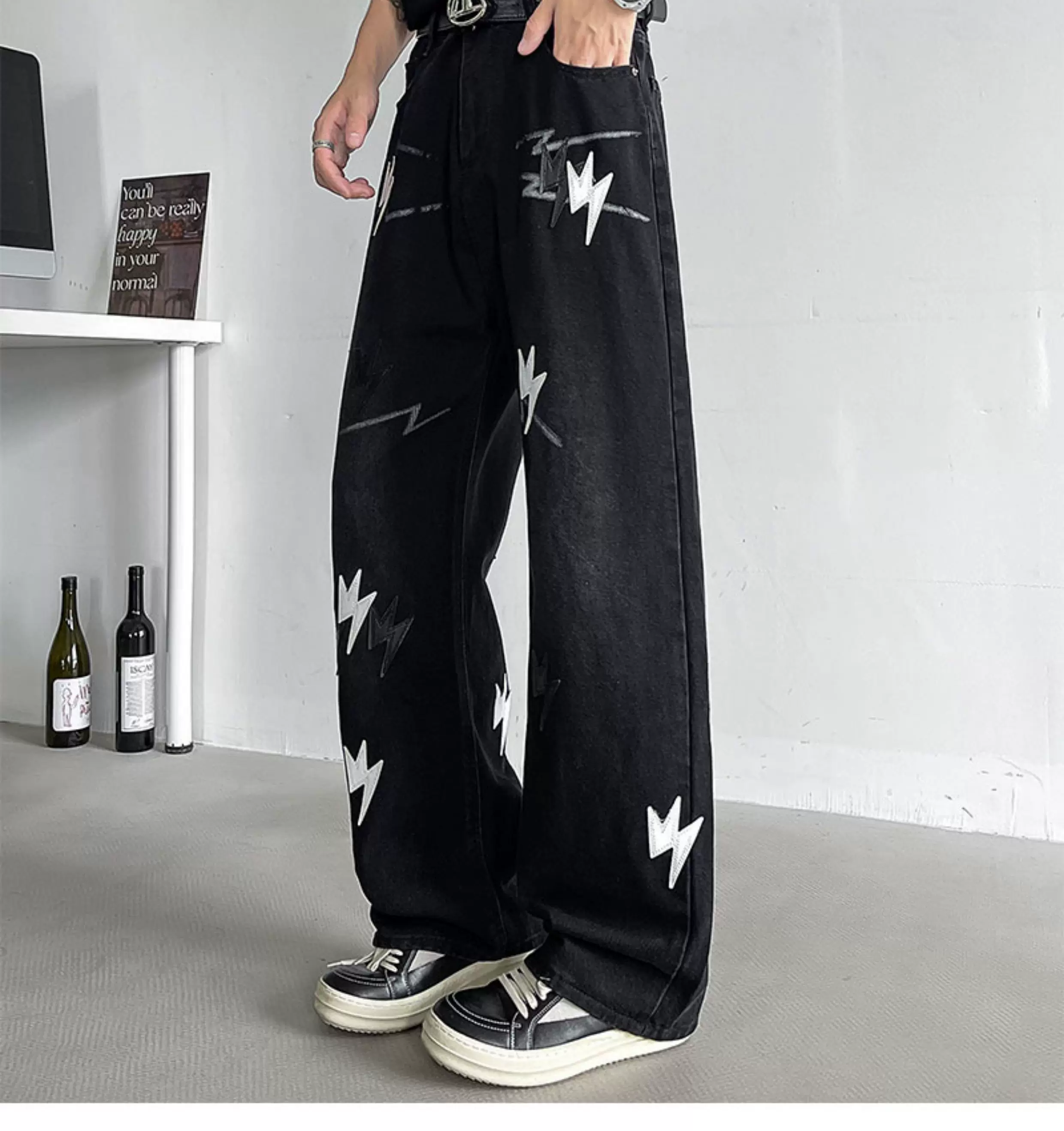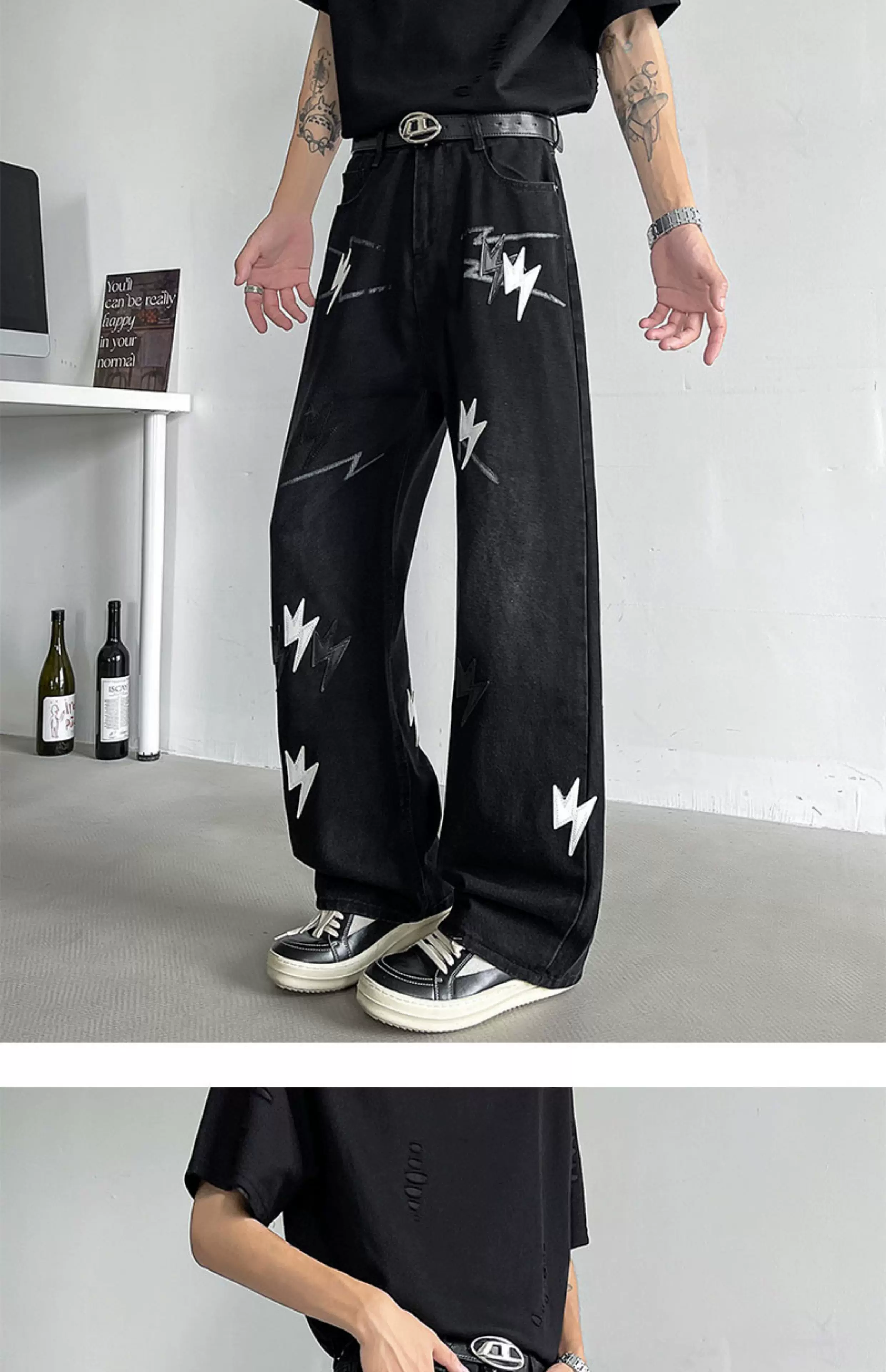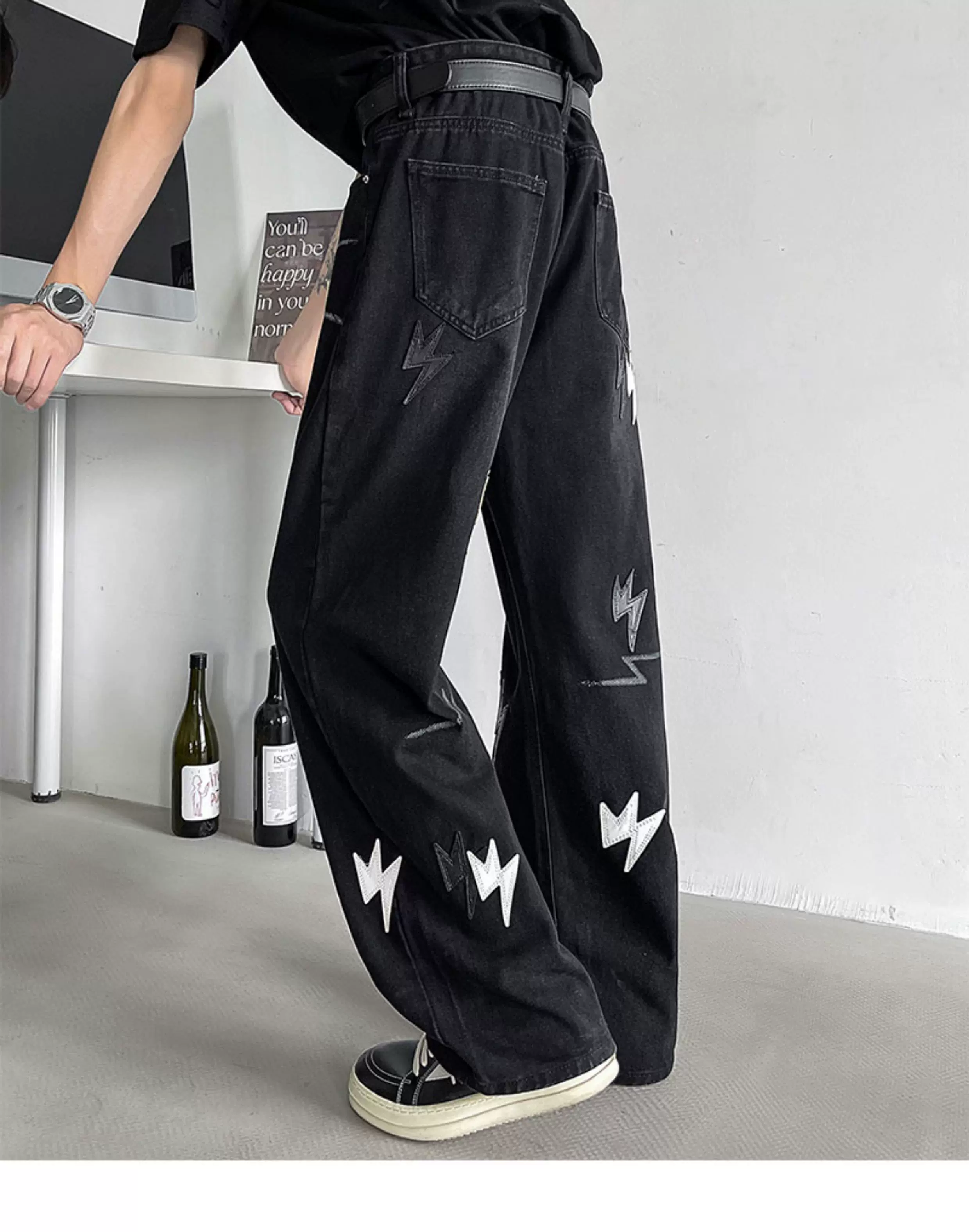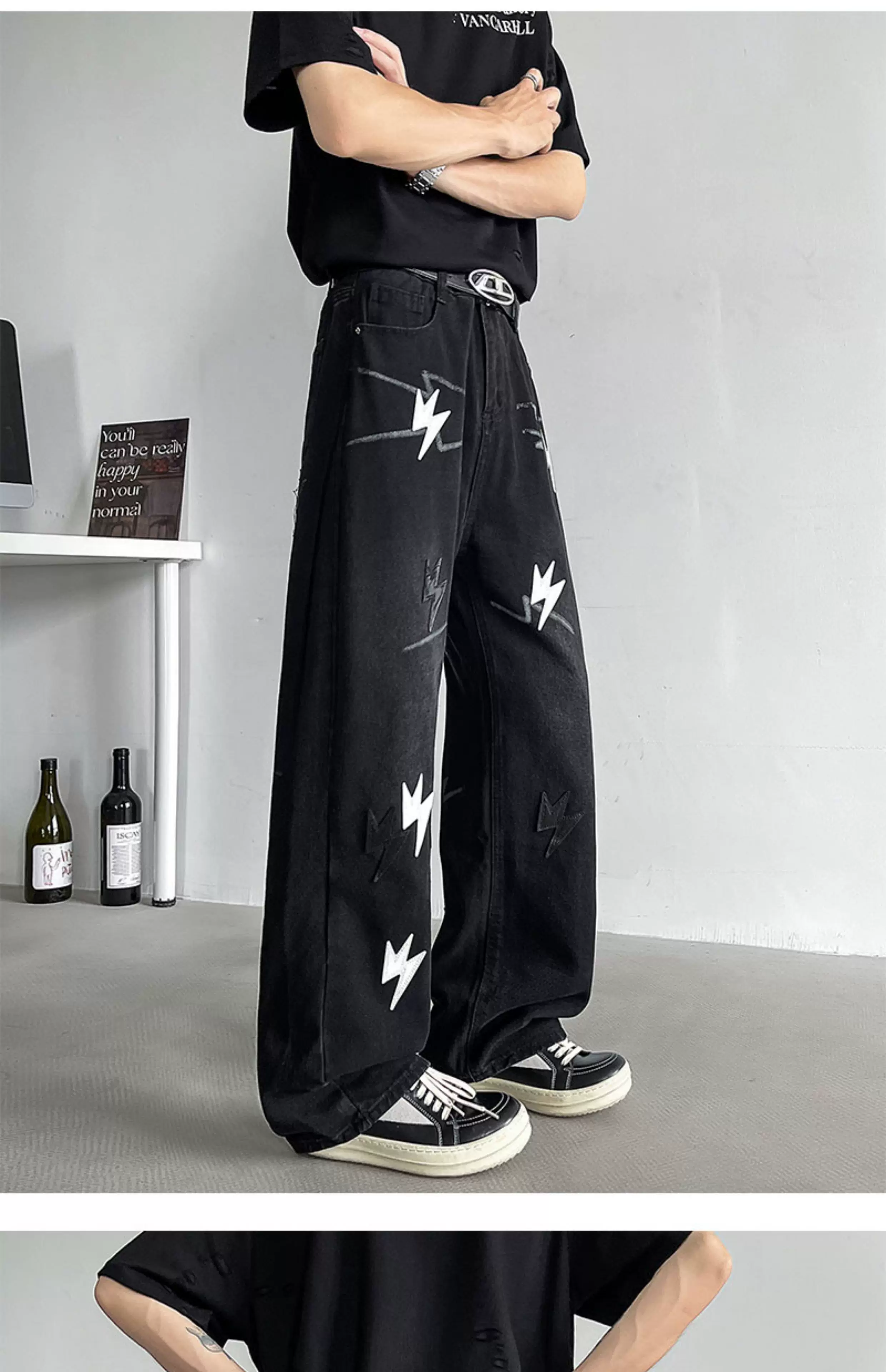 - Quần jean thêu họa tiết tia chớp kiểu Mỹ dành cho nam, quần ống rộng dáng suông thời thượng mùa hè mới, quần ống loe phong cách đường phố cá tính.