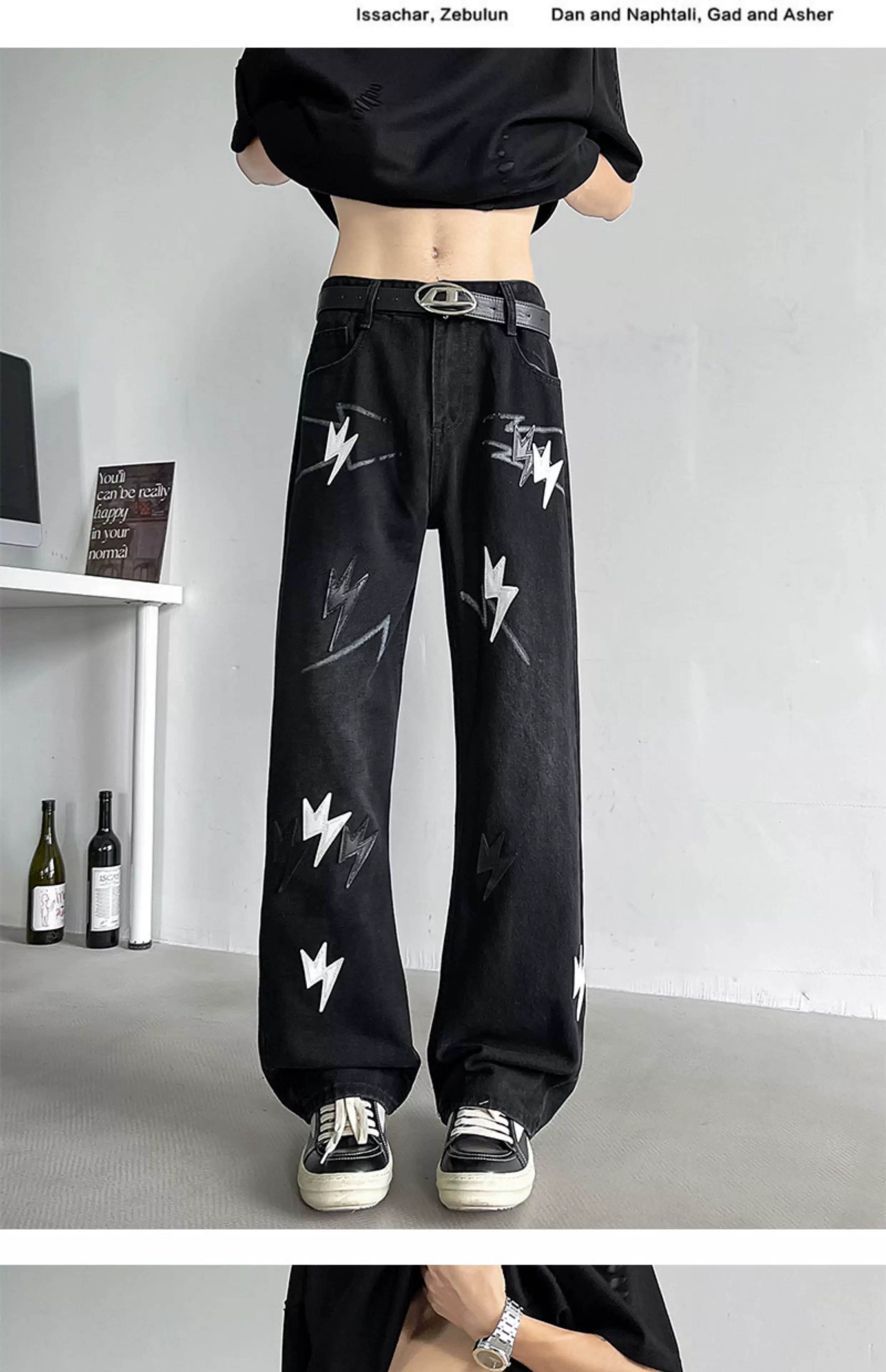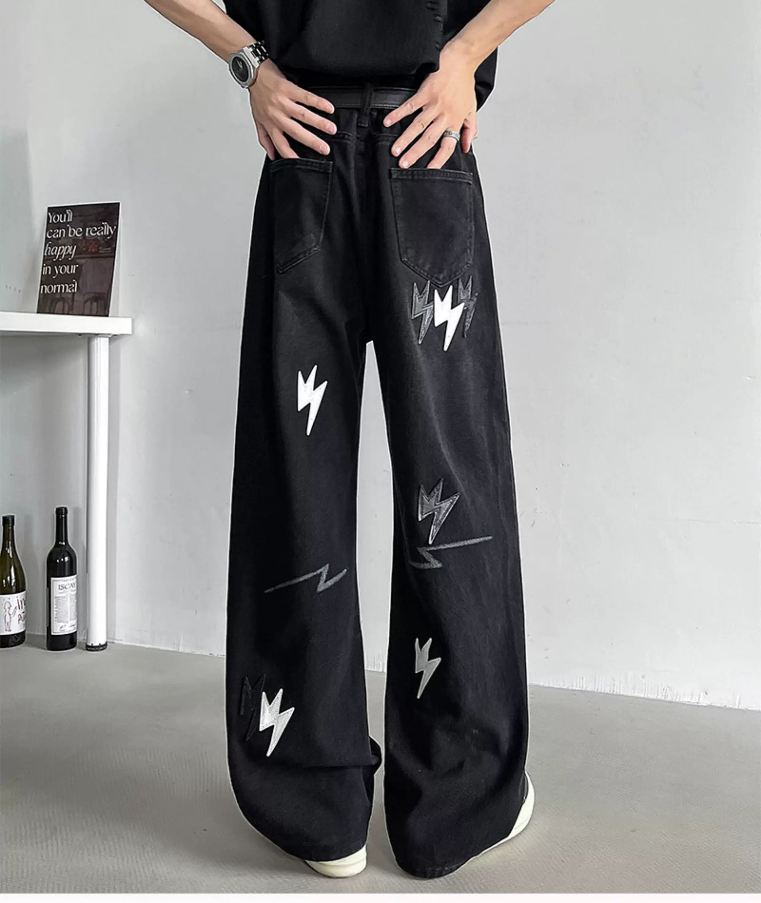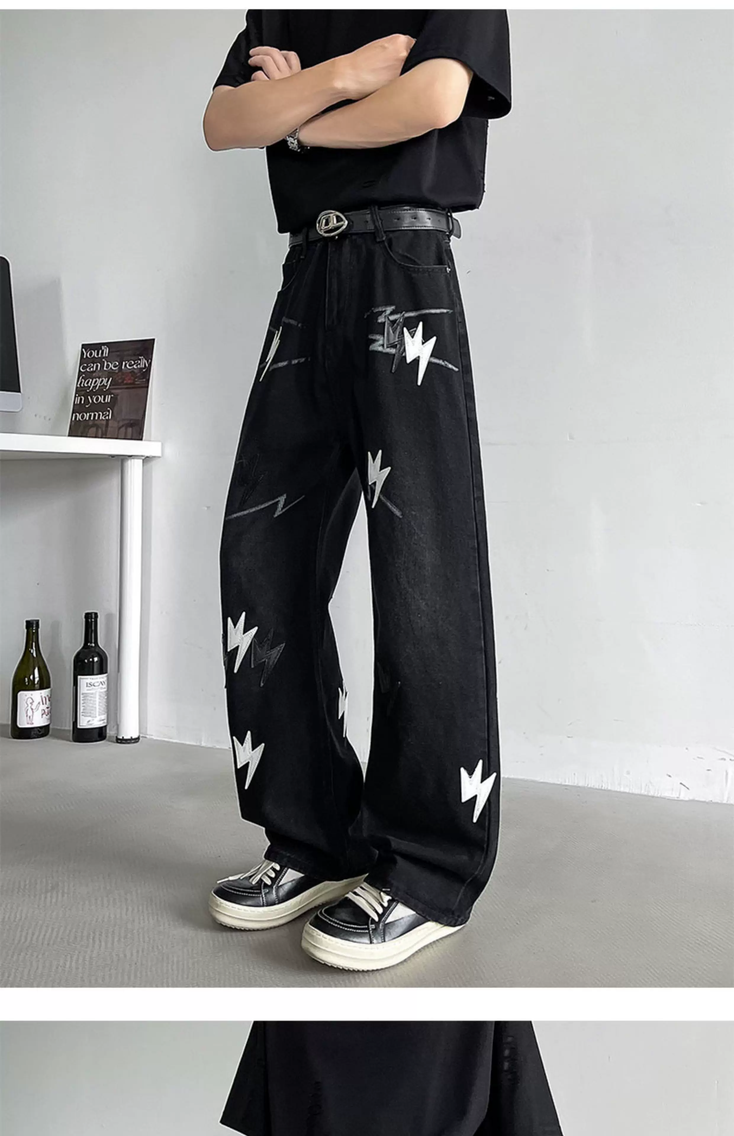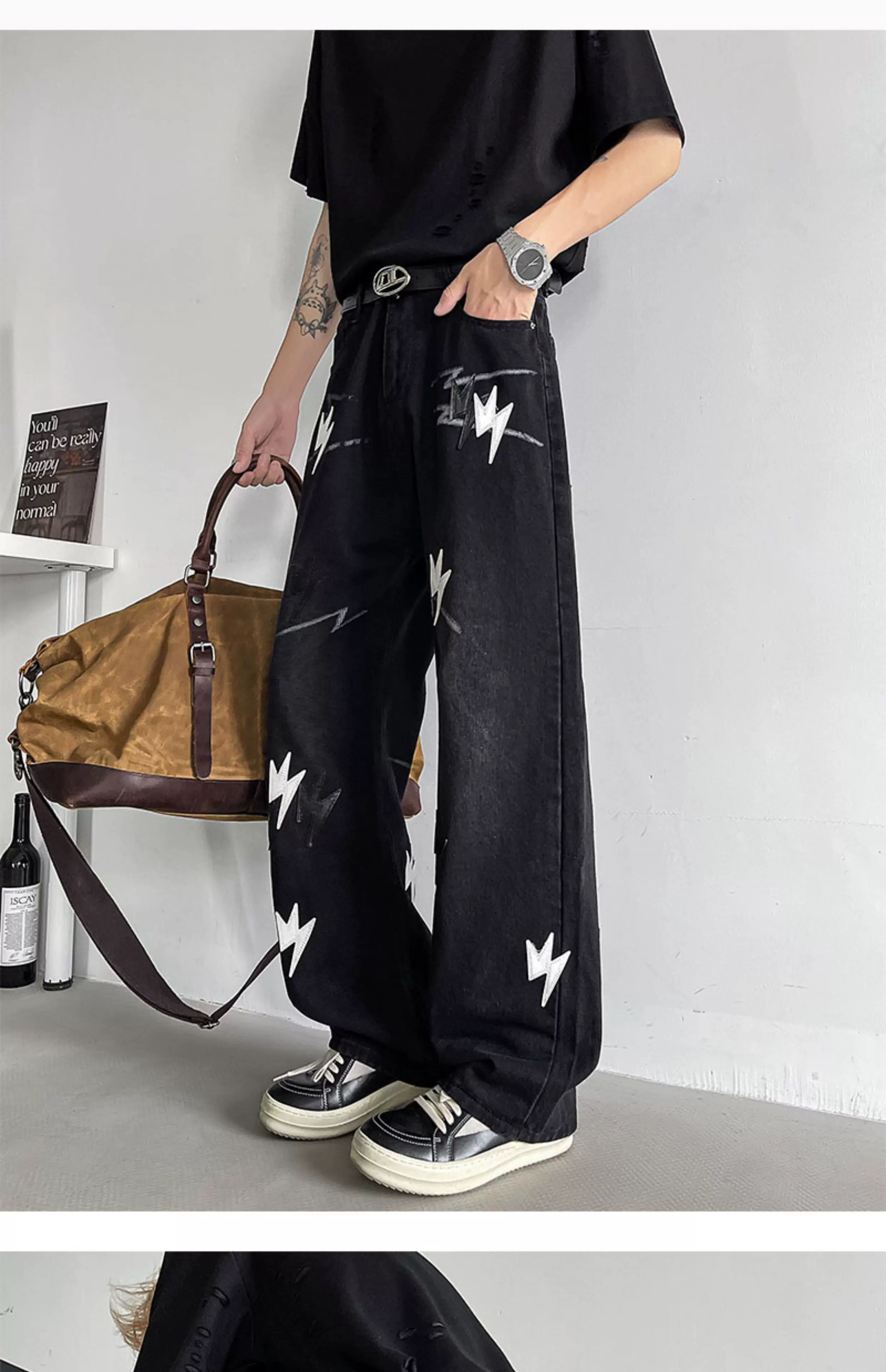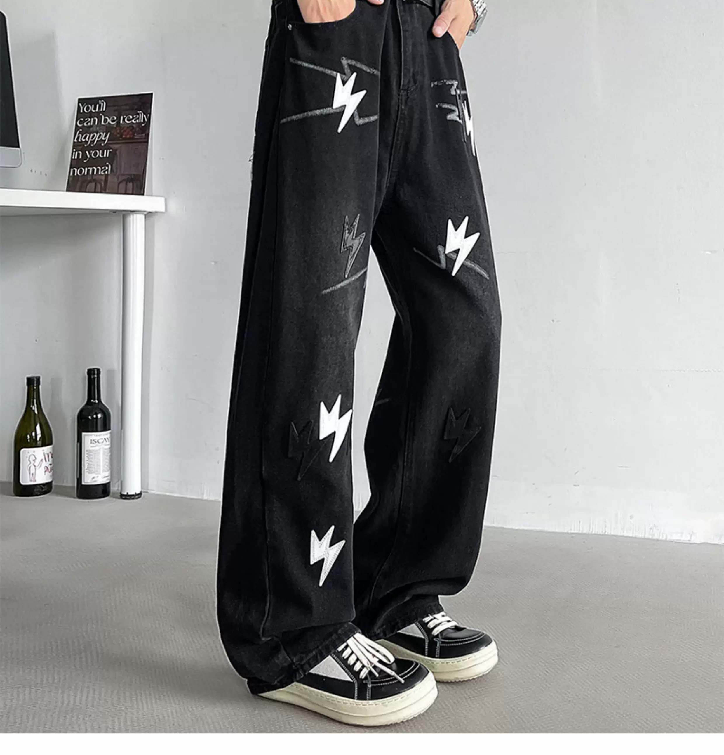 - Quần jean thêu họa tiết tia chớp kiểu Mỹ dành cho nam, quần ống rộng dáng suông thời thượng mùa hè mới, quần ống loe phong cách đường phố cá tính.