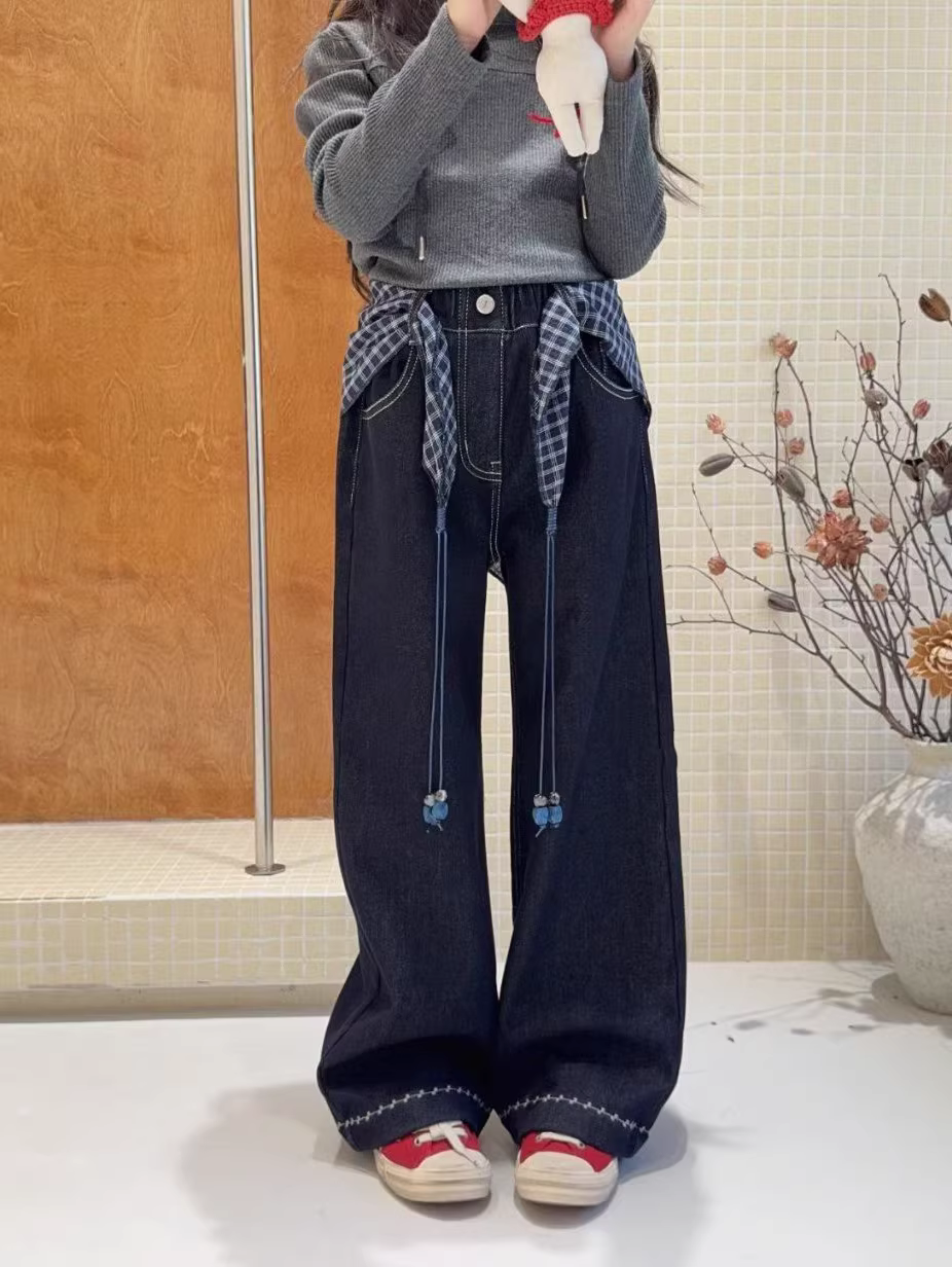 Quần jean xòe lót lông màu xanh đậm dành cho bé gái phong cách mùa đông 2025, quần ống loe kẻ ca rô cho trẻ lớn, quần áo trẻ em