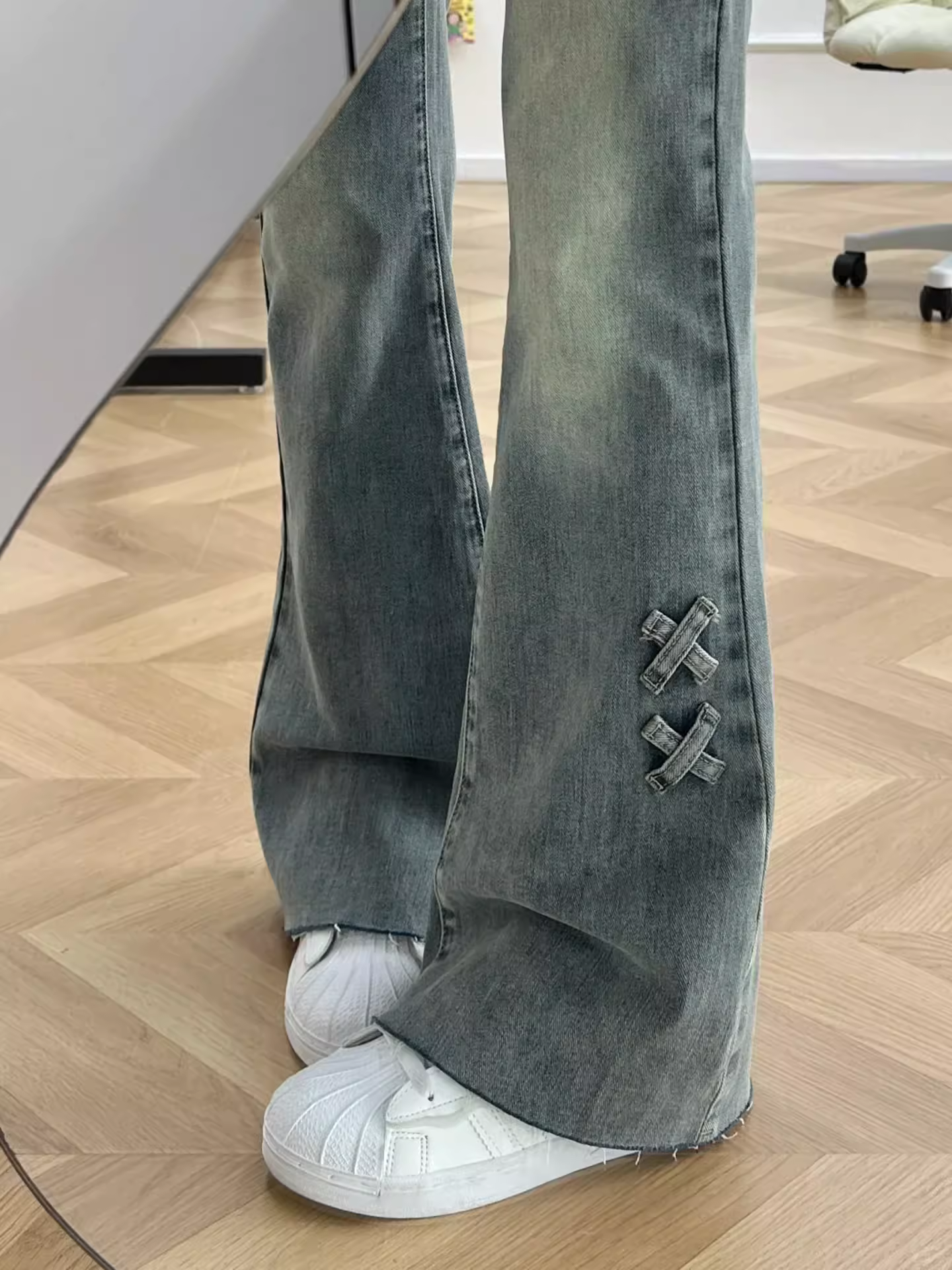 Quần jean xòe thắt nơ kiểu Mỹ cổ điển dành cho nữ, phong cách mùa thu mới, cỡ lớn, lưng cao, co giãn, quần ống loe thon gọn.