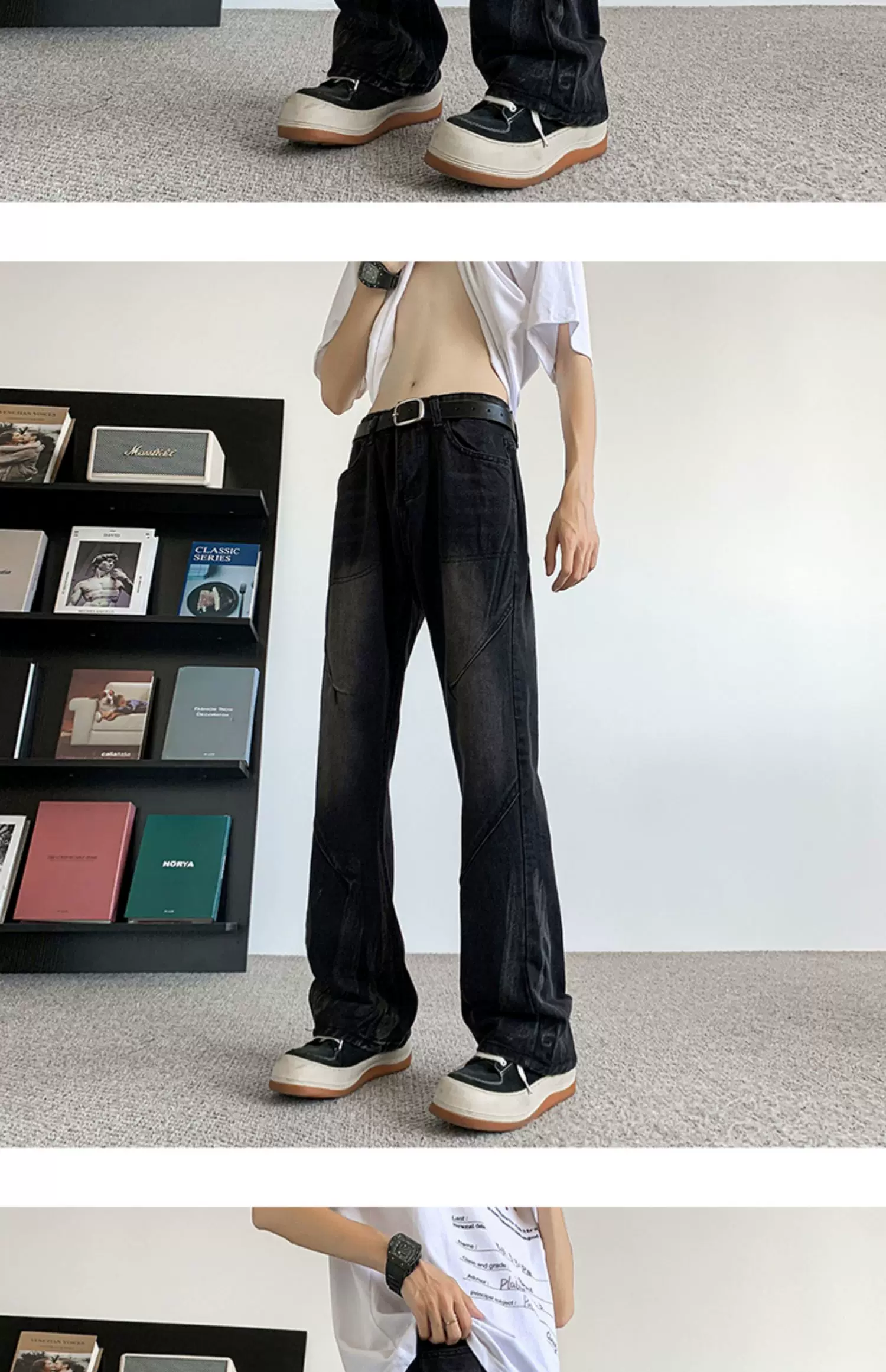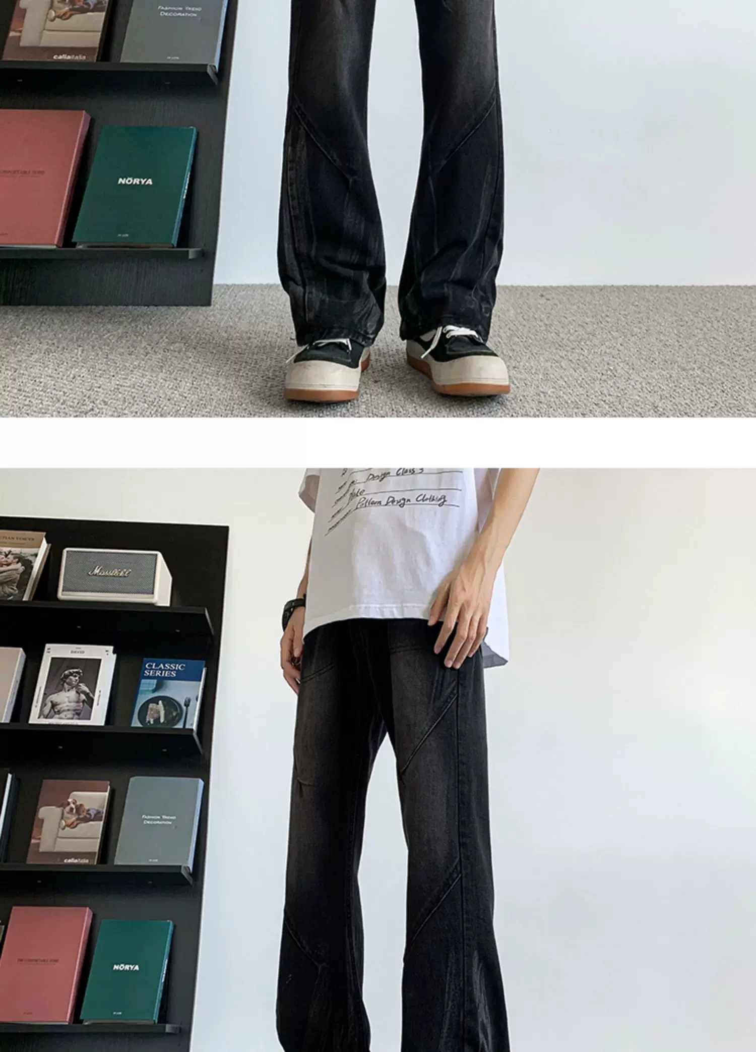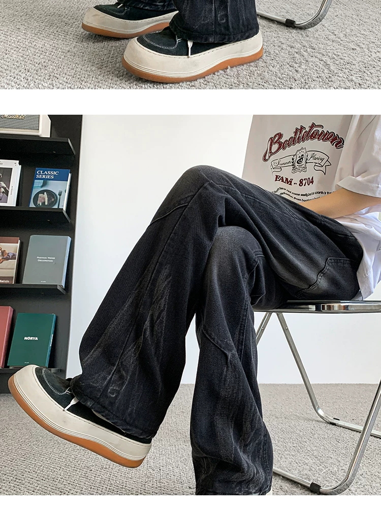 Quần jeans đen đa năng dành cho nam, quần dài phong cách đường phố Mỹ mùa xuân thu, quần dài ống loe rộng rãi, hợp thời trang, chất liệu washed.