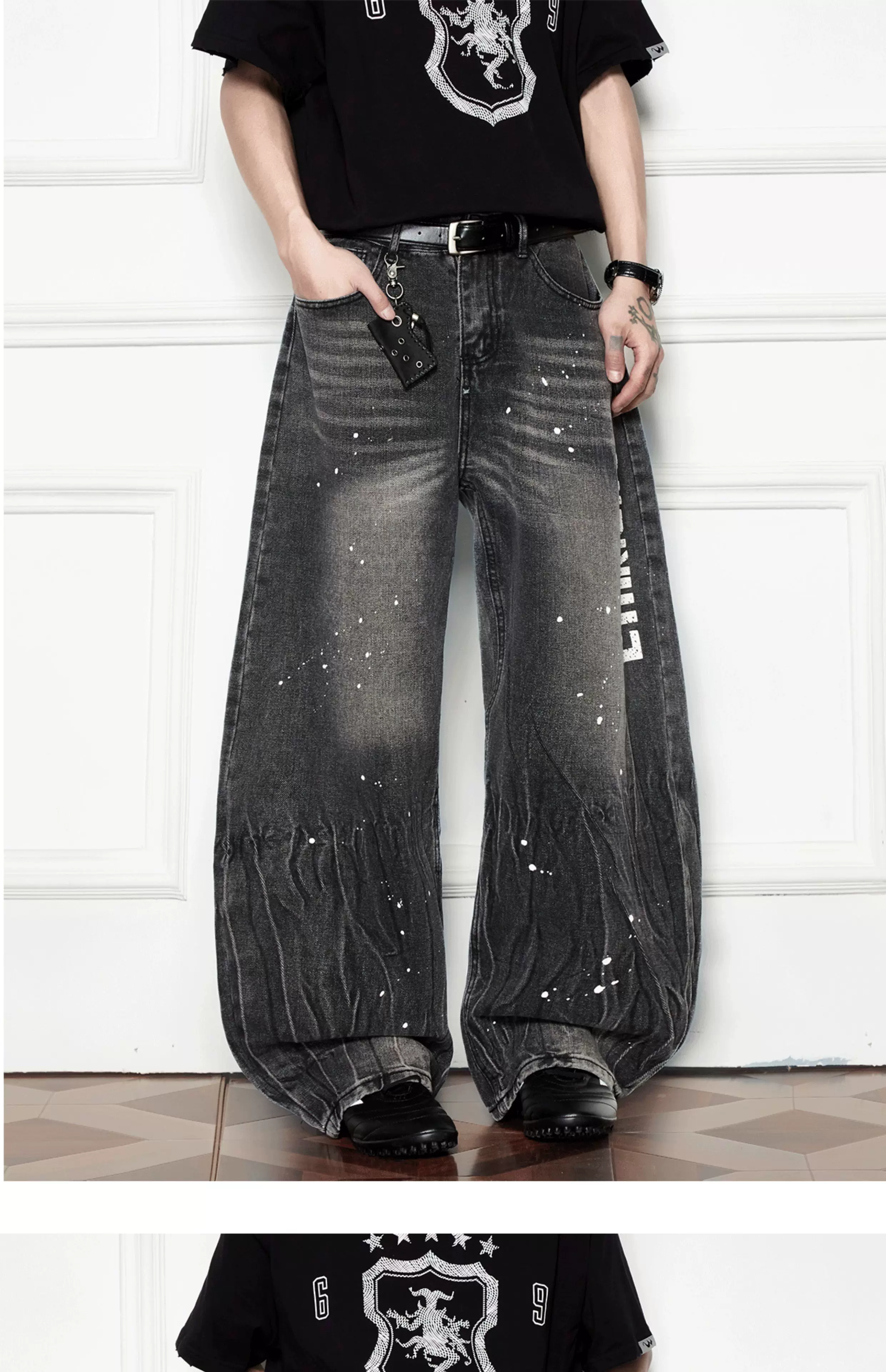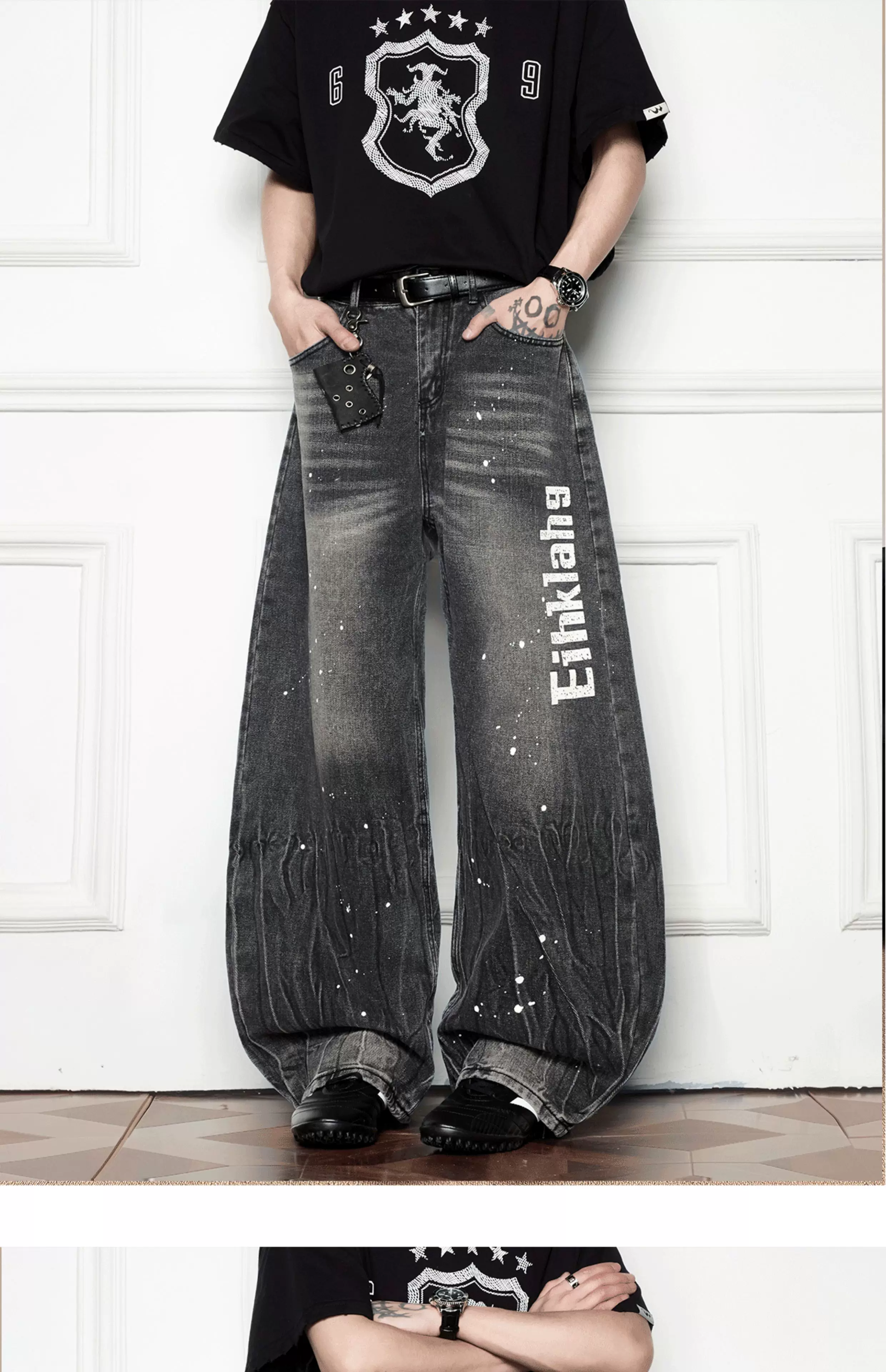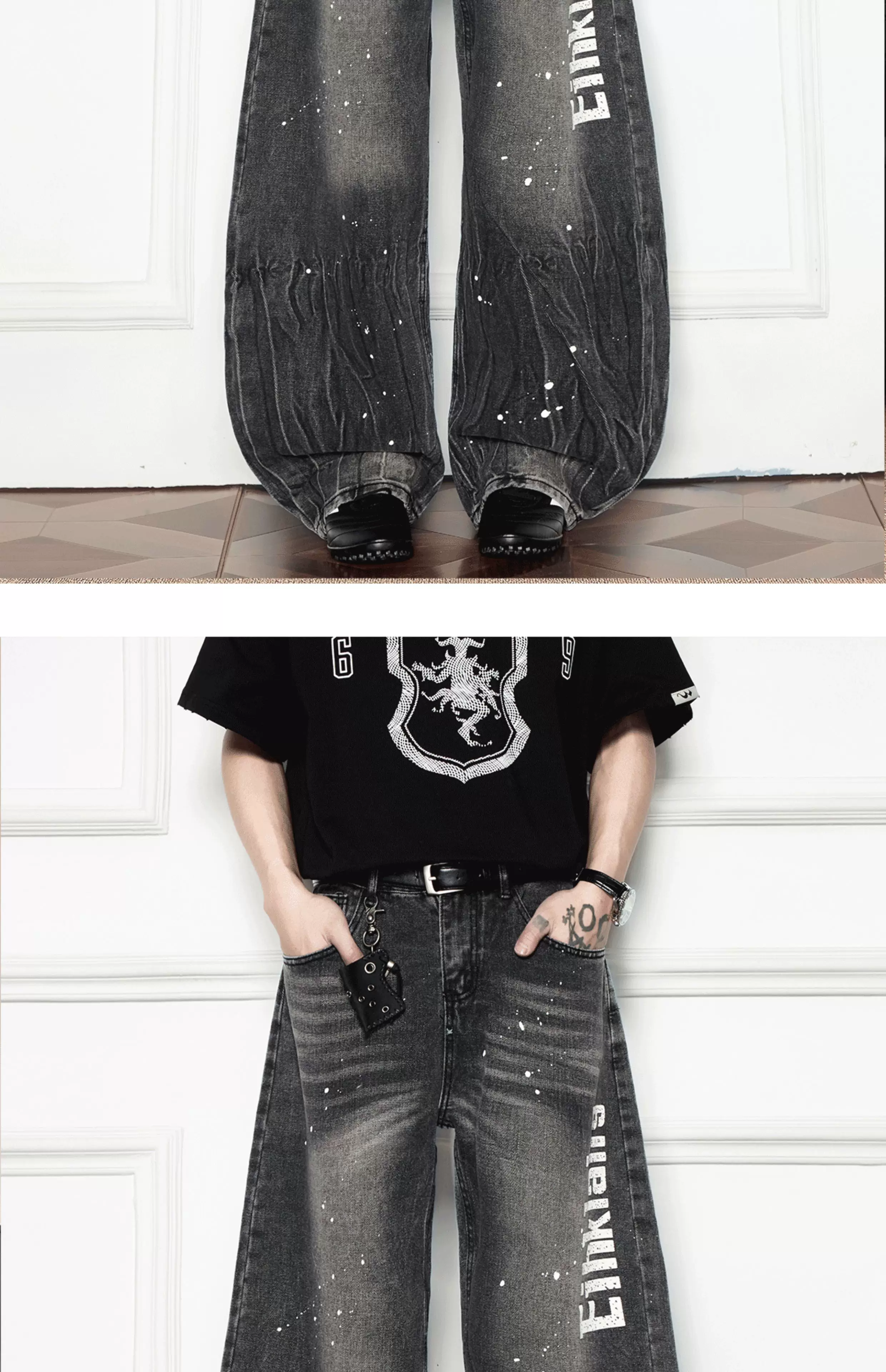 Quần jeans in chữ kiểu splash-ink dành cho nam, thương hiệu thời trang phong cách Mỹ, dáng rộng ống thẳng, quần bố vintage đã qua xử lý giặt mềm.