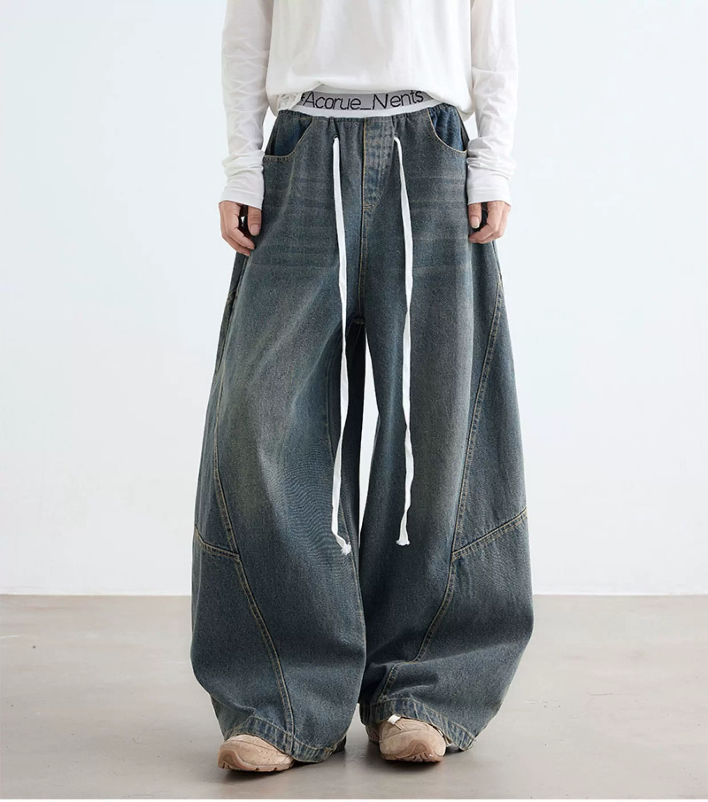 Quần jeans kiểu Mỹ dành cho nam và nữ, quần ống đứng dáng rộng, thiết kế độc đáo, cạp chun, dài chạm sàn, thuộc thương hiệu thời thượng.