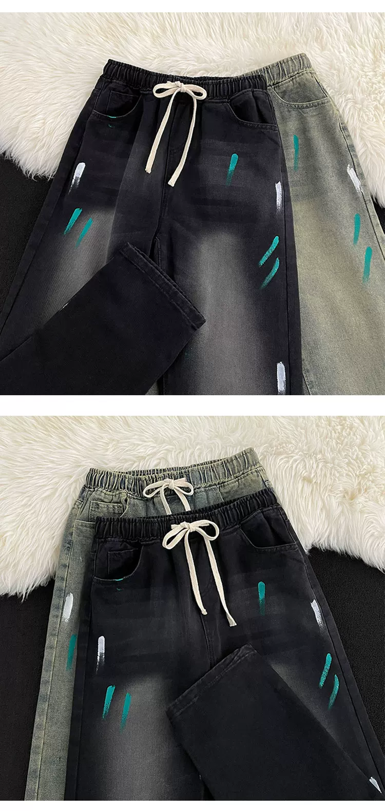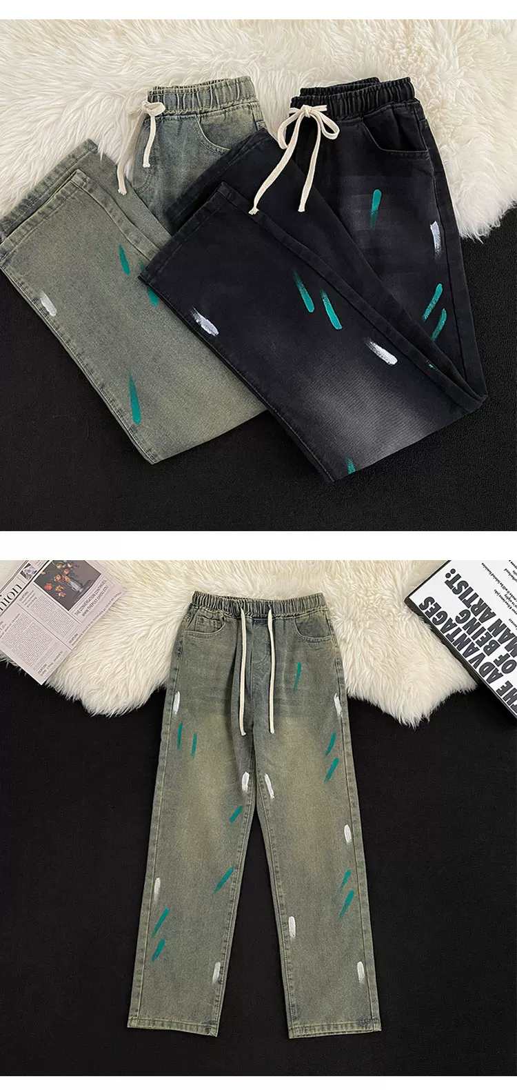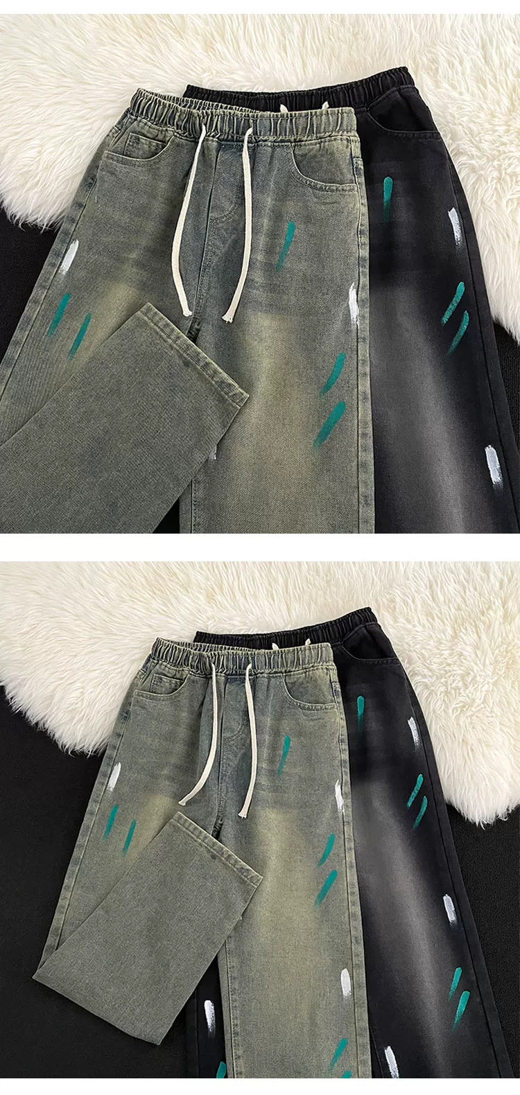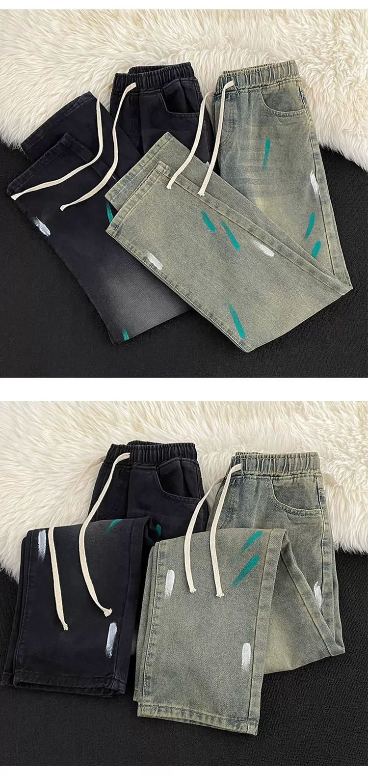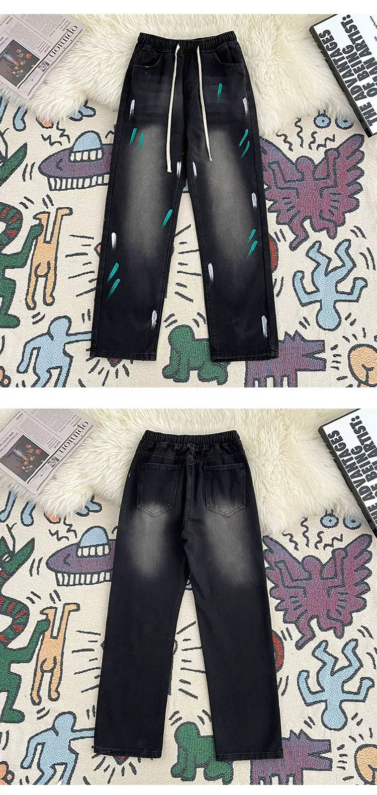 Quần jeans nam họa tiết graffiti cá tính, quần ống đứng dây rút đa năng, quần ống rộng dáng suông phong cách Mỹ thời thượng thu đông.