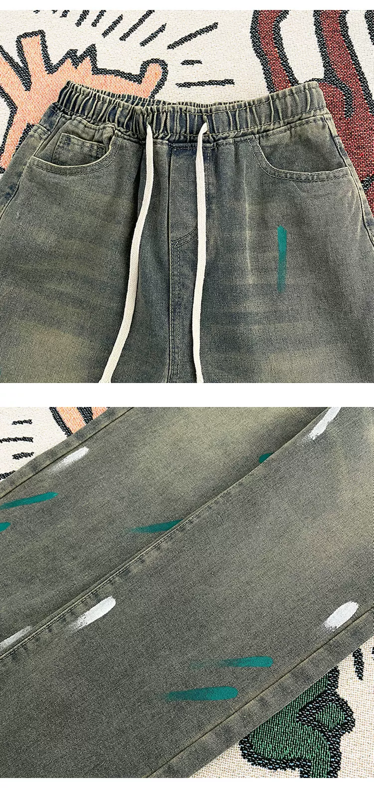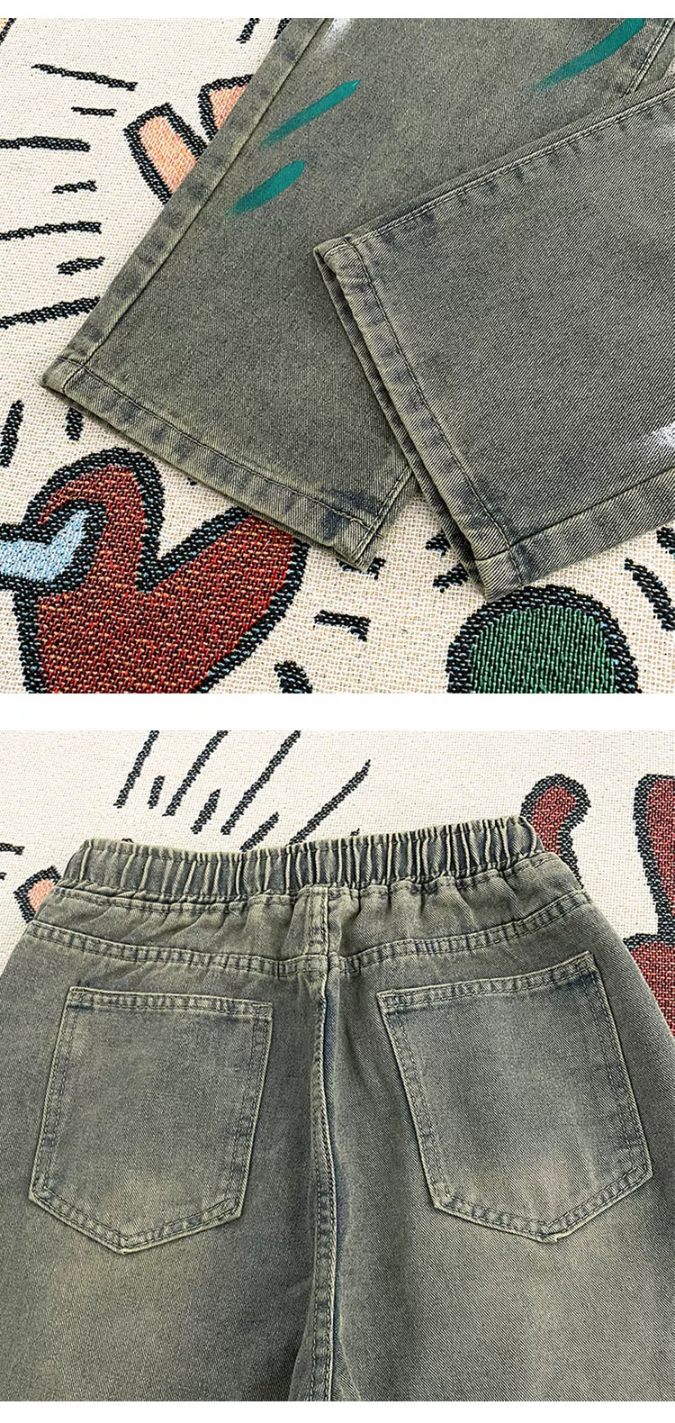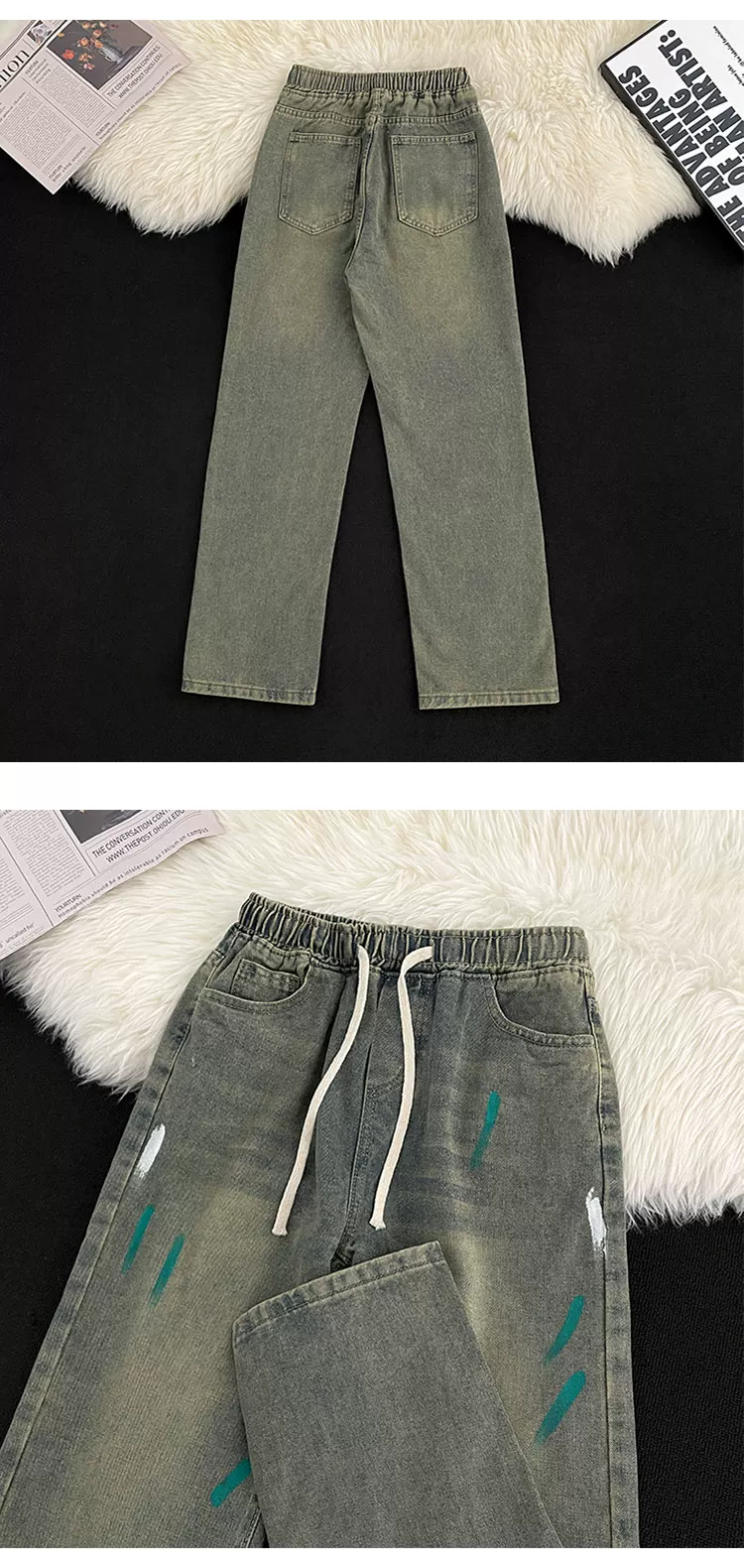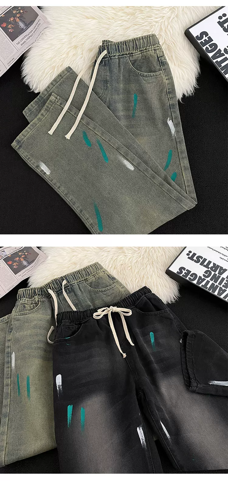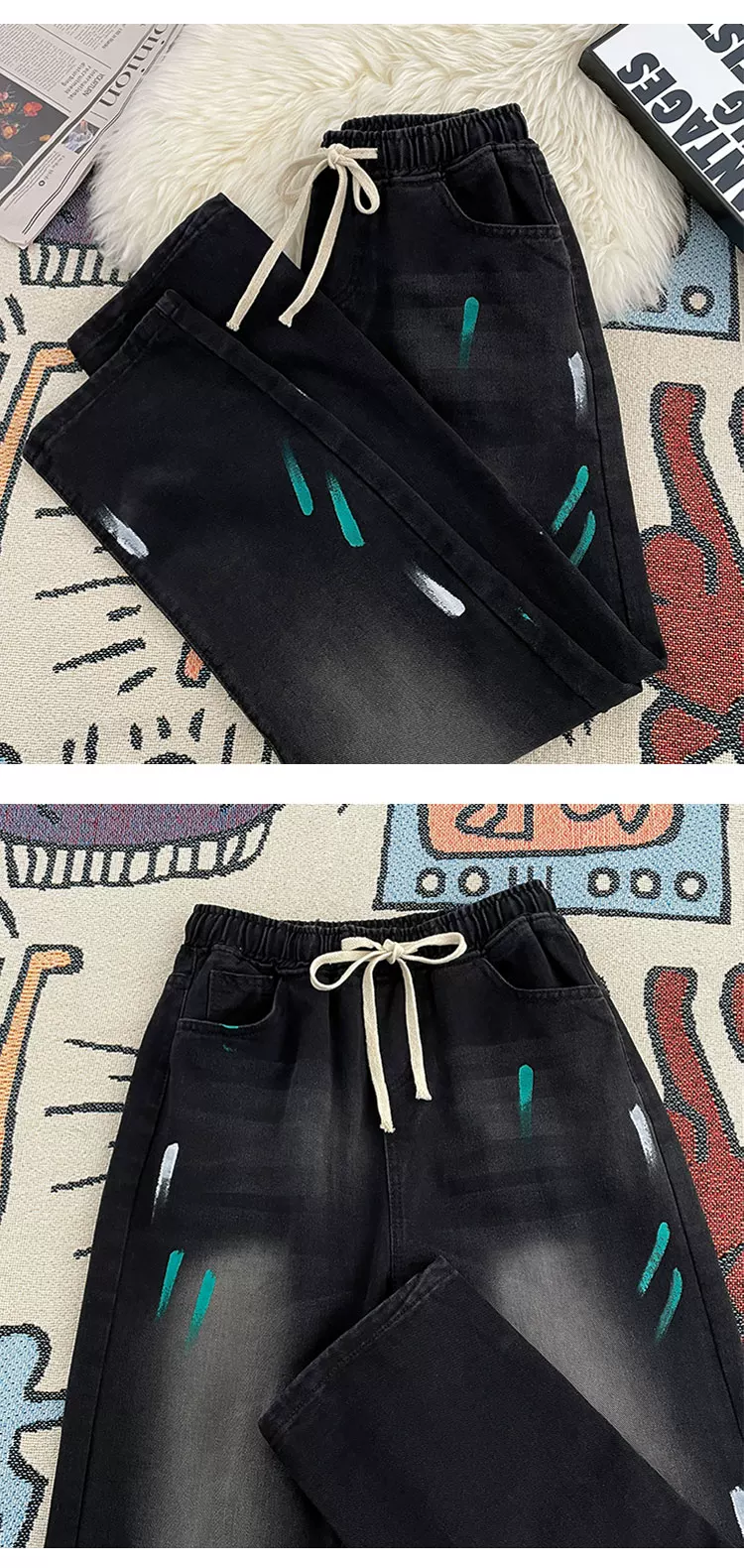 - Quần jeans nam họa tiết graffiti cá tính, quần ống đứng dây rút đa năng, quần ống rộng dáng suông phong cách Mỹ thời thượng thu đông.