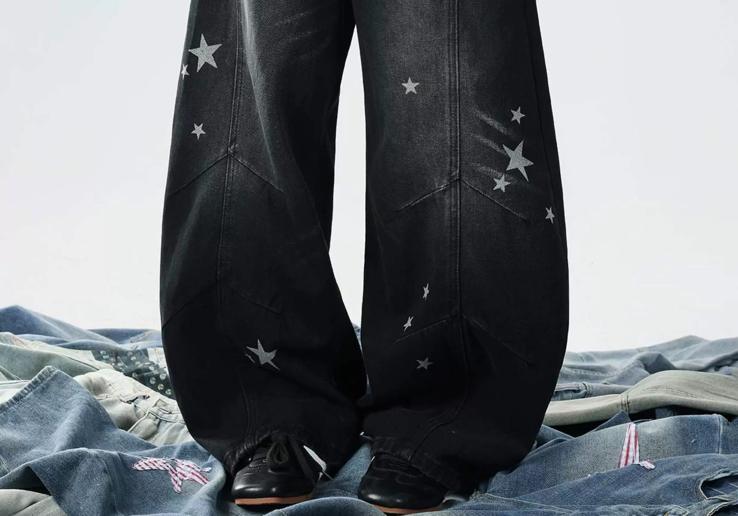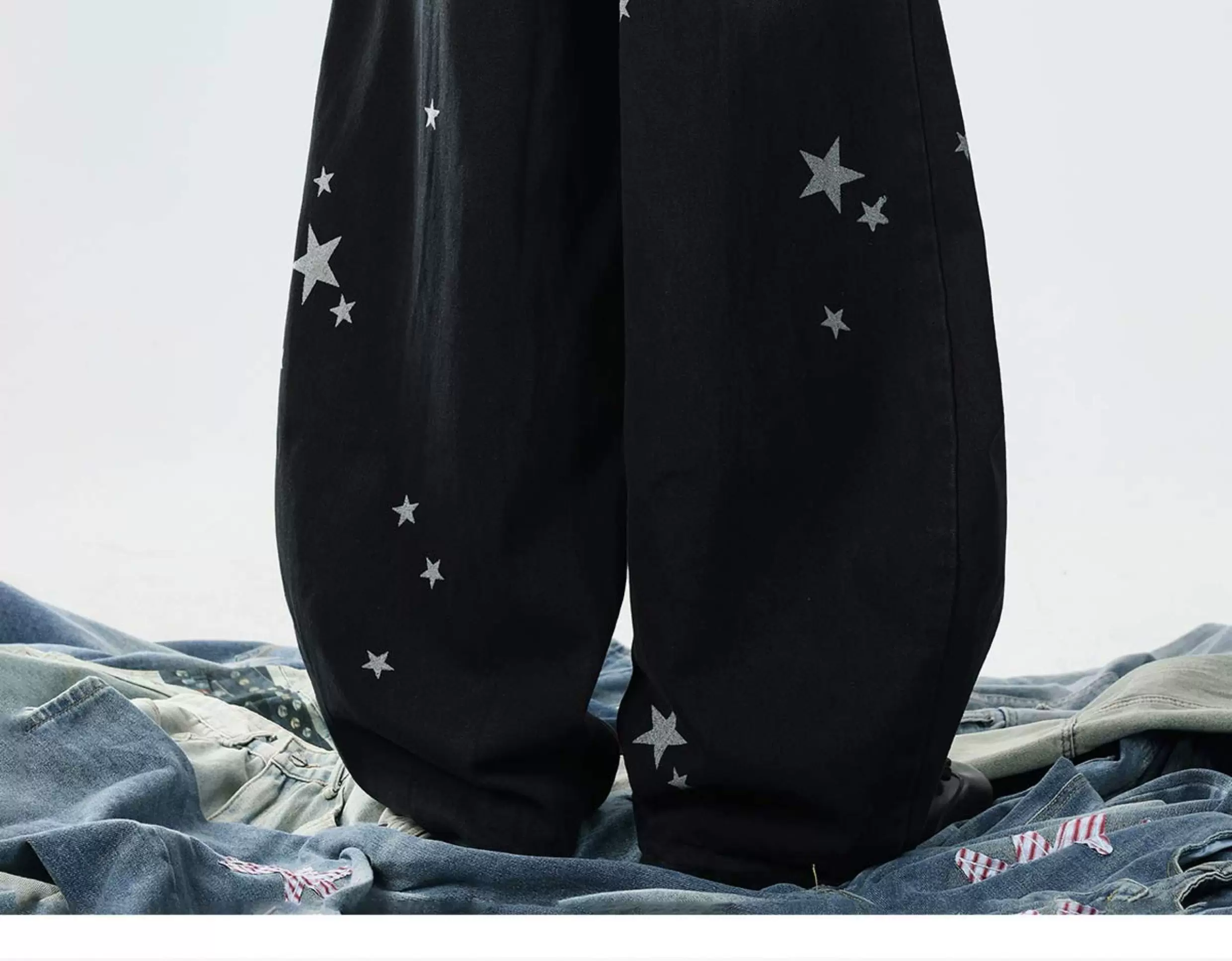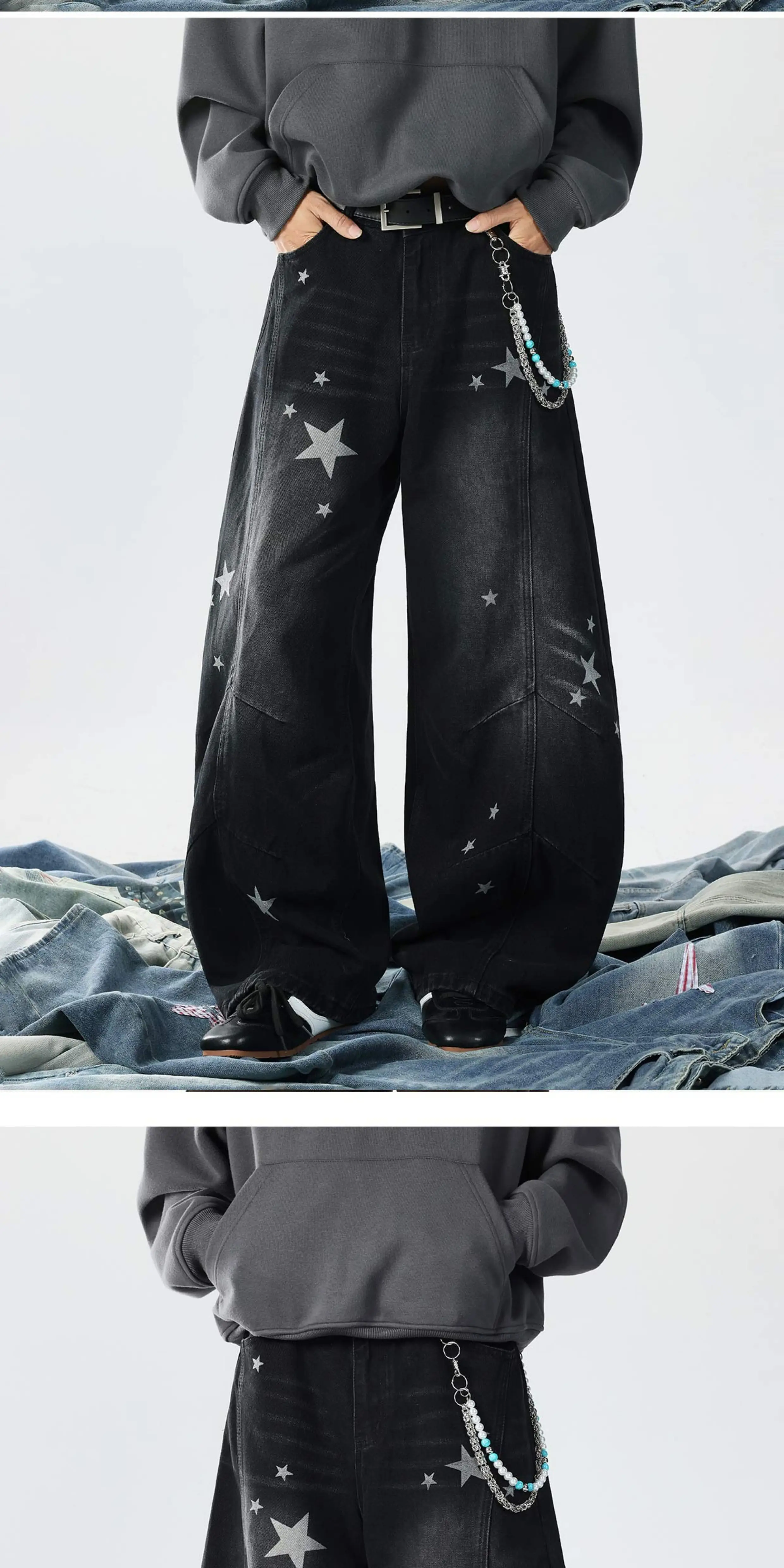 - Quần jeans nam kiểu scimitar đã qua xử lý, quần ống rộng in họa tiết sao thời thượng mùa thu, quần ống đứng kiểu Mỹ retro phá cách.