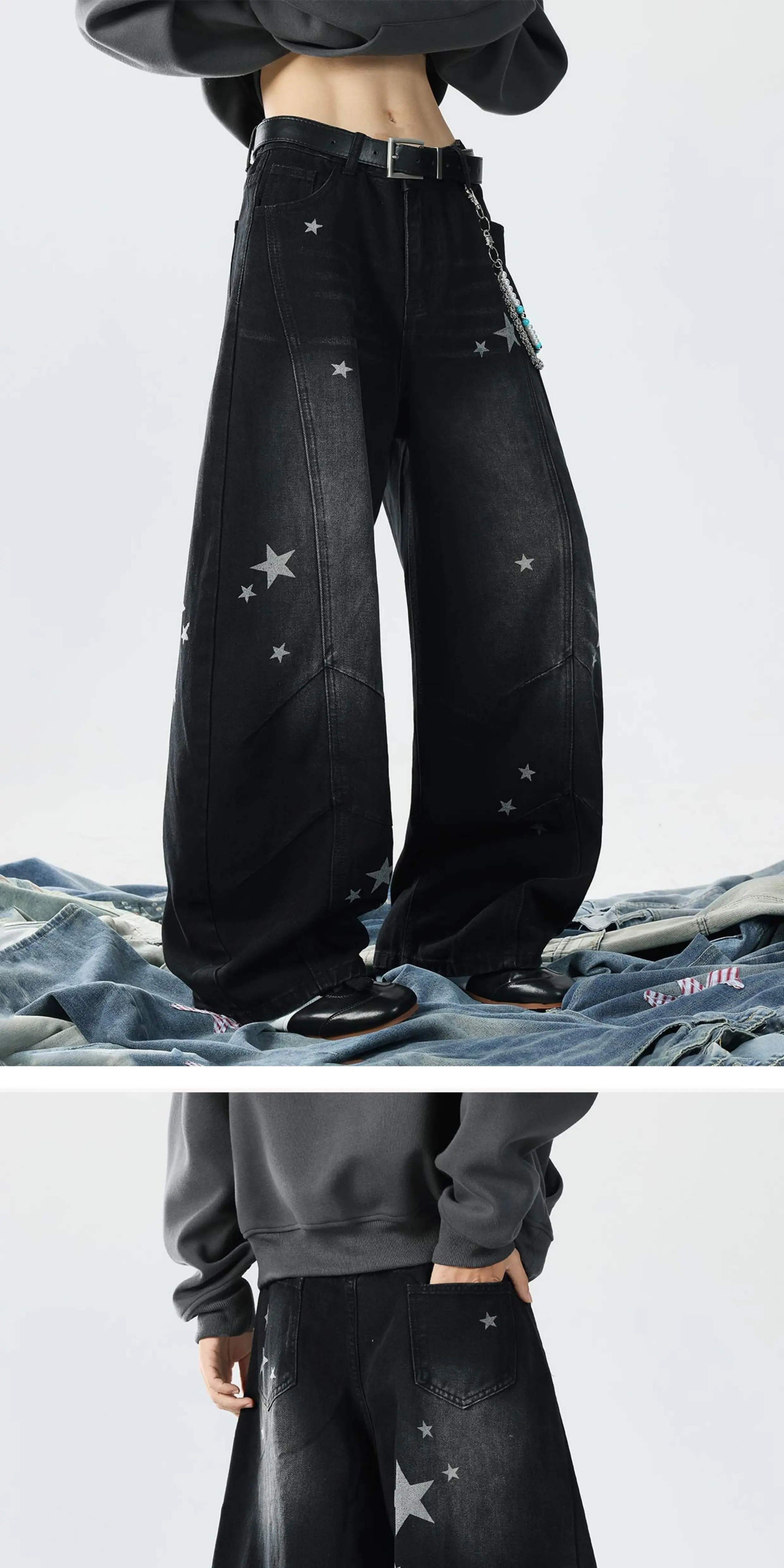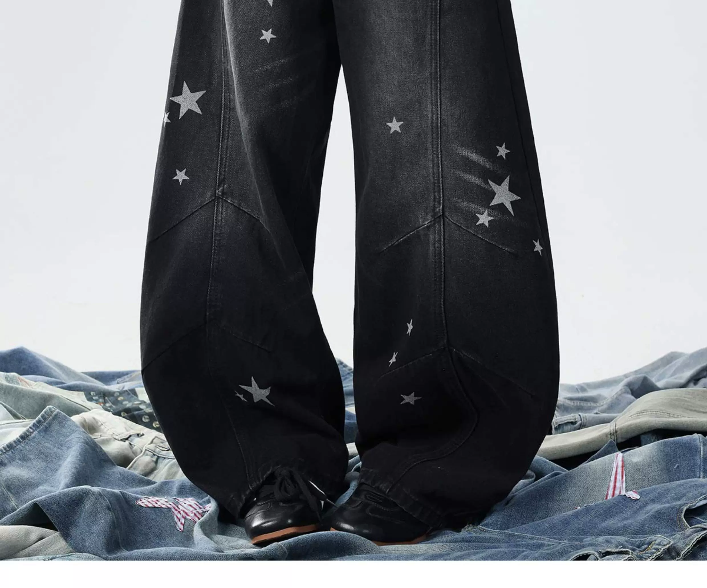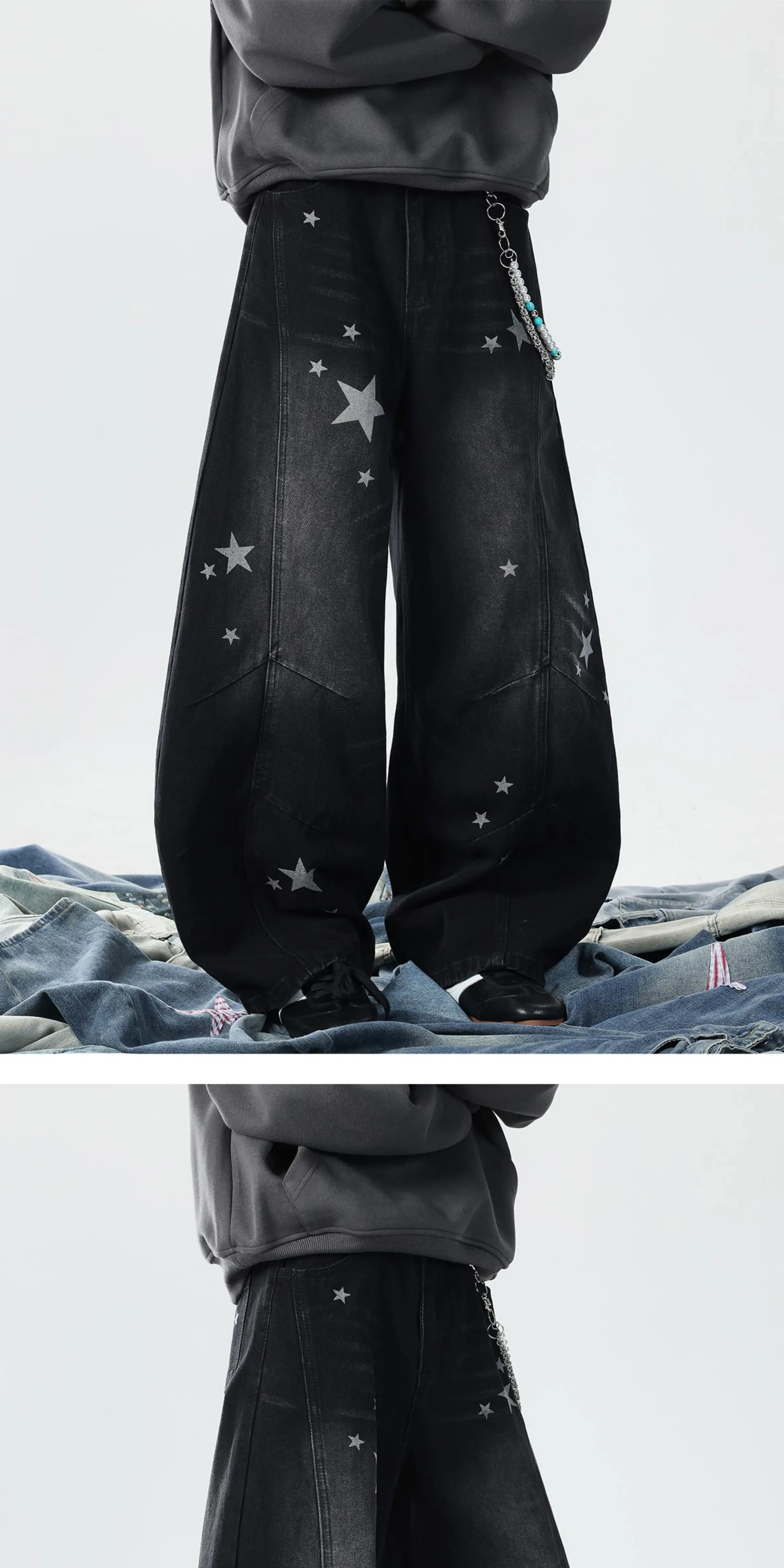 Quần jeans nam kiểu scimitar đã qua xử lý, quần ống rộng in họa tiết sao thời thượng mùa thu, quần ống đứng kiểu Mỹ retro phá cách.
