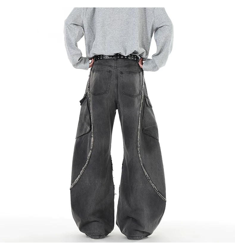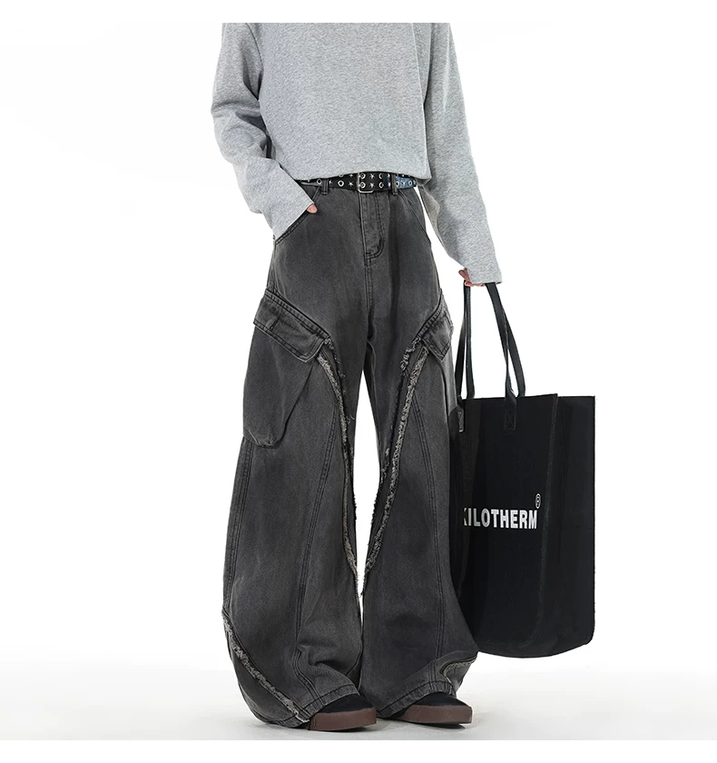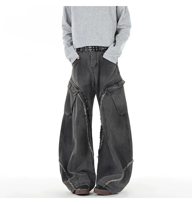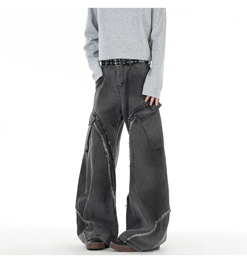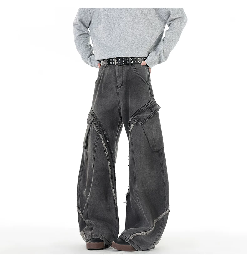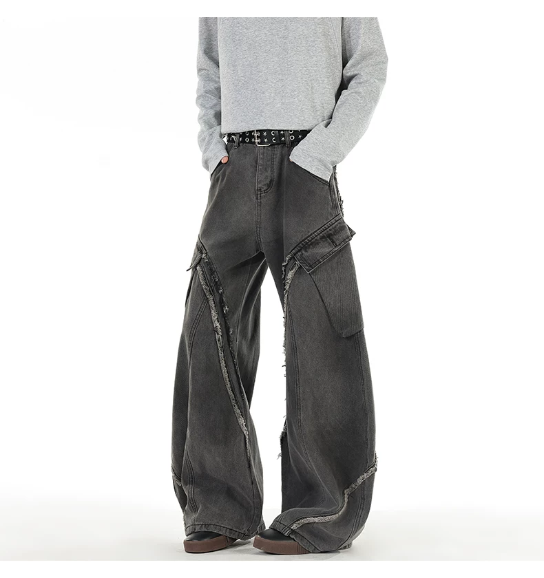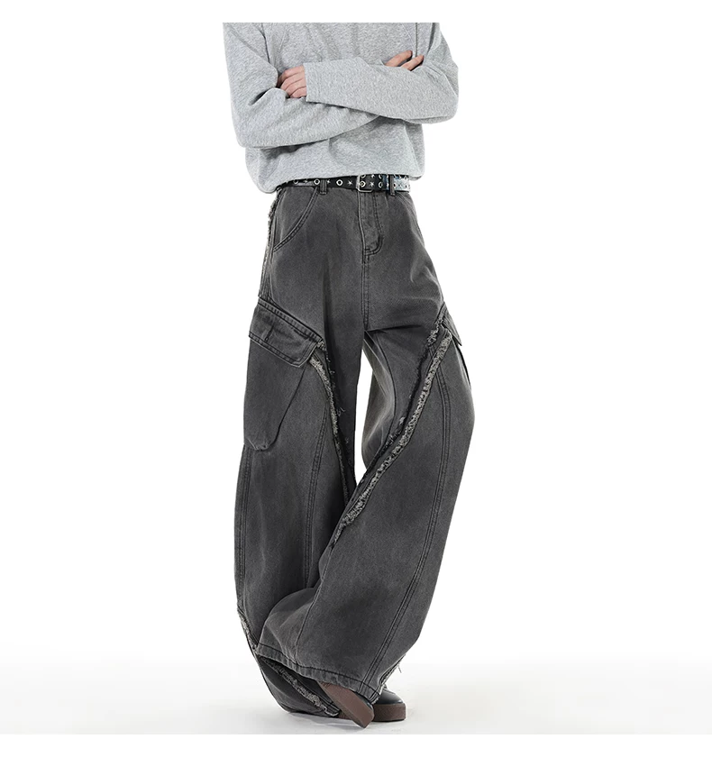 Quần jeans nam phối vải thô, kiểu dáng thu mới, dáng rộng, túi lớn, quần ống rộng thiết kế độc đáo, quần ống đứng chất liệu dày dặn.