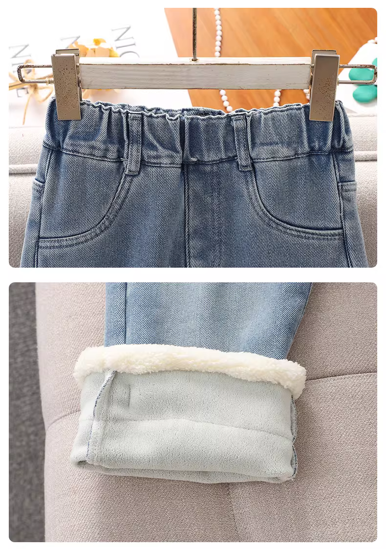 - Quần jeans nữ bé gái mùa đông 2025 kiểu mới, quần ống rộng lót lông dày giữ ấm cho bé gái lớn, quần ống đứng lót lông liền thân