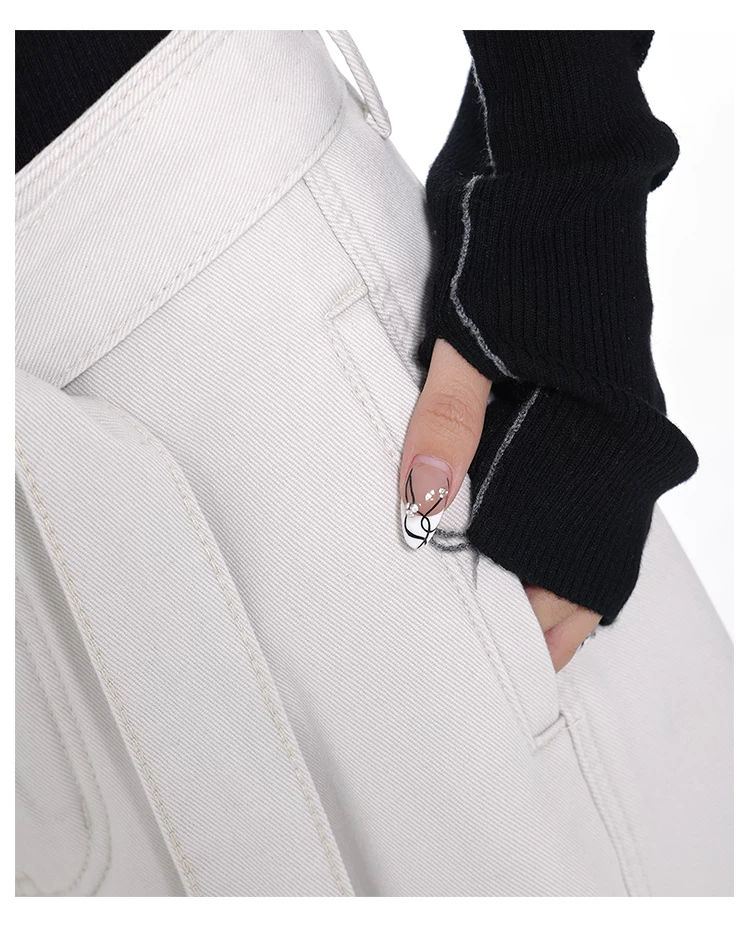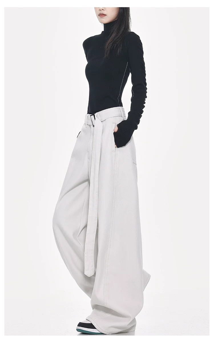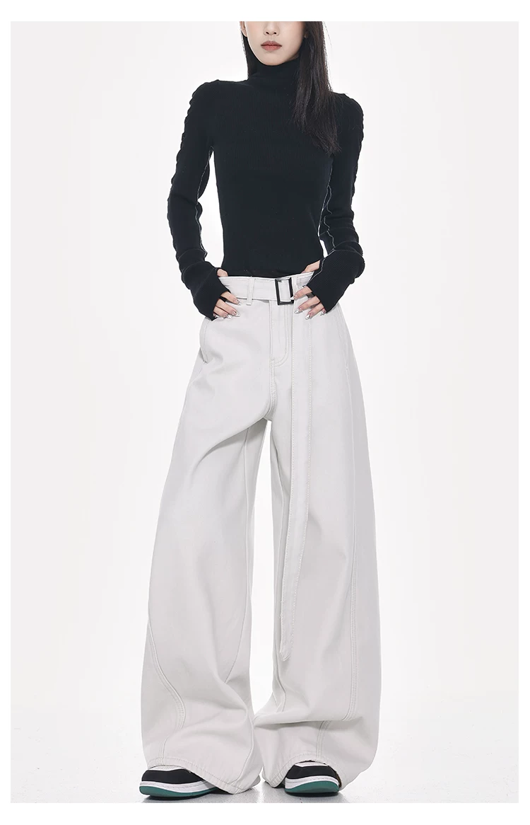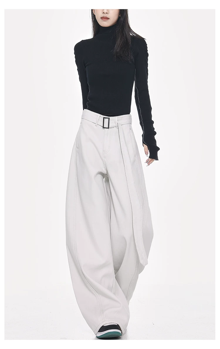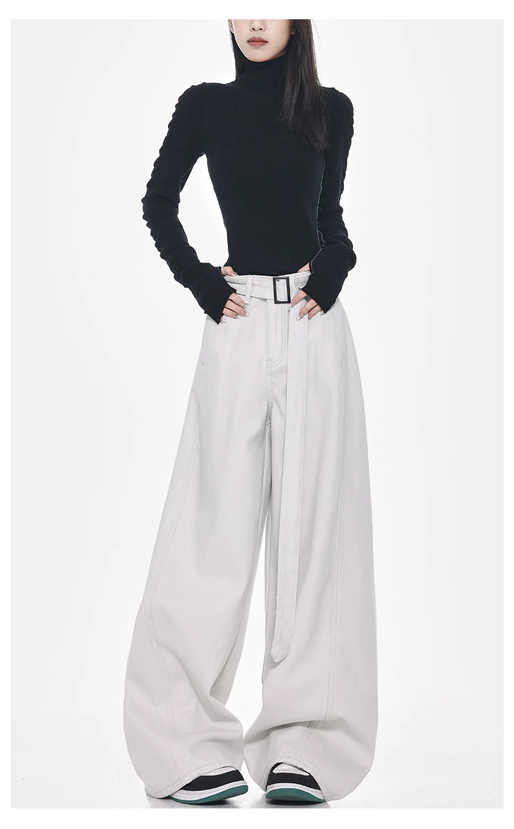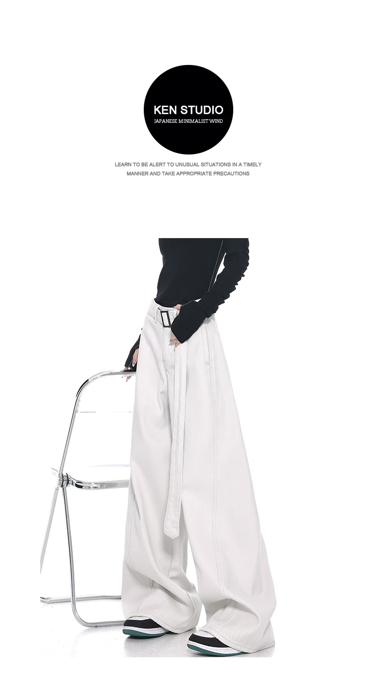 Quần jeans ống đứng thiết kế thắt lưng trắng kiểu mới Xuân Thu của KEN STUDIO dành cho nữ, cạp cao, dáng rộng, tôn dáng
