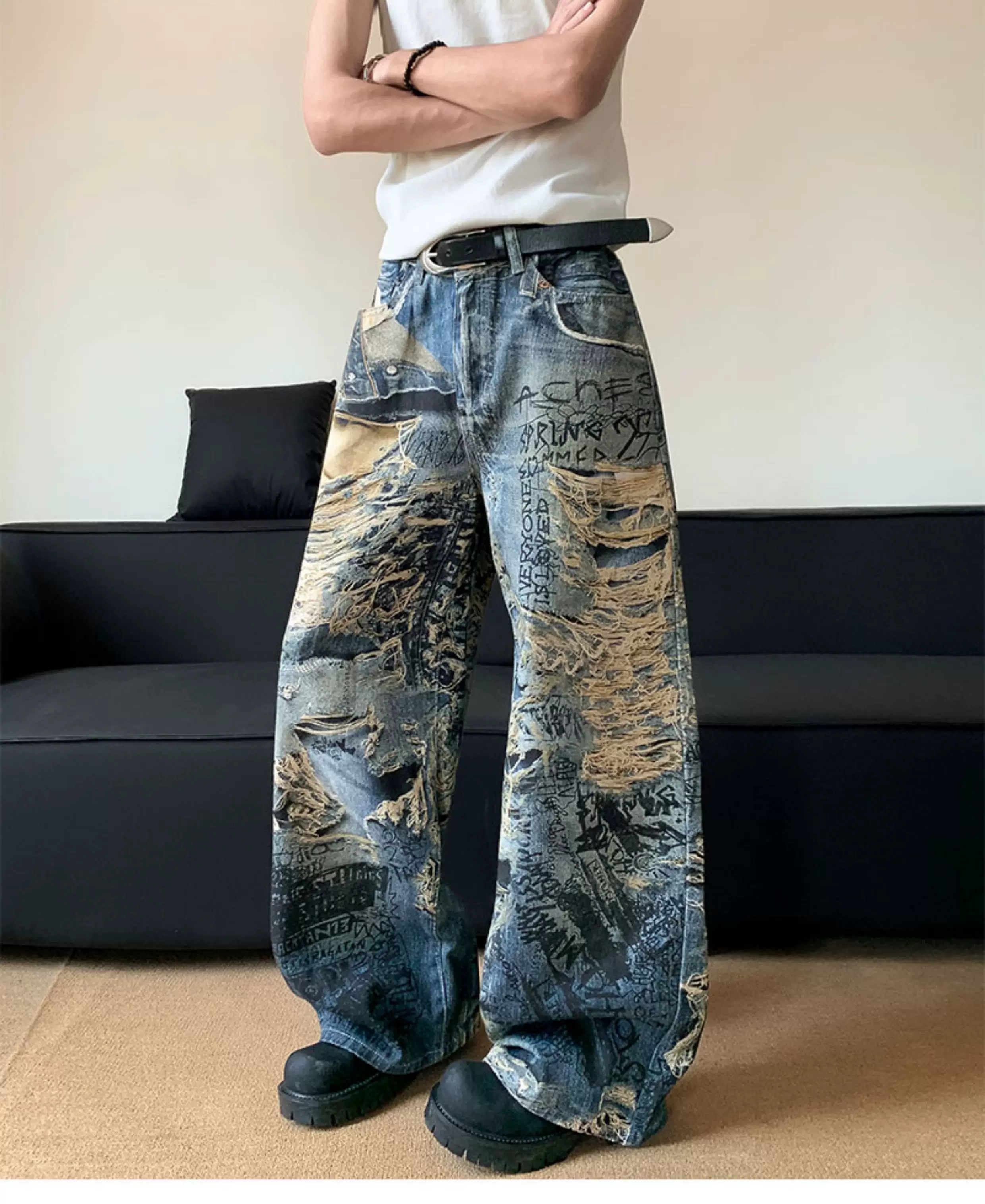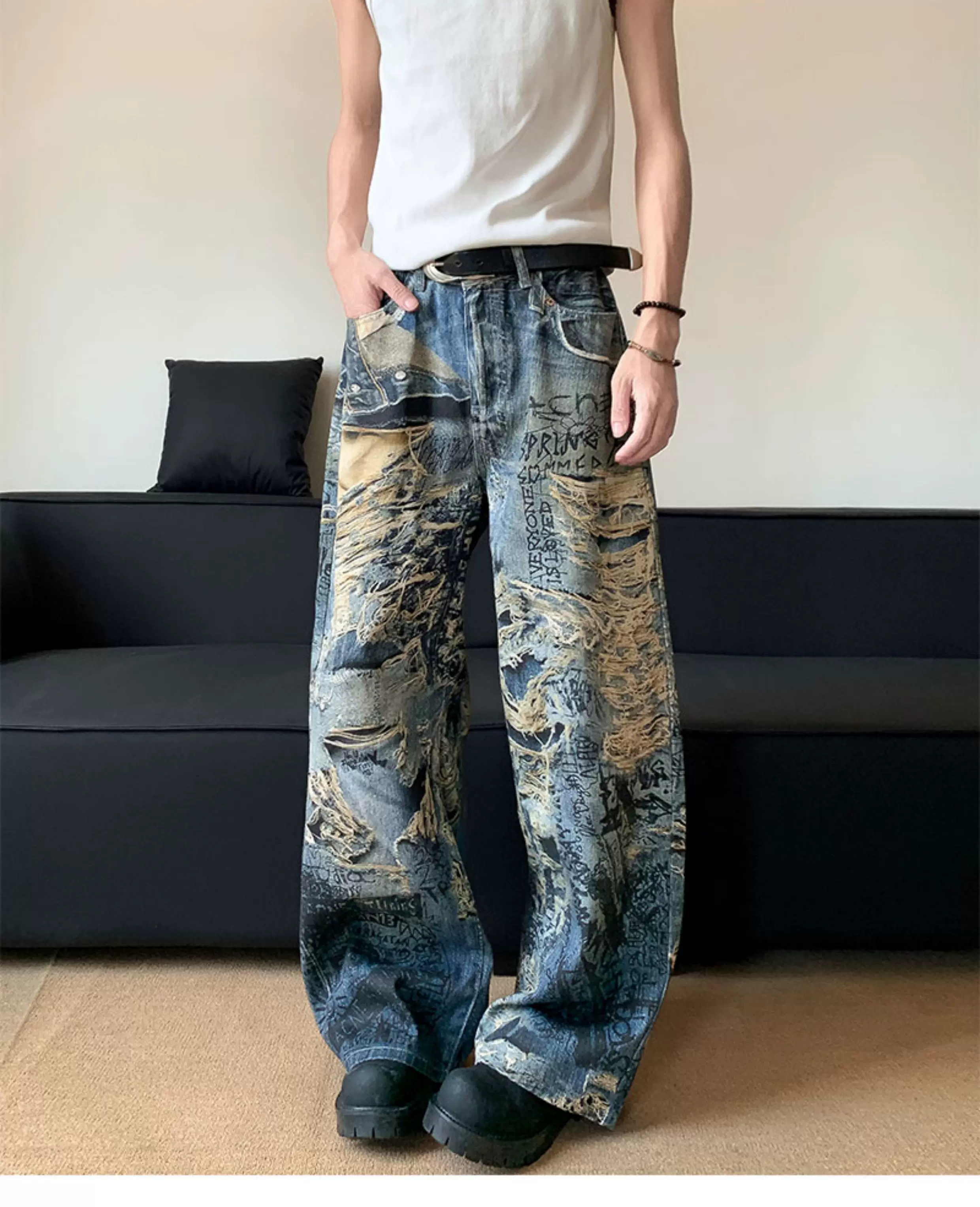 - Quần jeans rách thiết kế thời trang nam nữ, phong cách Mỹ, thương hiệu trendy, quần ống đứng rộng rãi, quần dài chạm đất họa tiết graffiti mùa hè mát mẻ.