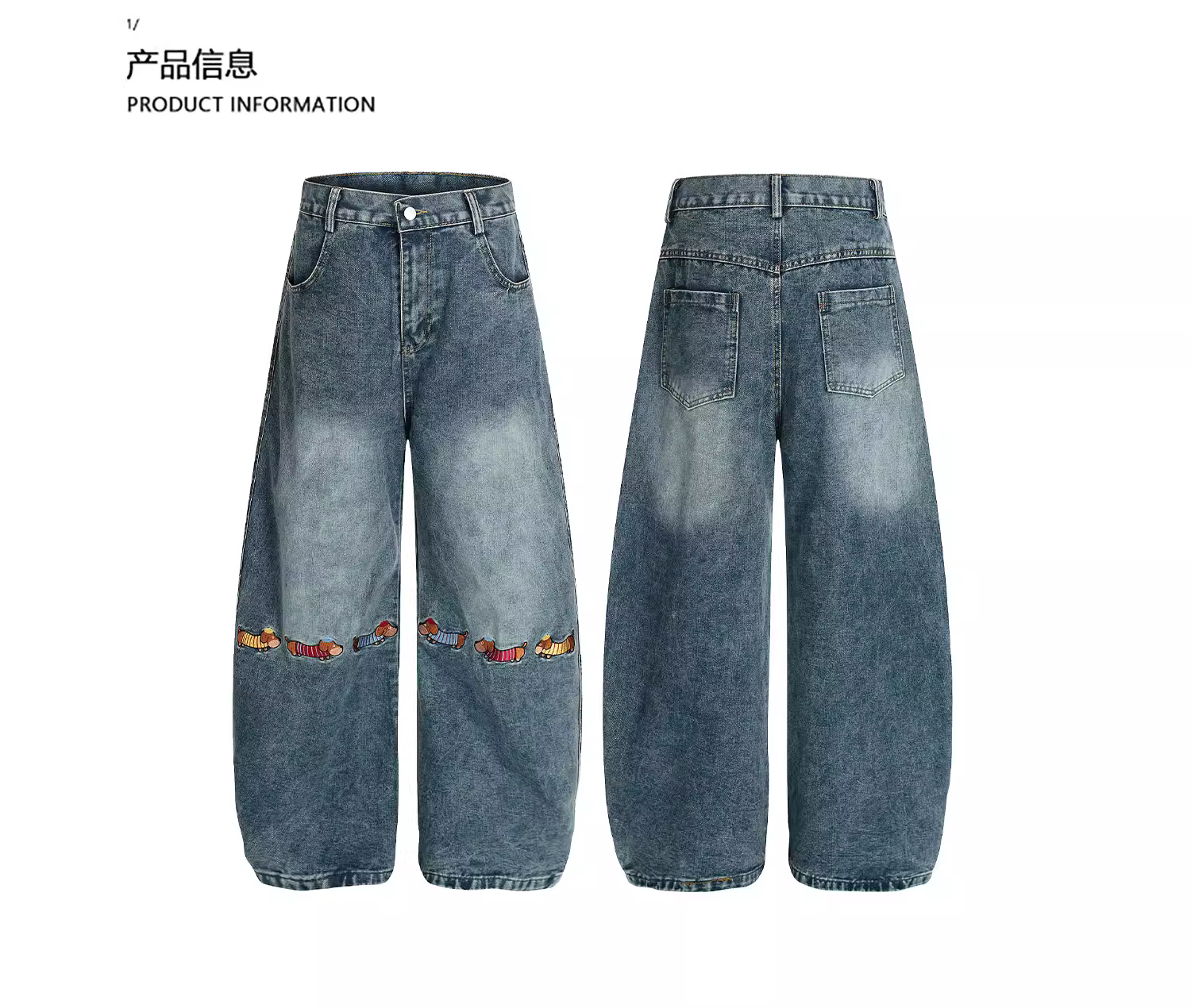 - Quần jeans thêu hình chó dachshund kiểu Mỹ cổ điển K787, unisex, dáng rộng, cạp cao, thời trang, ống rộng