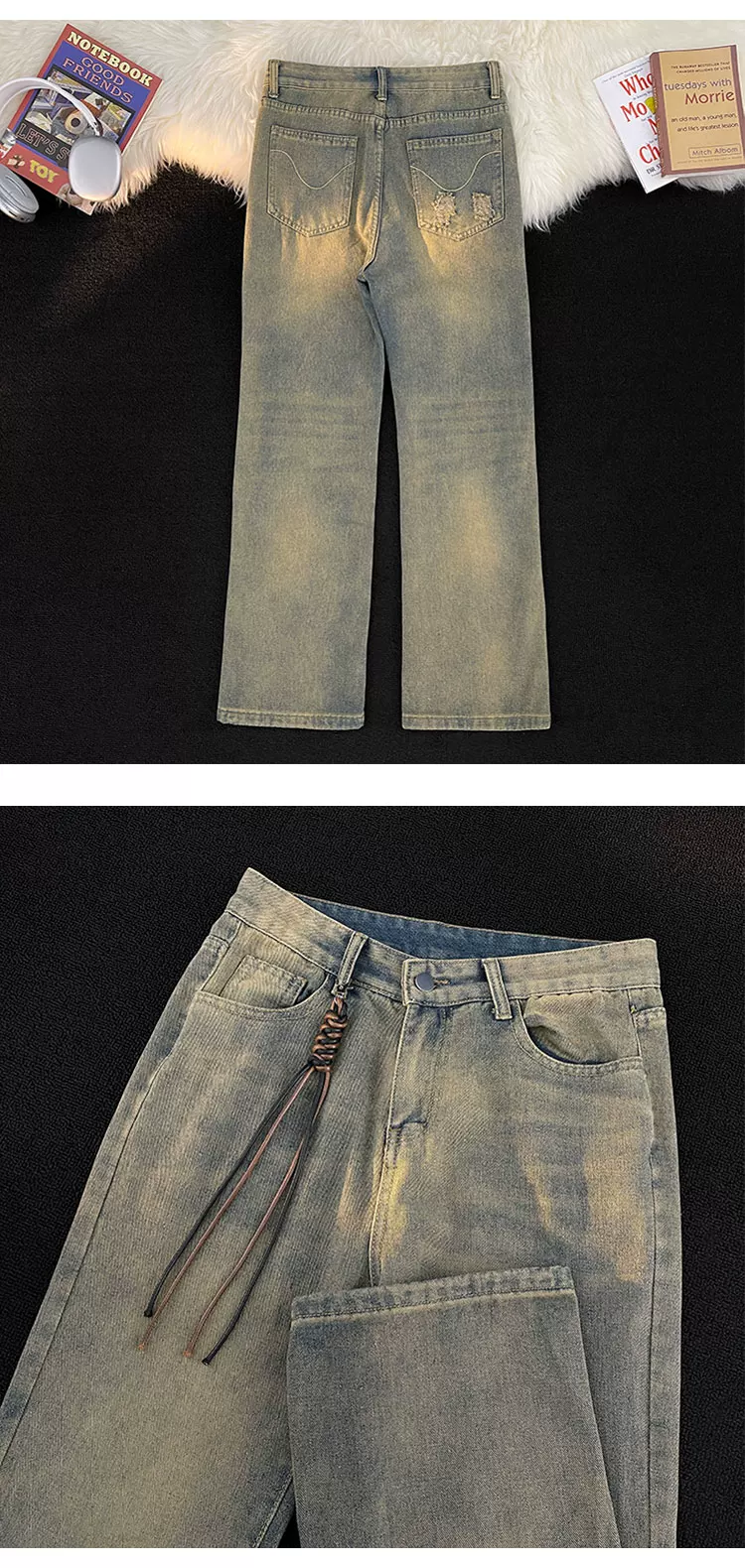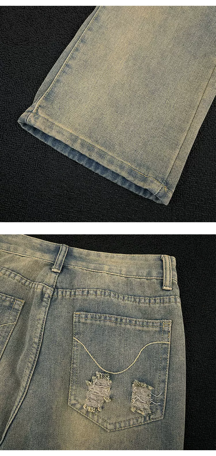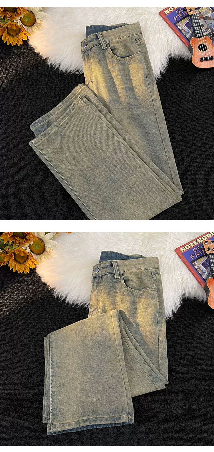 - Quần jeans thiết kế phong cách INS mùa xuân dành cho nam, quần ống loe retro Mỹ, quần dài ống rộng vintage thời thượng.