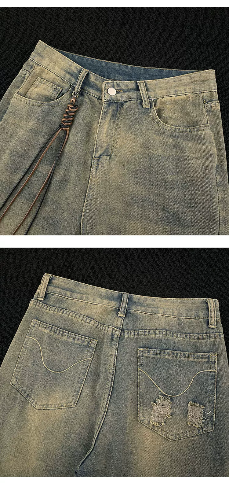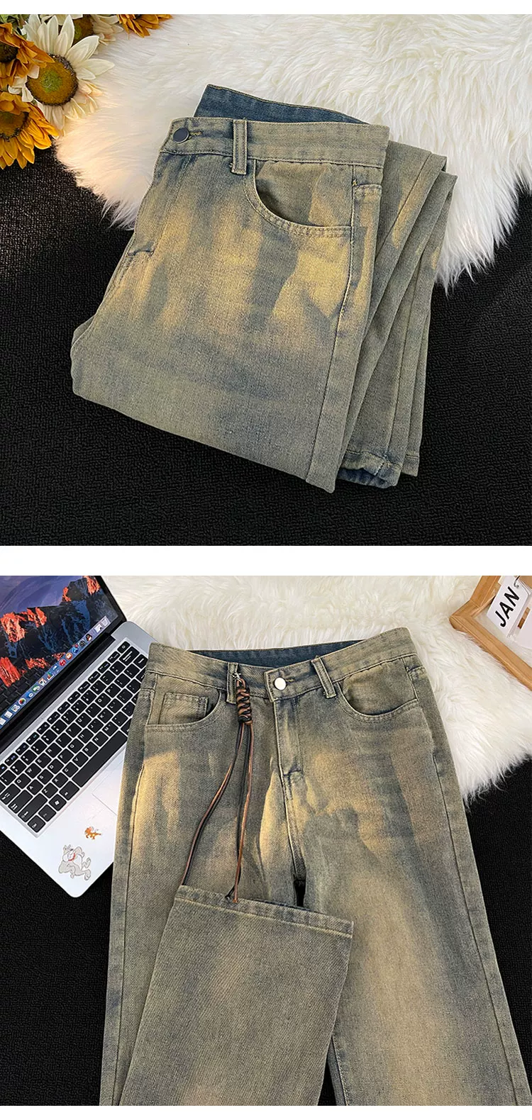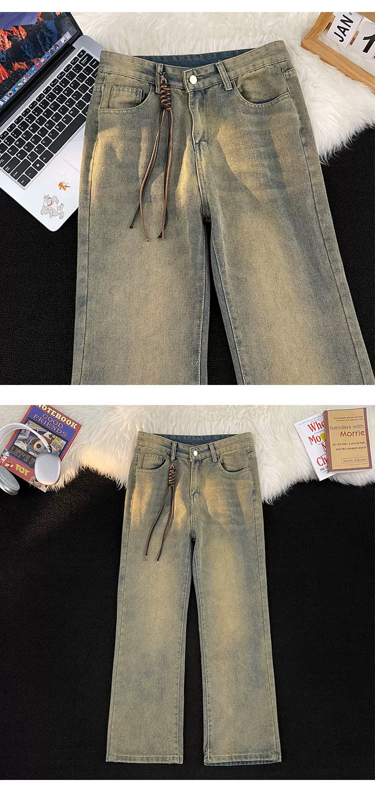 - Quần jeans thiết kế phong cách INS mùa xuân dành cho nam, quần ống loe retro Mỹ, quần dài ống rộng vintage thời thượng.