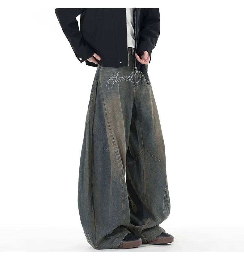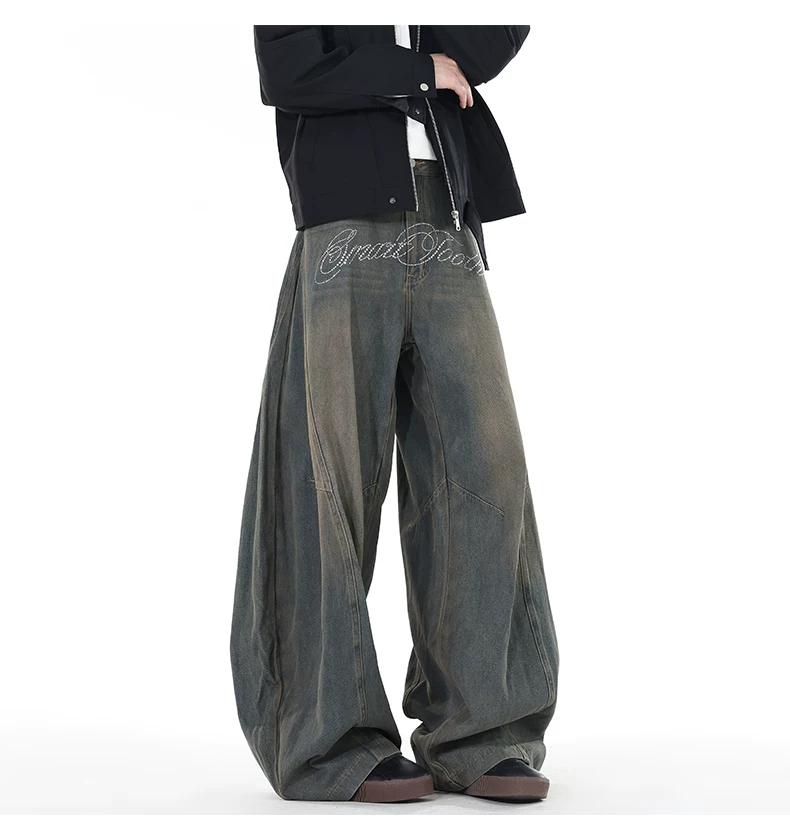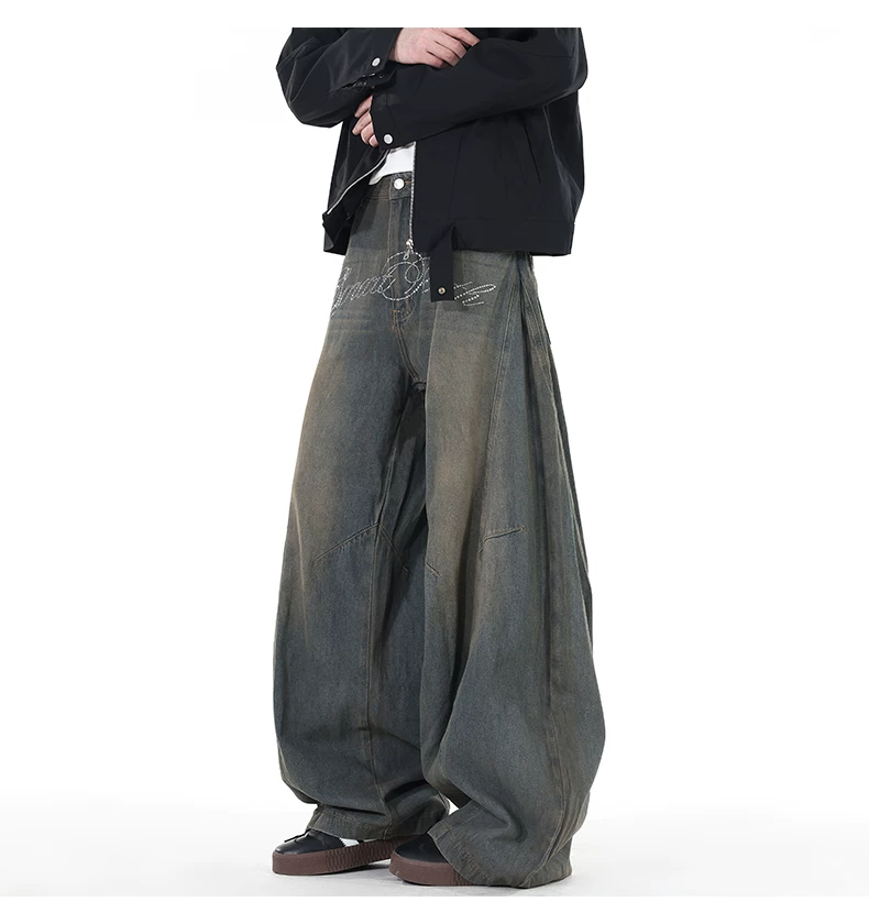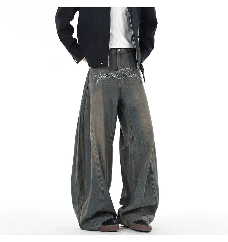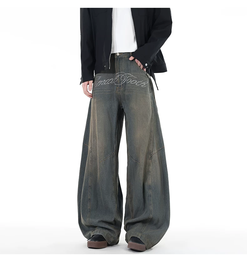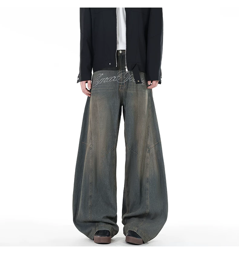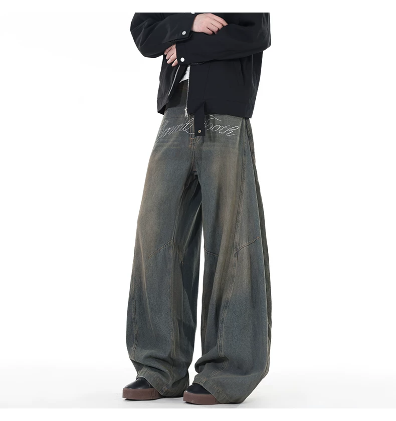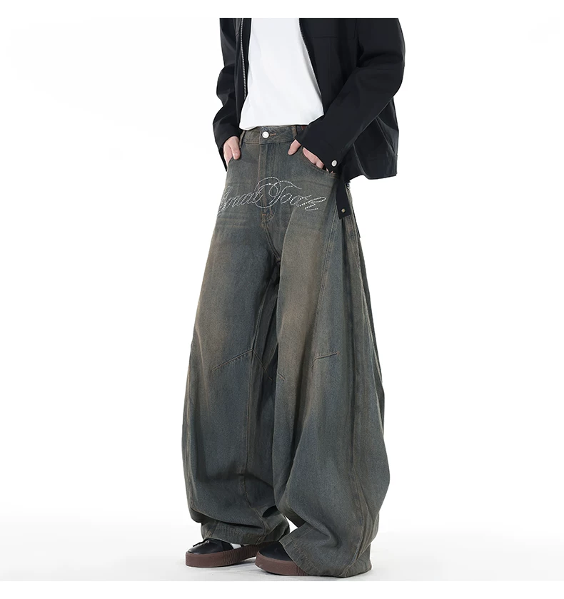 Quần jeans viền cong đính đá, quần dài ống đứng rách gối phong cách thu đông, quần ống rộng retro Mỹ dành cho nam.