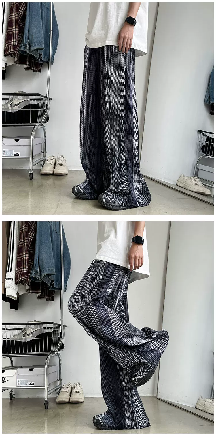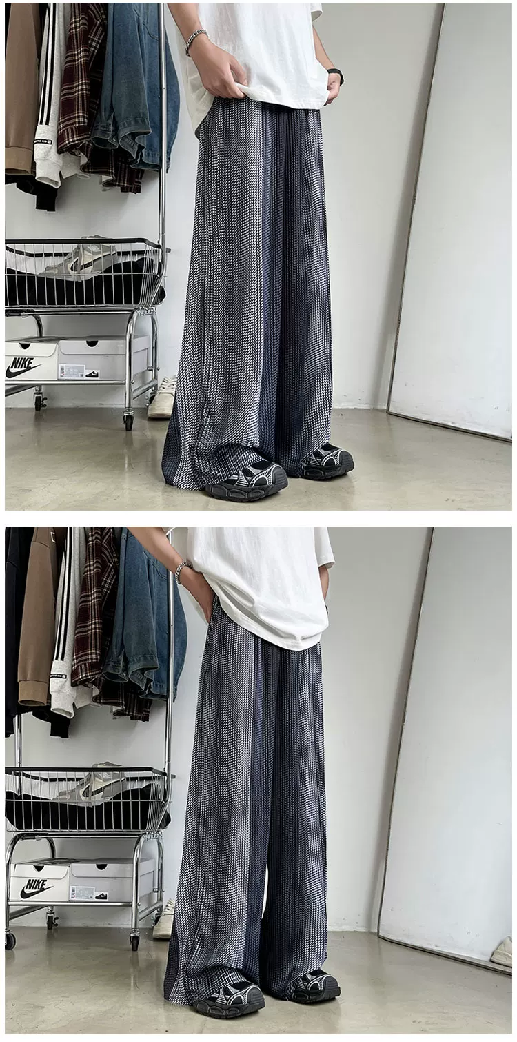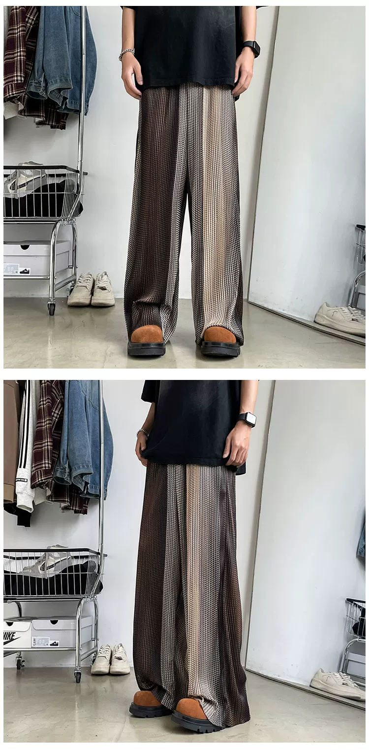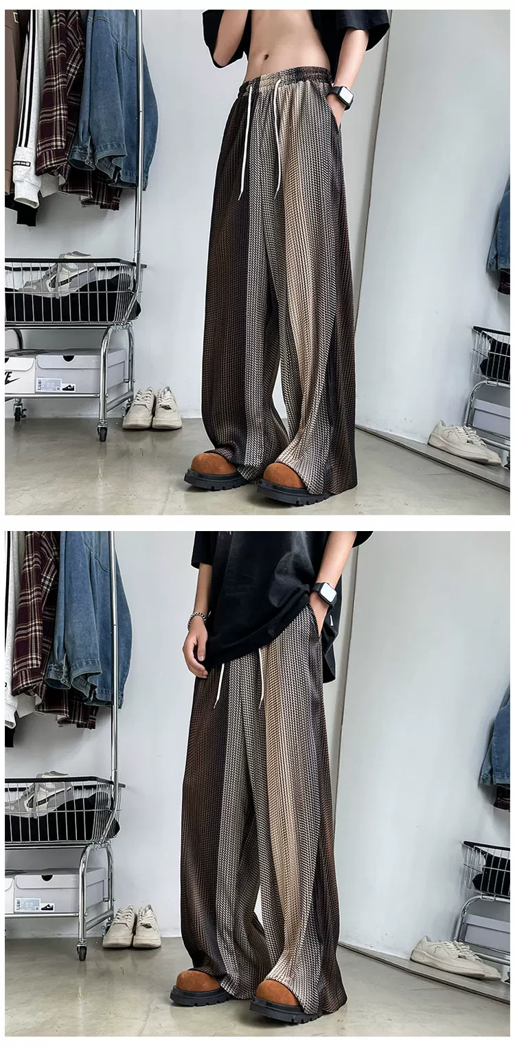 Quần lụa băng xếp ly phối màu dành cho nam, quần cặp đôi phong cách hip-hop Mỹ thời thượng, quần ống rộng suông dài chạm đất mặc mùa hè.
