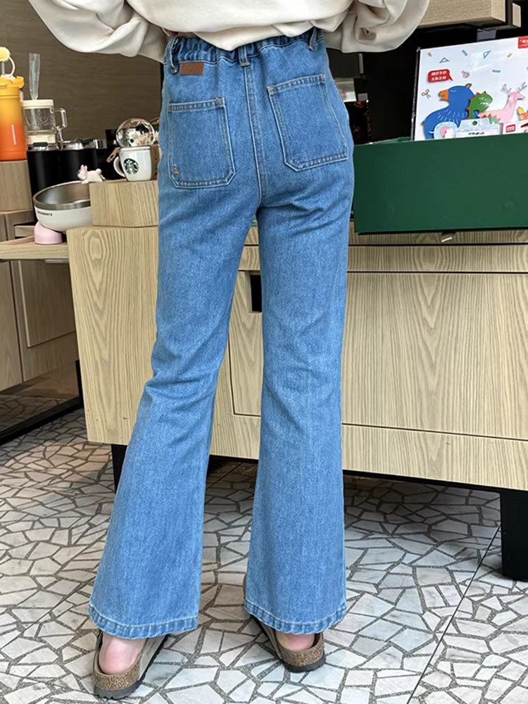 Quần nữ bé gái xuân hè 2025 kiểu dáng mới, quần loe cho trẻ lớn, chất liệu co giãn, tôn dáng, quần denim mỏng, quần trẻ em mặc thường ngày
