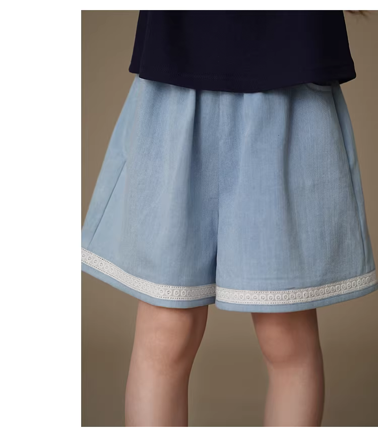 Quần ống rộng mùa hè cho bé gái, quần short denim viền ren, quần rộng rãi, thoải mái.